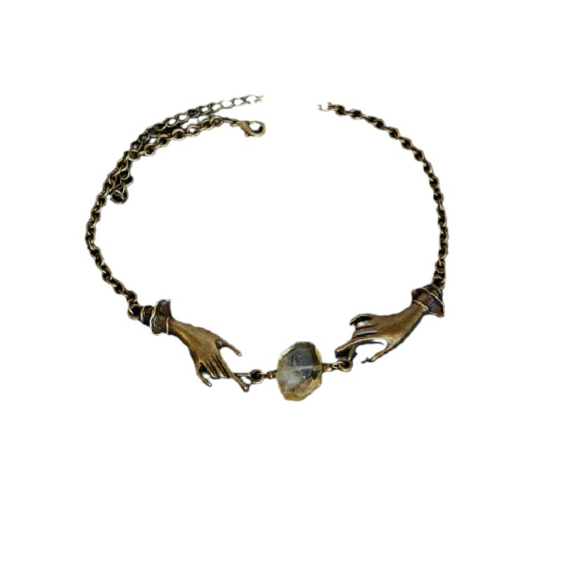 This necklace features a chic combination of bronze hands and a yellow lemon stone, bringing a touch of elegance and uniqueness to any outfit. Perfect for gifting or personal wear, it combines fashion with artistic flair.