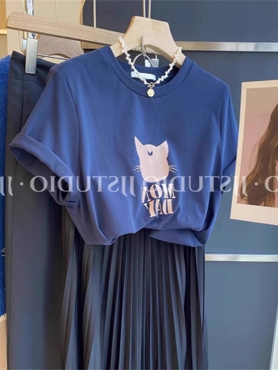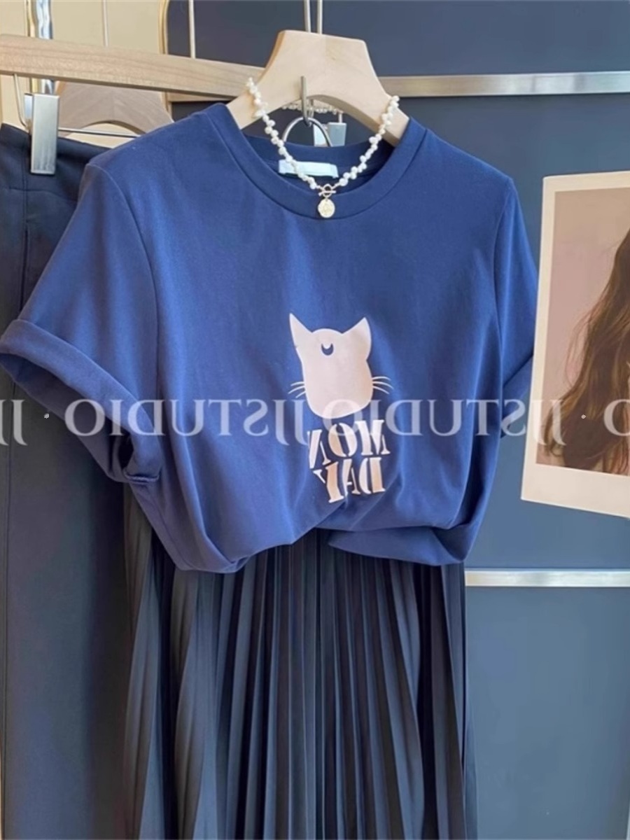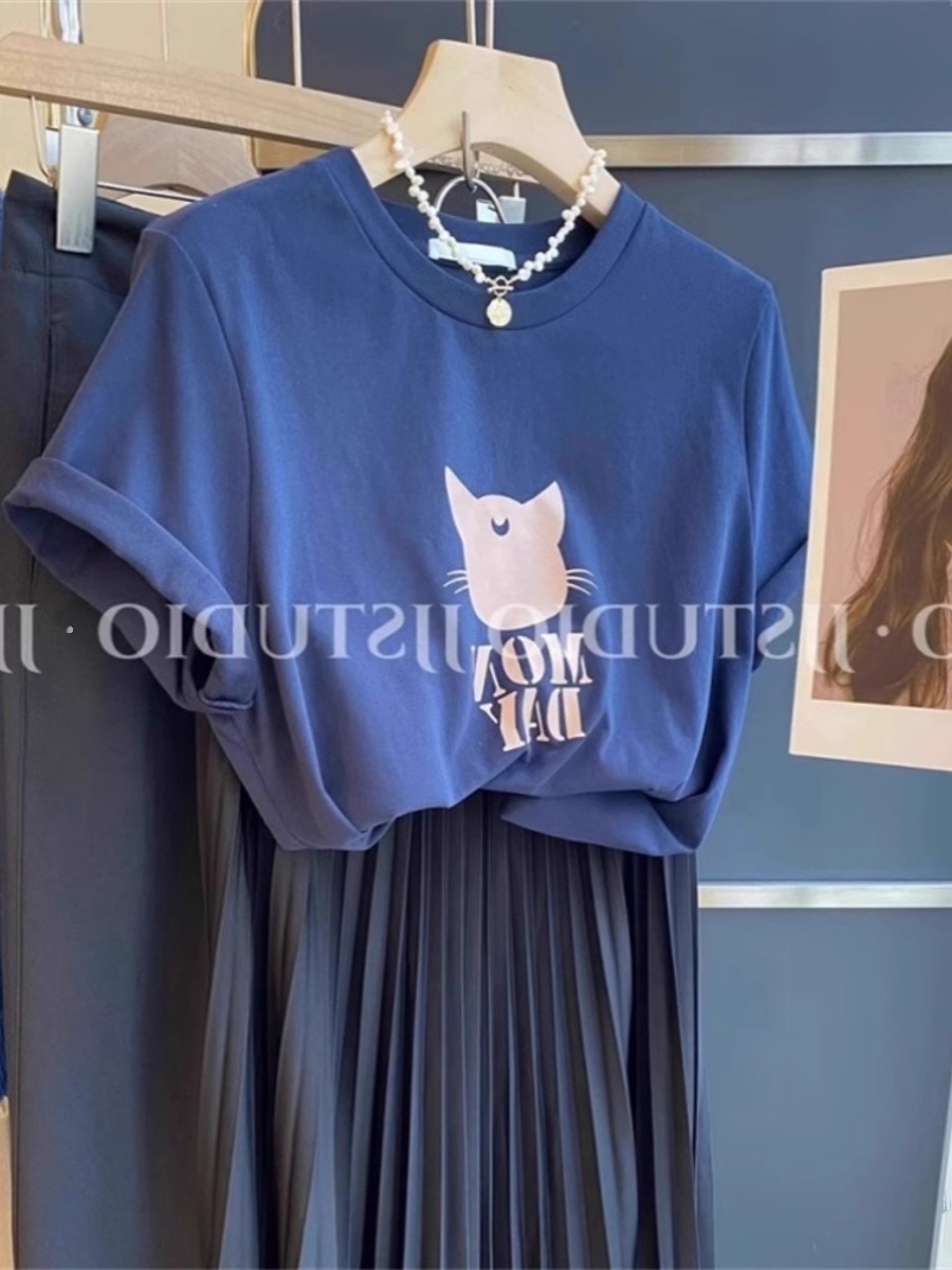 Cartoon Cat Printing Navy Blue Short Sleeve Shoulder T-Shirt Women's Half Sleeve Stylish Niche Loose Petite Top