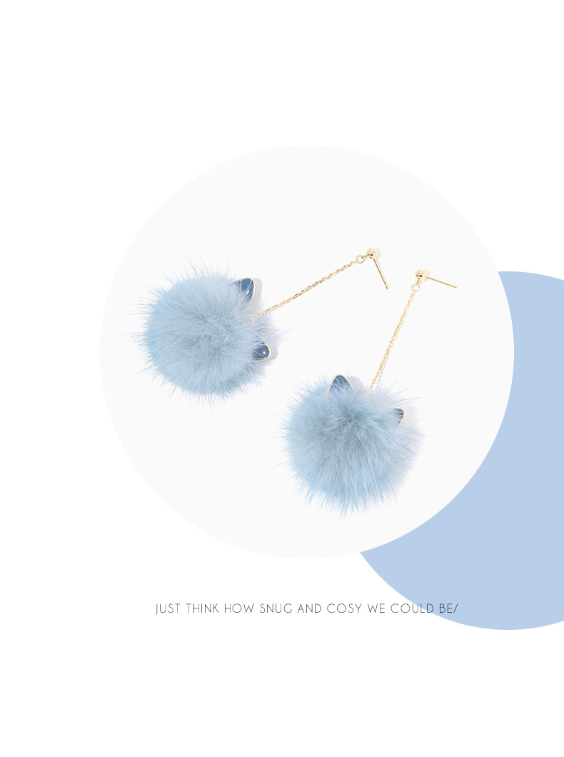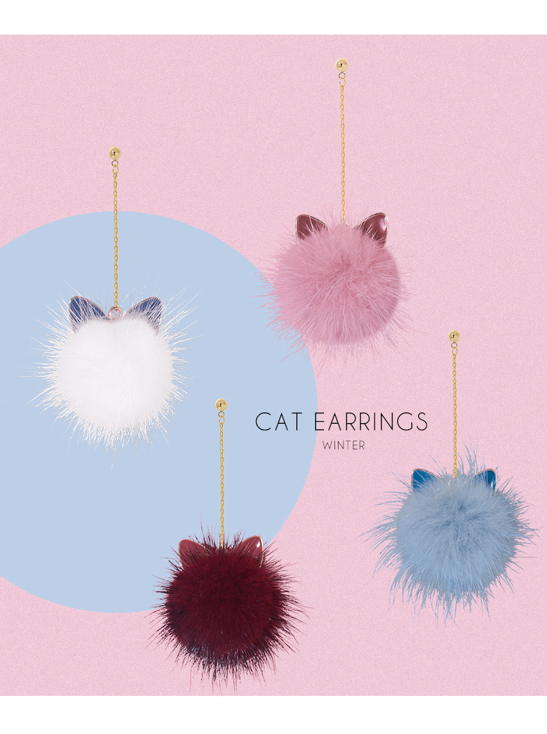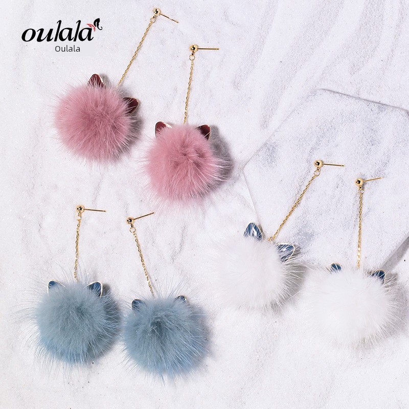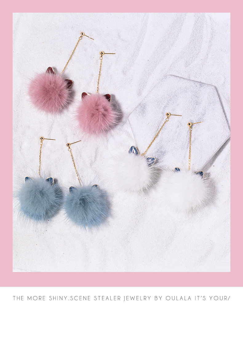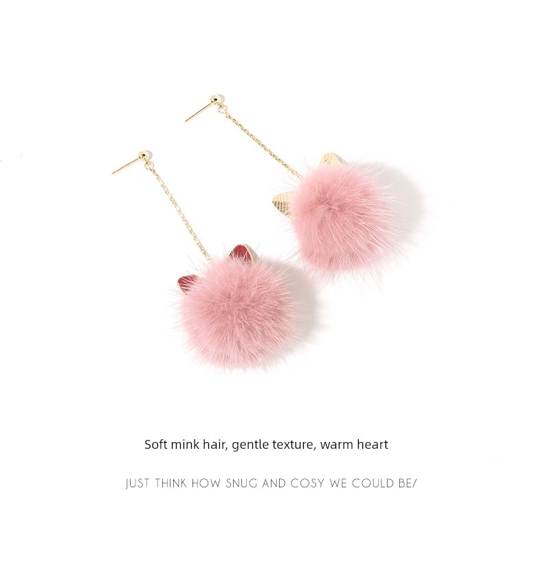Cat Ears Mink Fur Ball Earrings Female Elegant South Korea Stylish All-Matching Long Winter Furry Earrings Ball Earrings