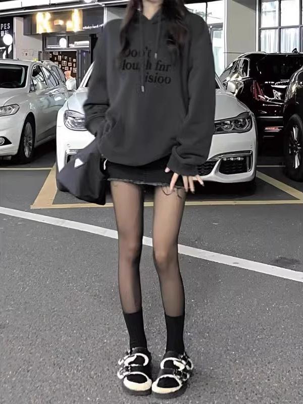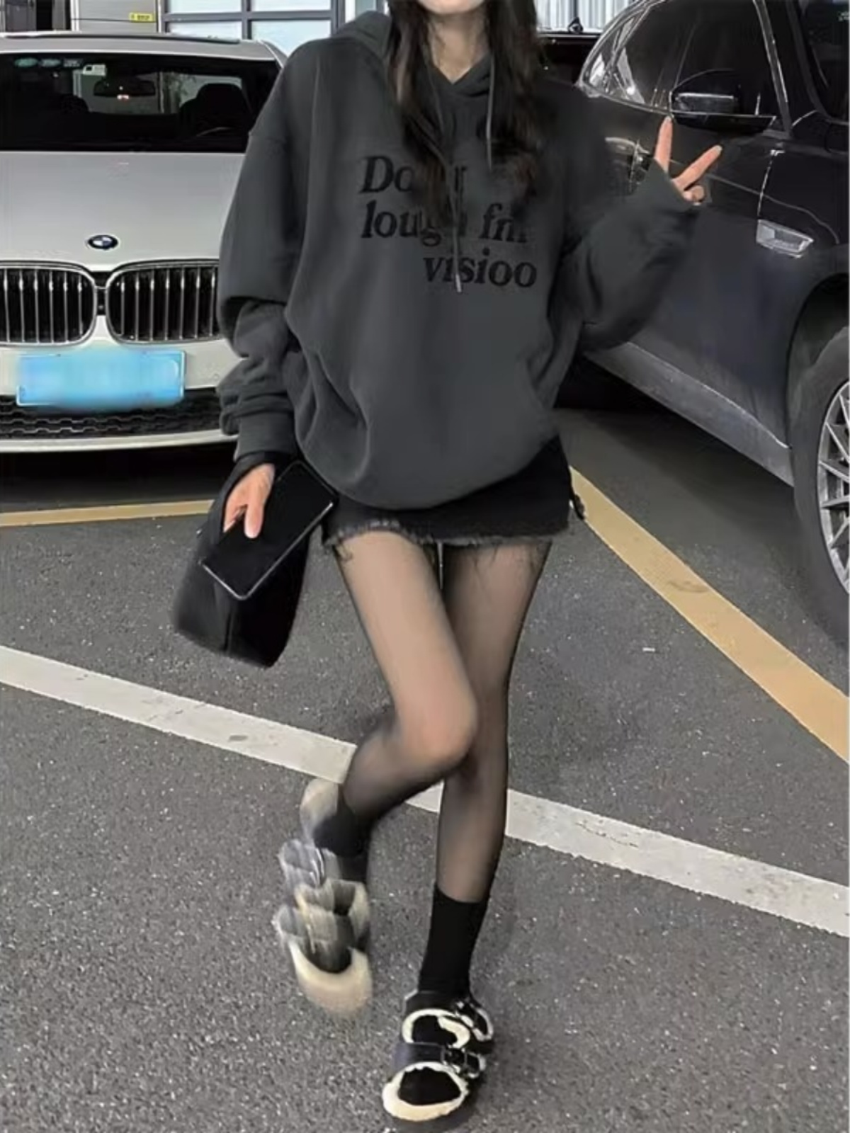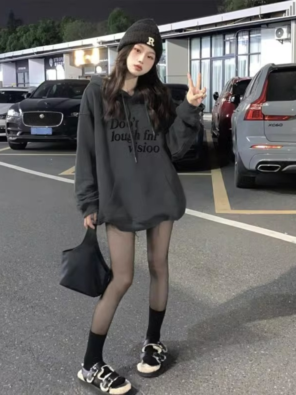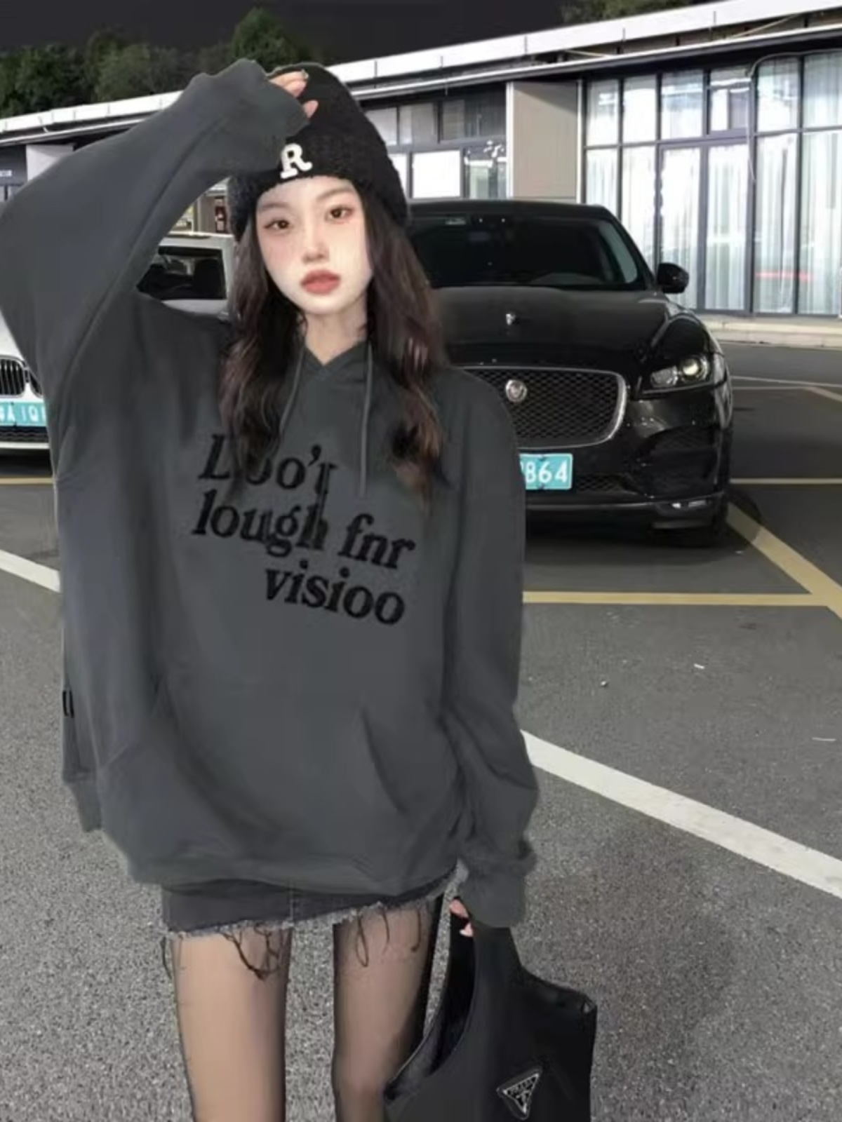 Cement Gray American Retro Hooded Sweatshirt Female Spring and Autumn Thin Unique Chic Idle Style Oversize Outwear