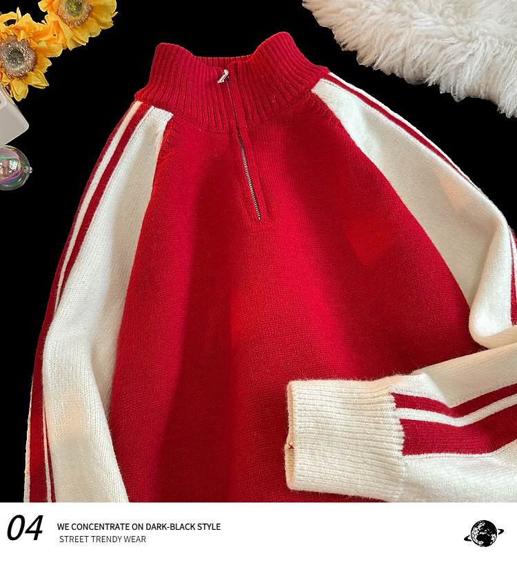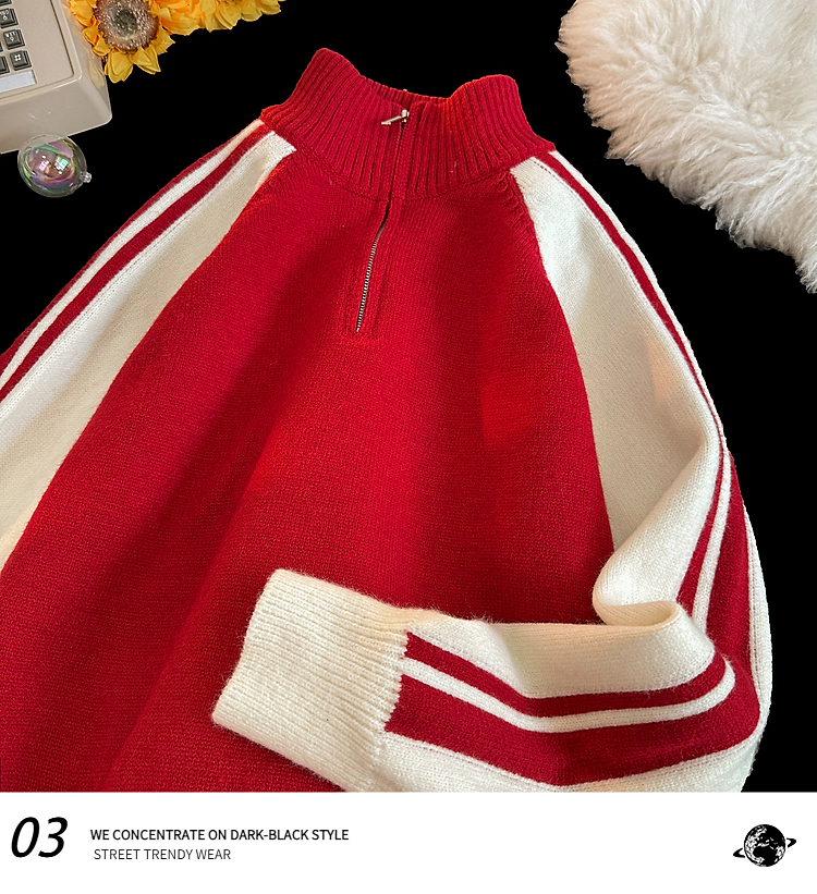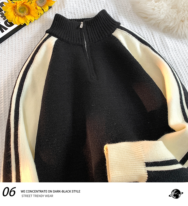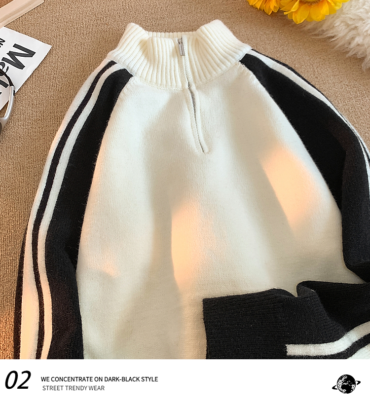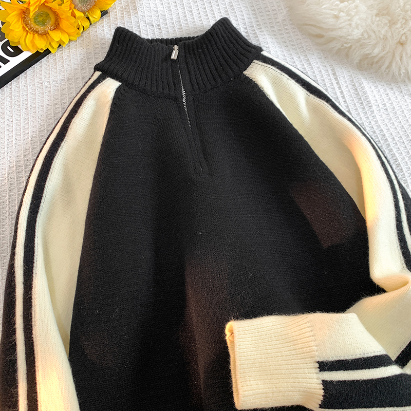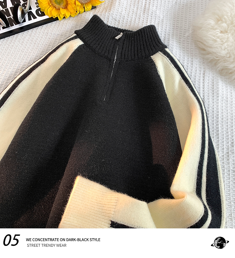 China Trendy Contrast Color Half Zipped Stand Collar Sweater Female 2025 Winter Loose Lovers Wild Comfortable Knitwear Tops