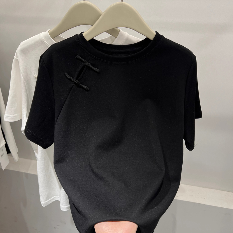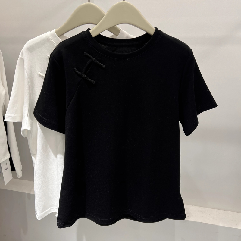 Chubby Girl Plus Size 1.00 Kg-150.00 kg Stylish New Chinese T-shirt Short Sleeve Female round Neck Chinese Knot Button Loose All-Matching Graceful Tops