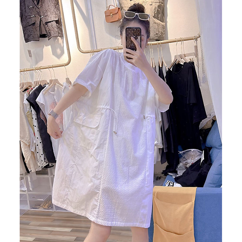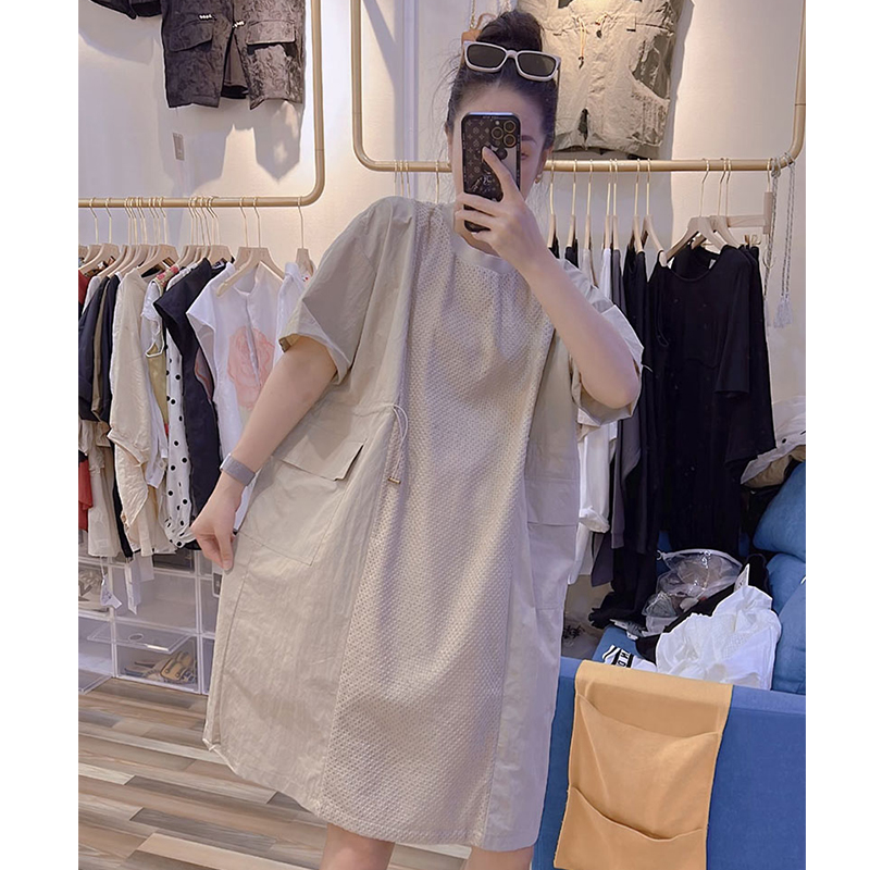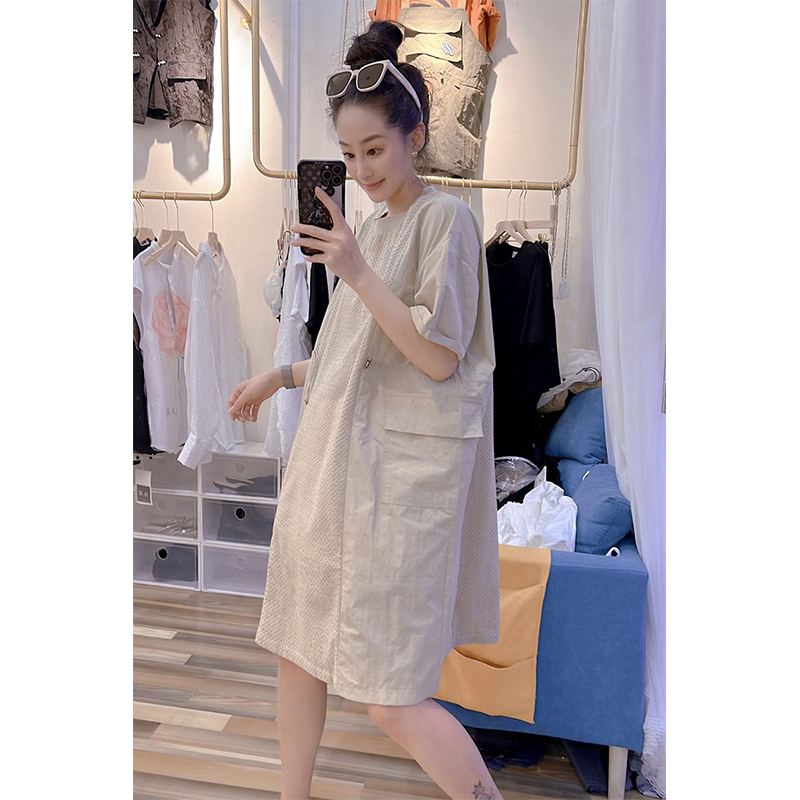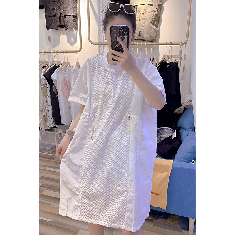 Chubby Girl Summer Fashion Patchwork Cotton Hemp Net Good Quality T-shirt Skirt Female Plus Size 1.00 Kg-150.00 kg Drawstring Short Sleeve Dress