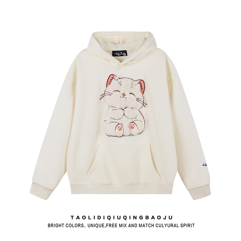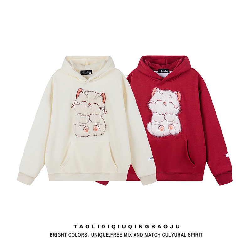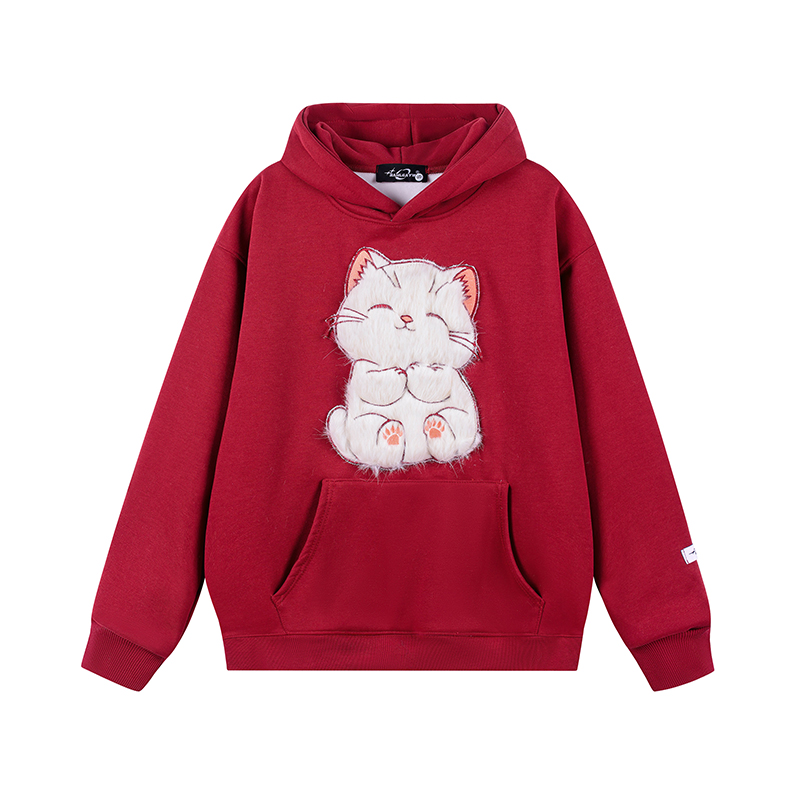 Country Trendy Cute Lucky Cat Hooded Sweatshirt Female Winter Fleece-lined Thick Loose Couple Coat New Year Red Tops