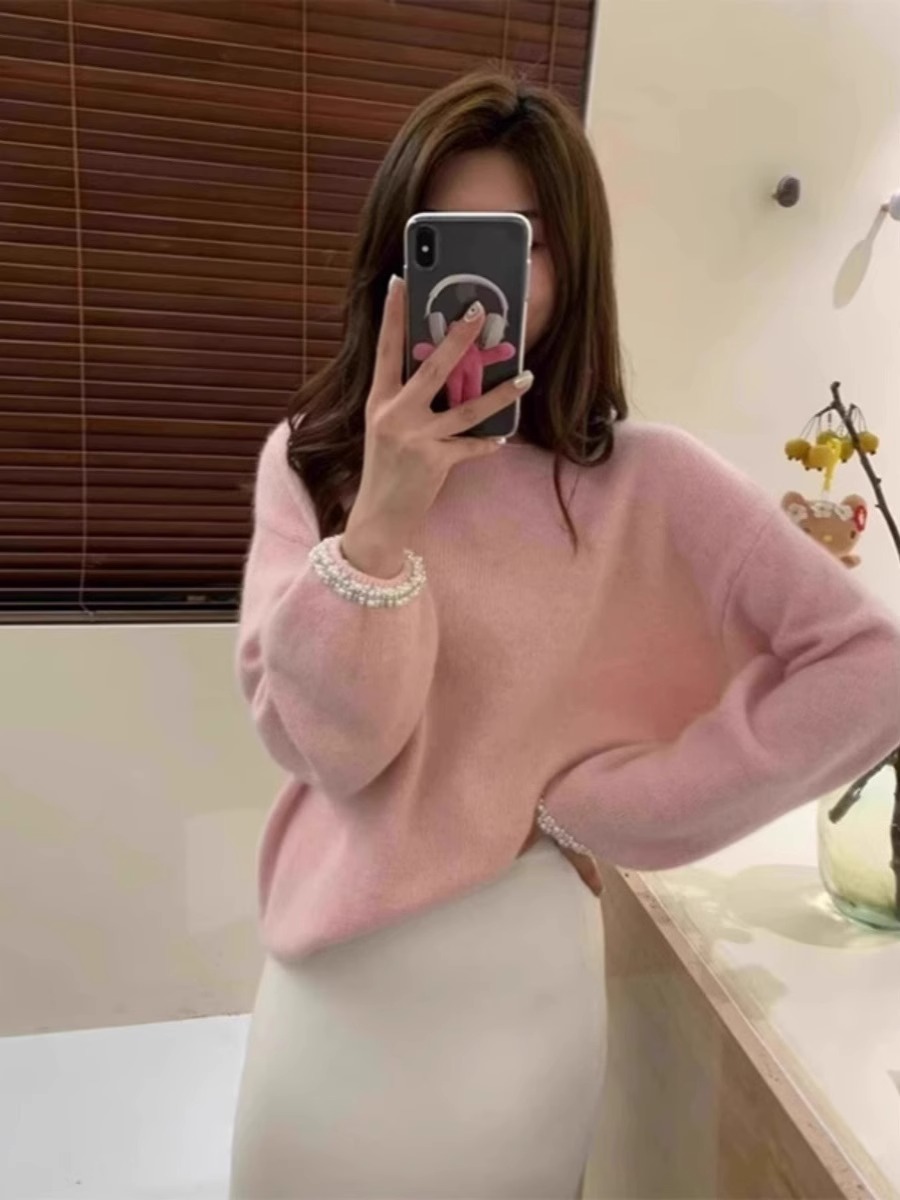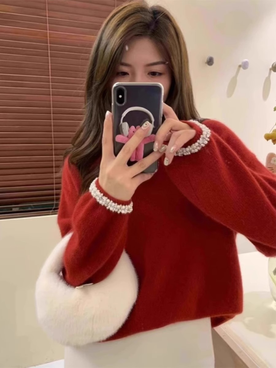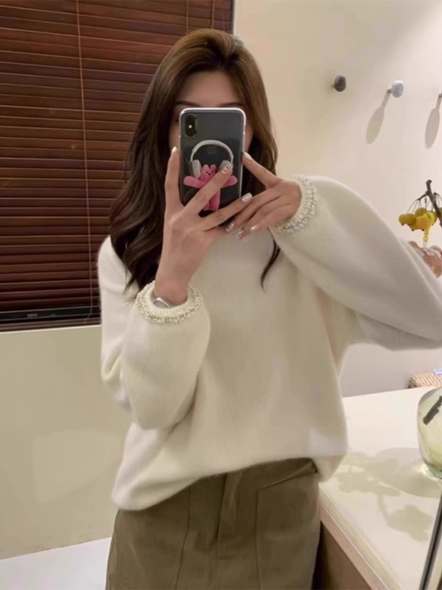Cuff Beaded round Neck Sweater Female 2025 Spring & Fall New Arrival Temperament Wild Long Sleeves Raccoon Fur Pullover Knitwear