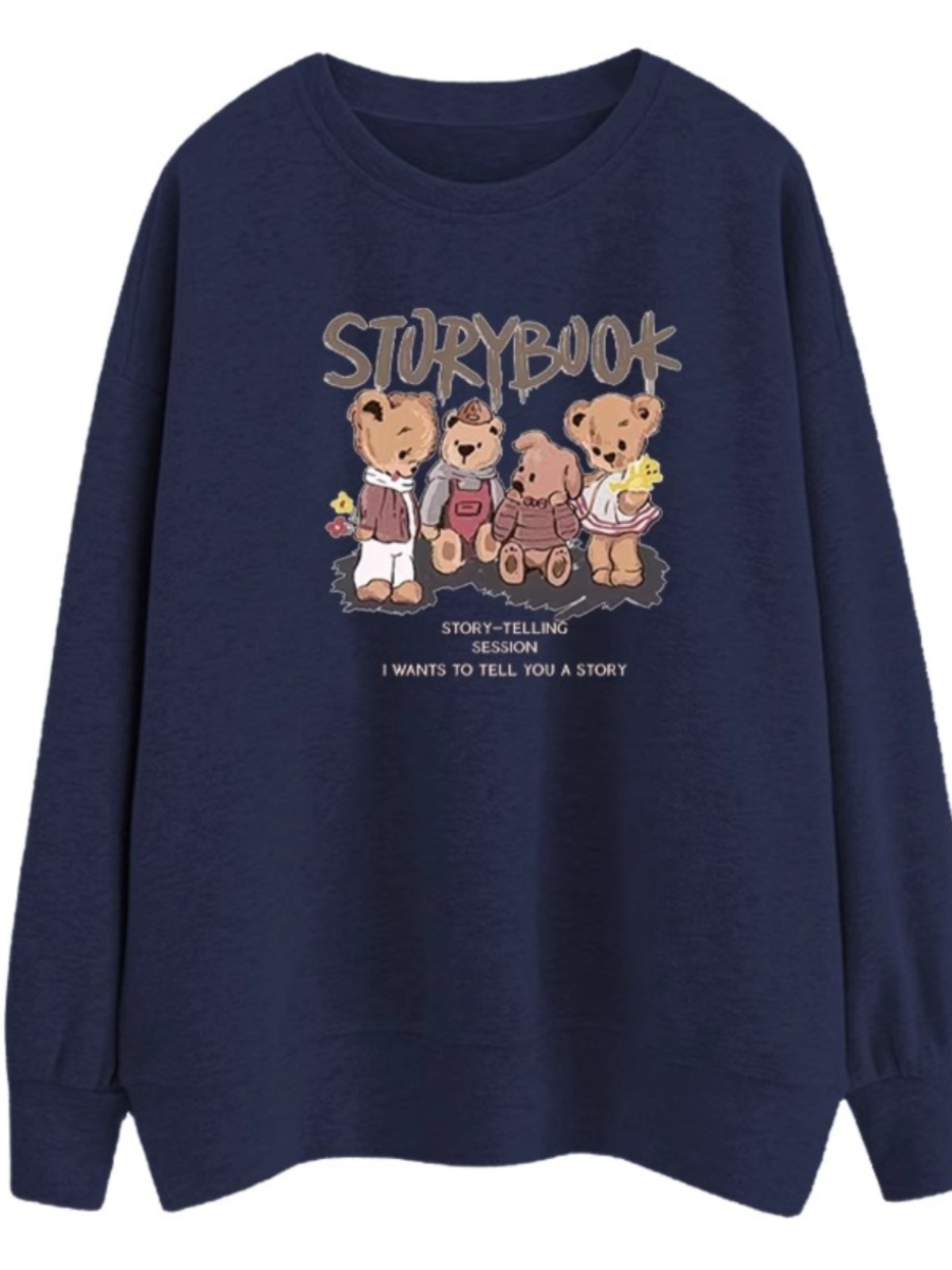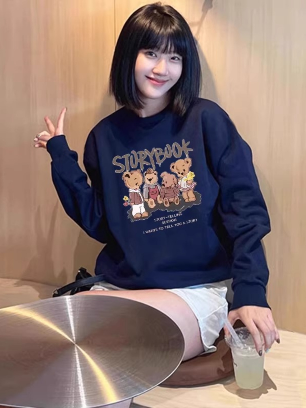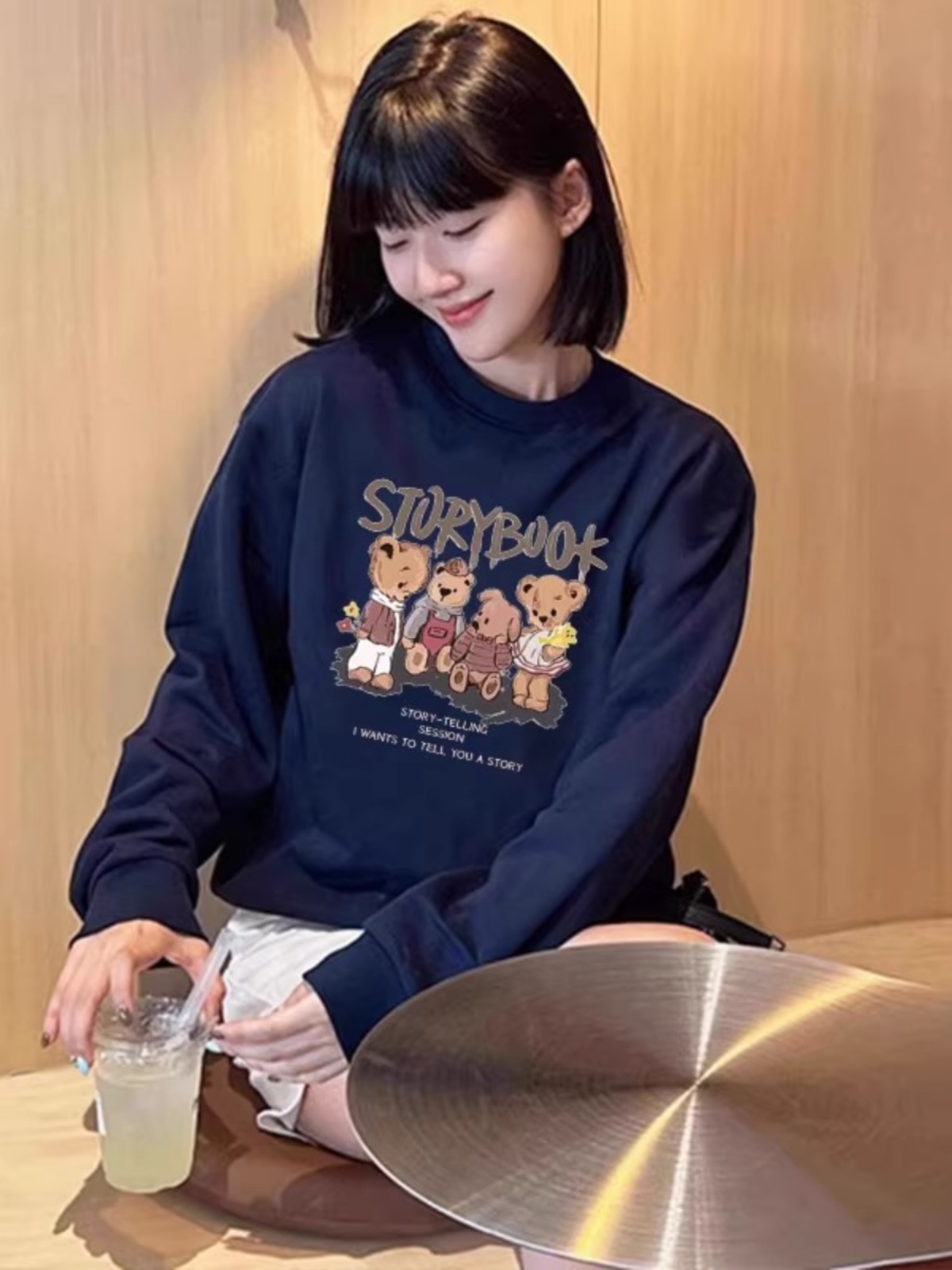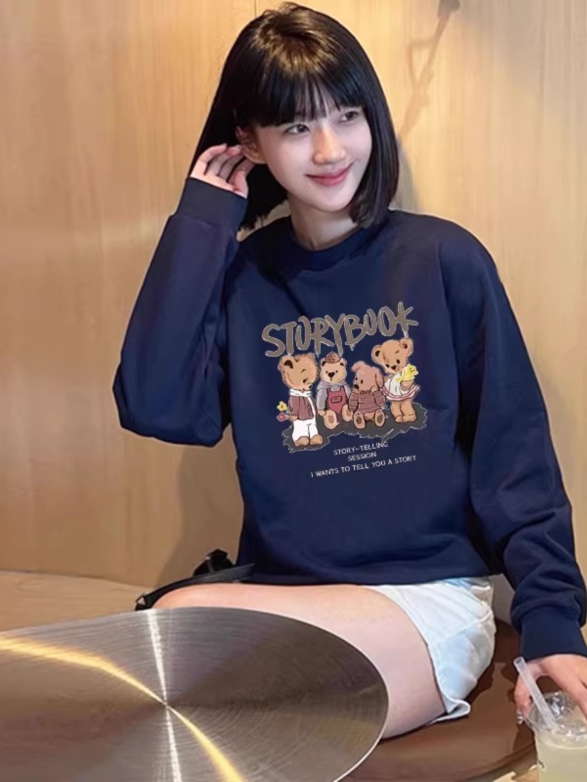 Dark Blue Fleece-Lined Cartoon round Neck Sweatshirt Women 2025 Spring & Fall New Arrival K-style Youthful-Looking Loose Slim Looking Top without Hood