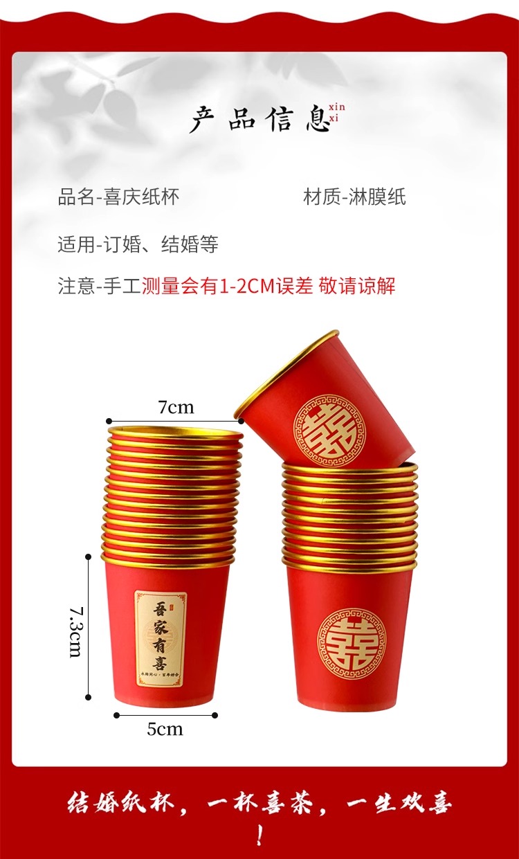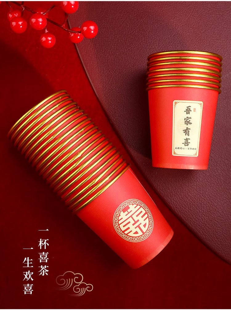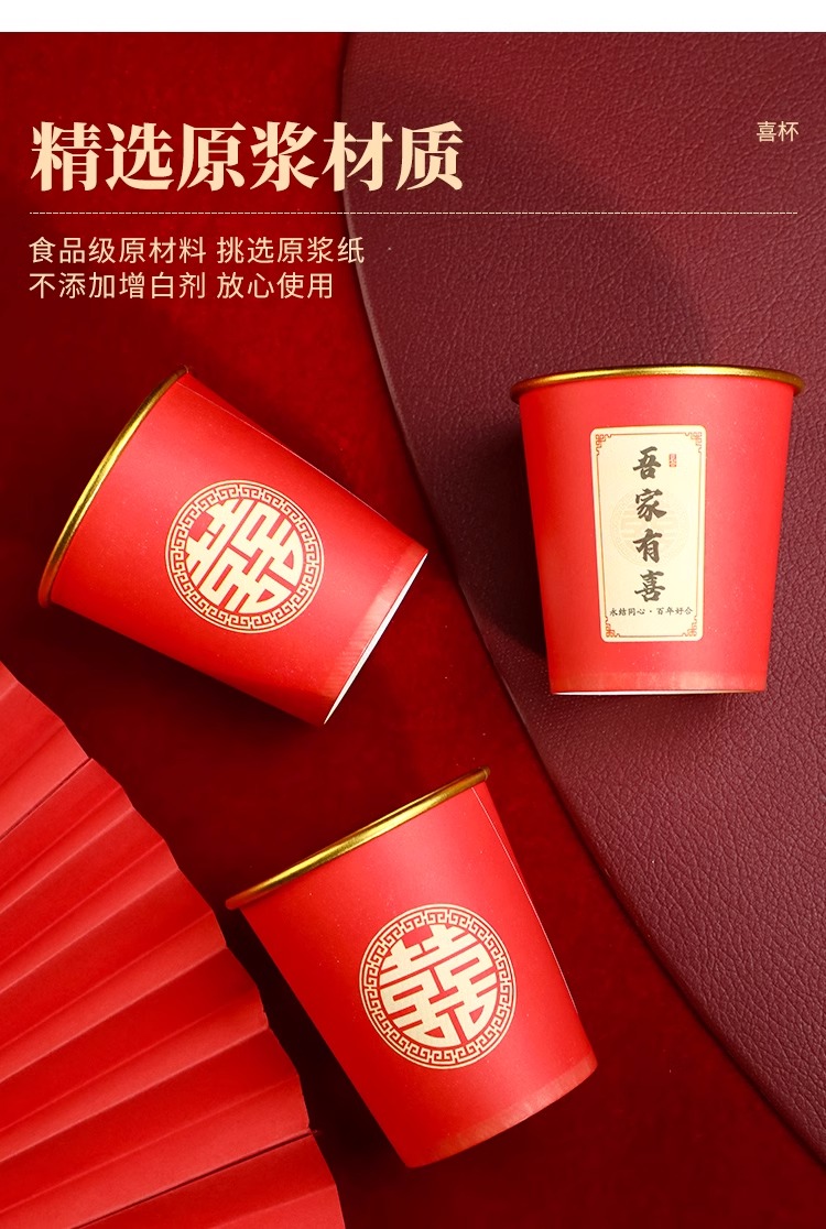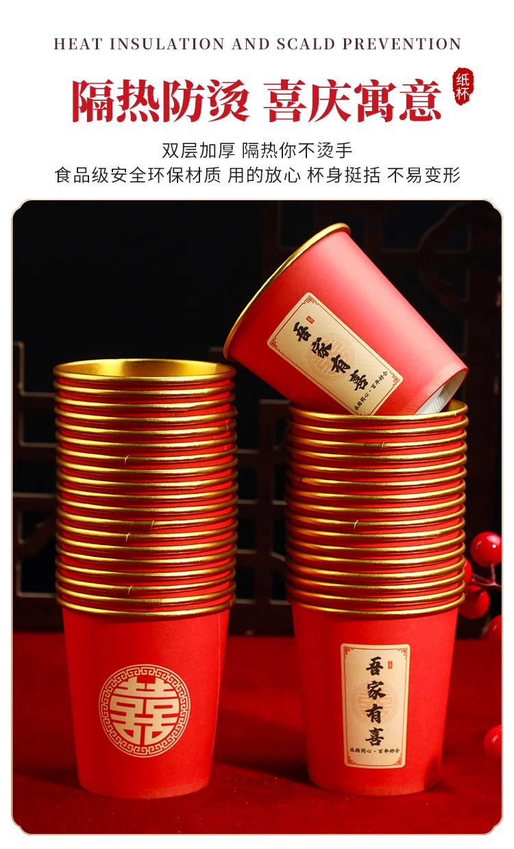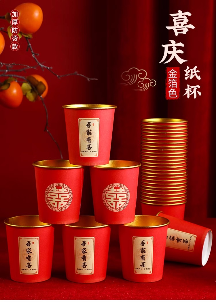 Disposable Paper Cup Thickened Household Wedding Banquet Wedding New Year Red Festive Wedding Housewarming High Temperature Resistant Paper Cup