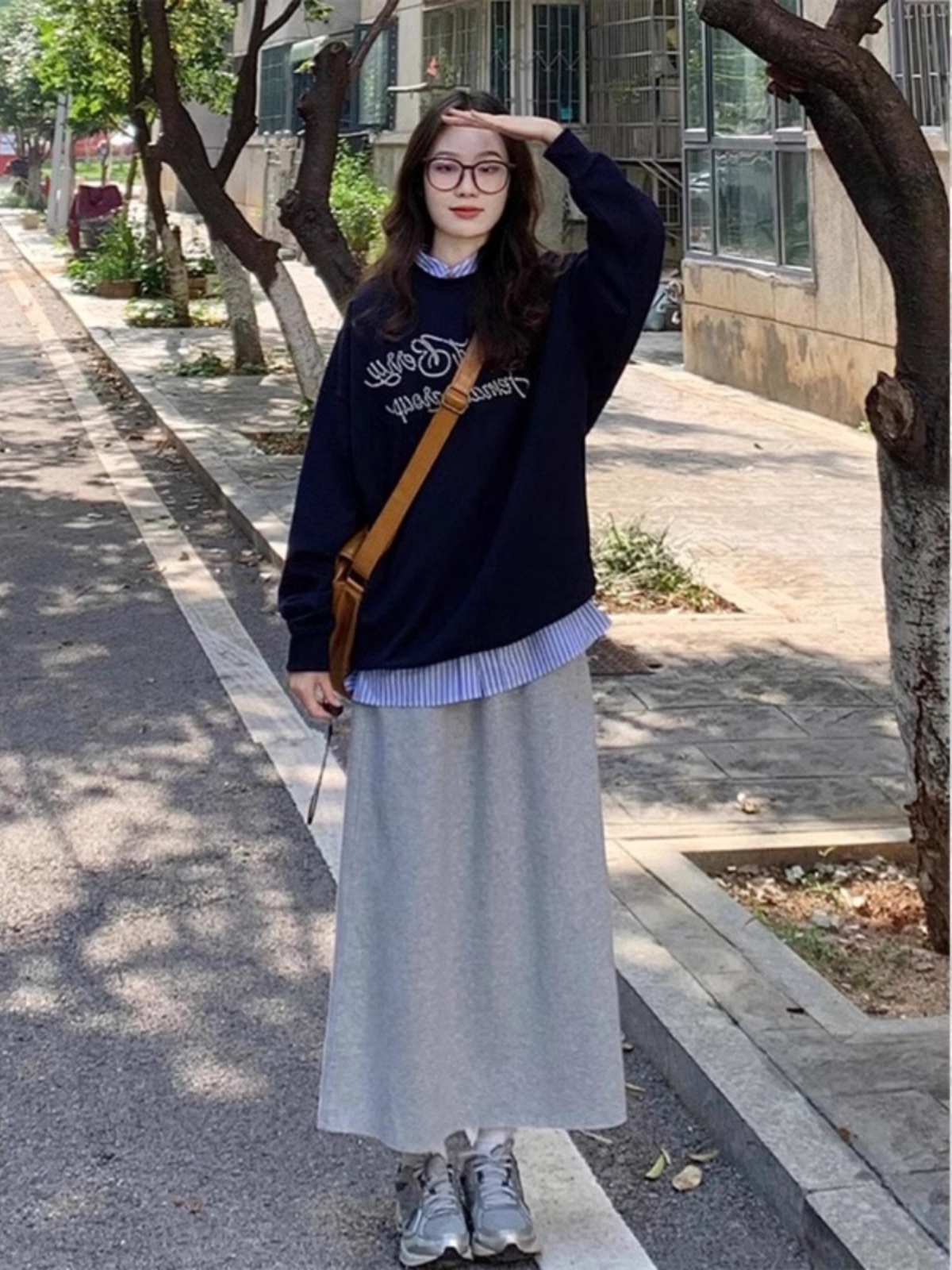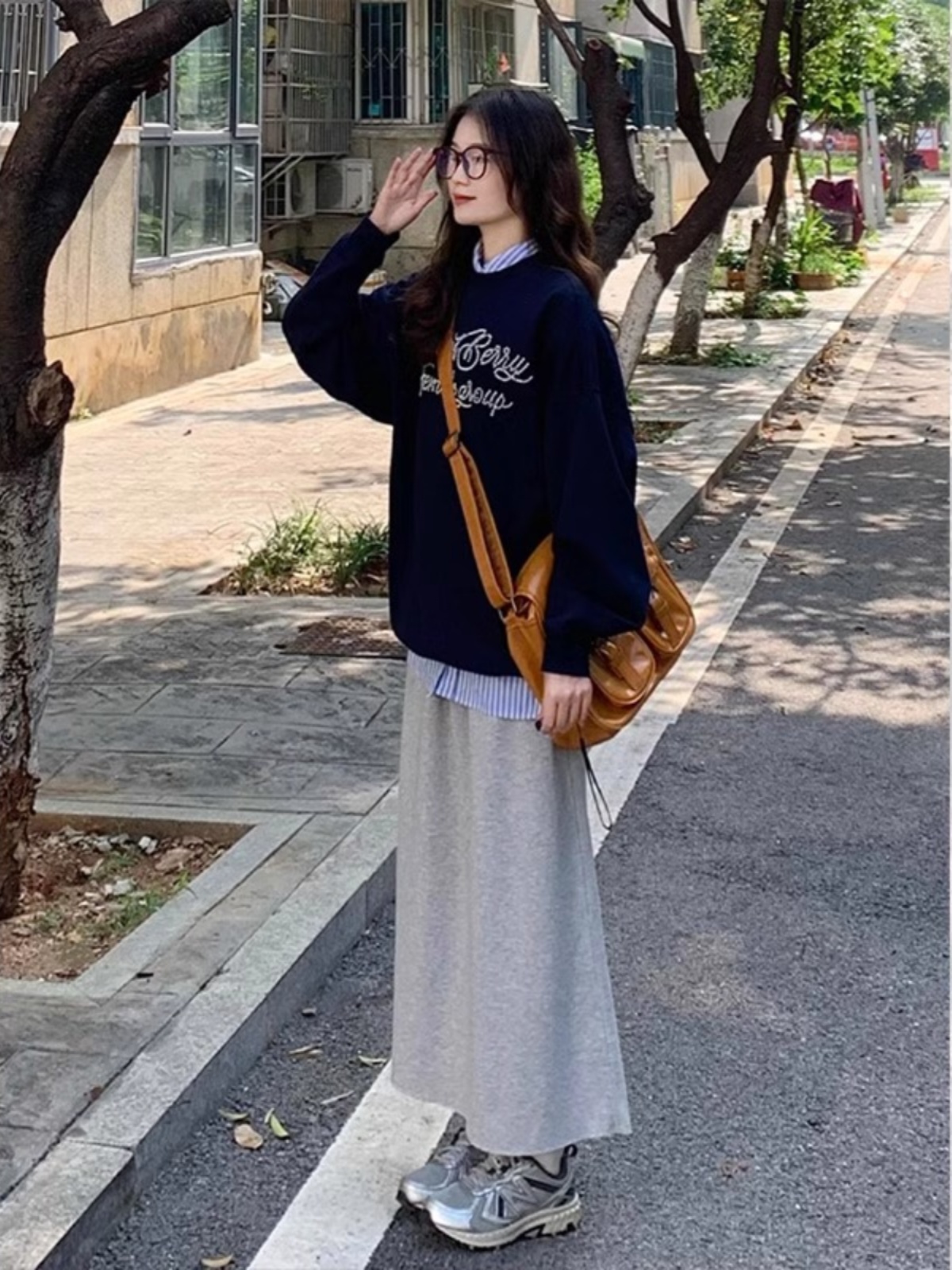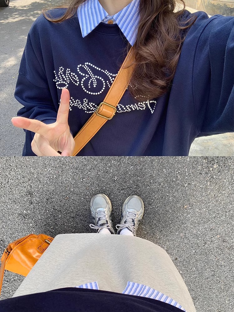 Early Autumn New Arrival Dark Blue Bandage Dress Sweatshirt Women's Spring and Autumn Small Stylish Niche Style Long Sleeves Shoulder Tops Thin