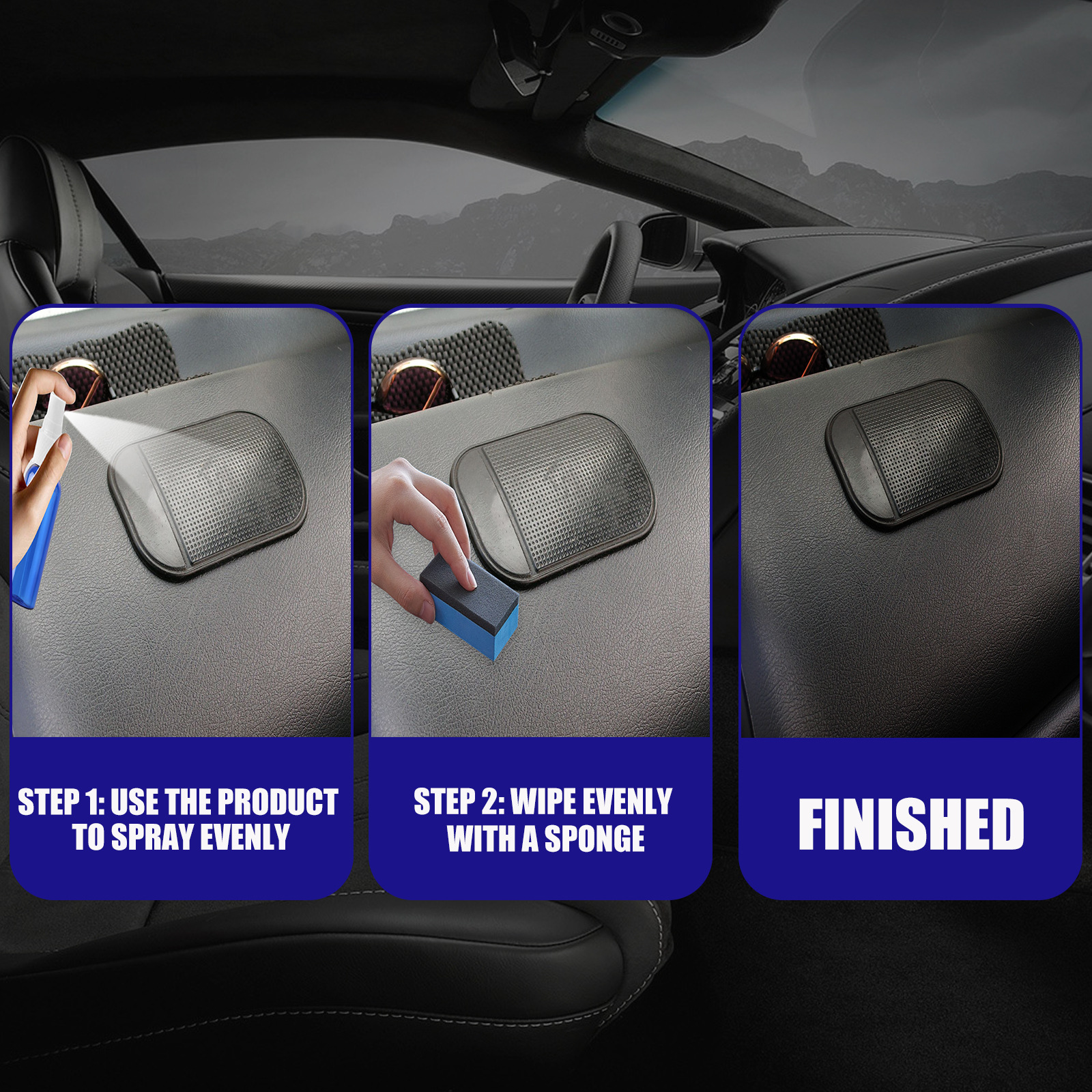 我们的汽车塑料翻新剂含有水、硅油、表面活性剂。它可以使你的汽车表面得到翻新、镀膜和防尘。它的使用方法很简单:将产品倒至海绵,将其均匀涂抹擦拭在需要翻新的地方,使用毛巾再次抛光擦拭。适用于所有塑料件、皮革制品,让你的汽车焕然一新。