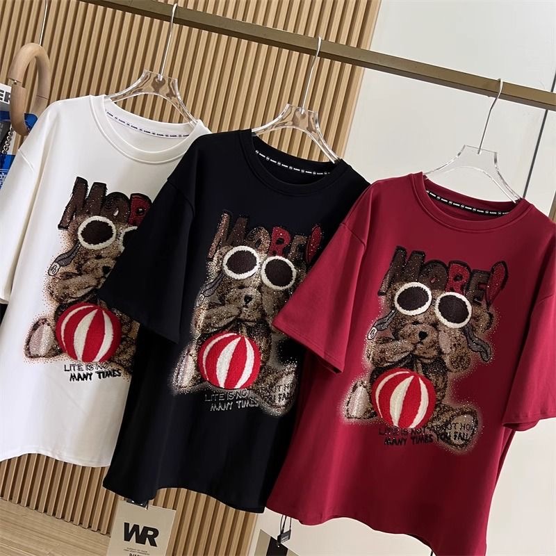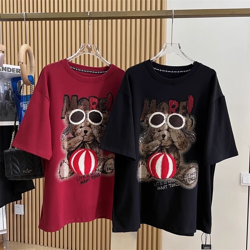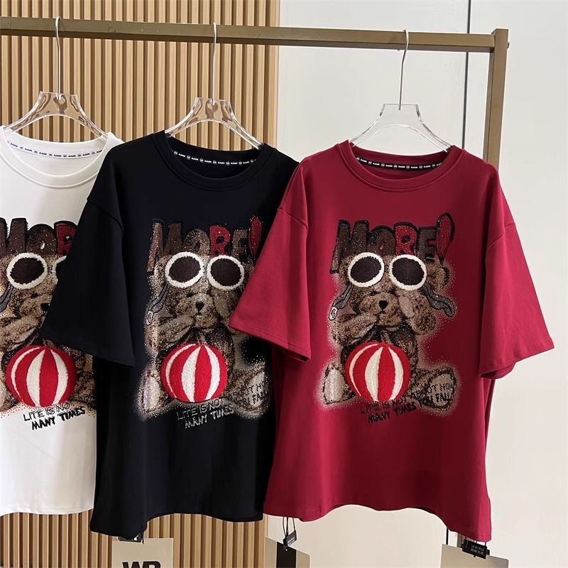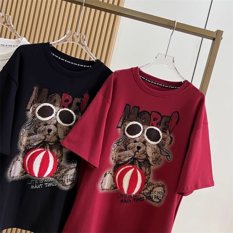 Extra Large Size 1.00 Kg-150.00 kg Plus Size Ladies Early Spring Little Bear Cartoon Printing Crafts Brushed Short Sleeve T-shirt Female Loose Slim Looking