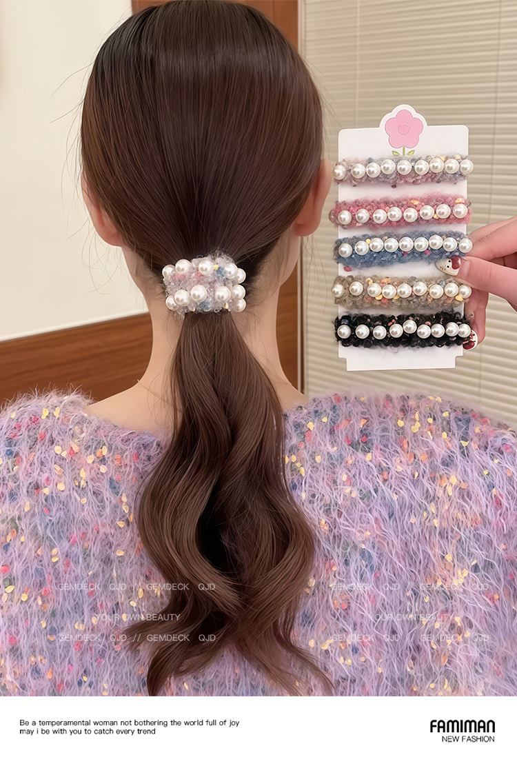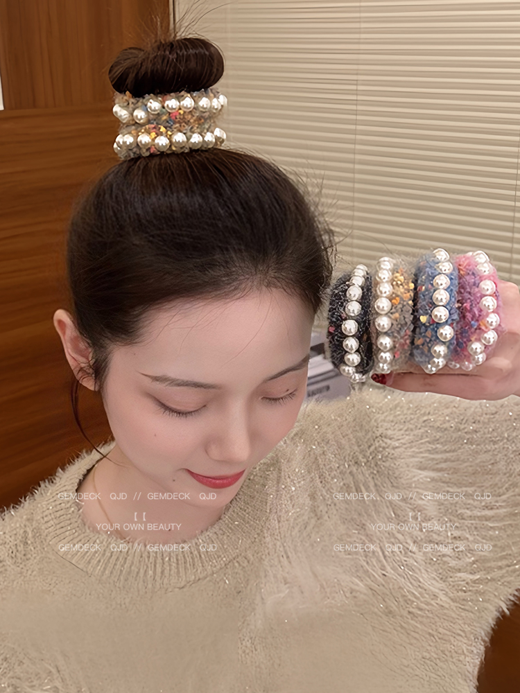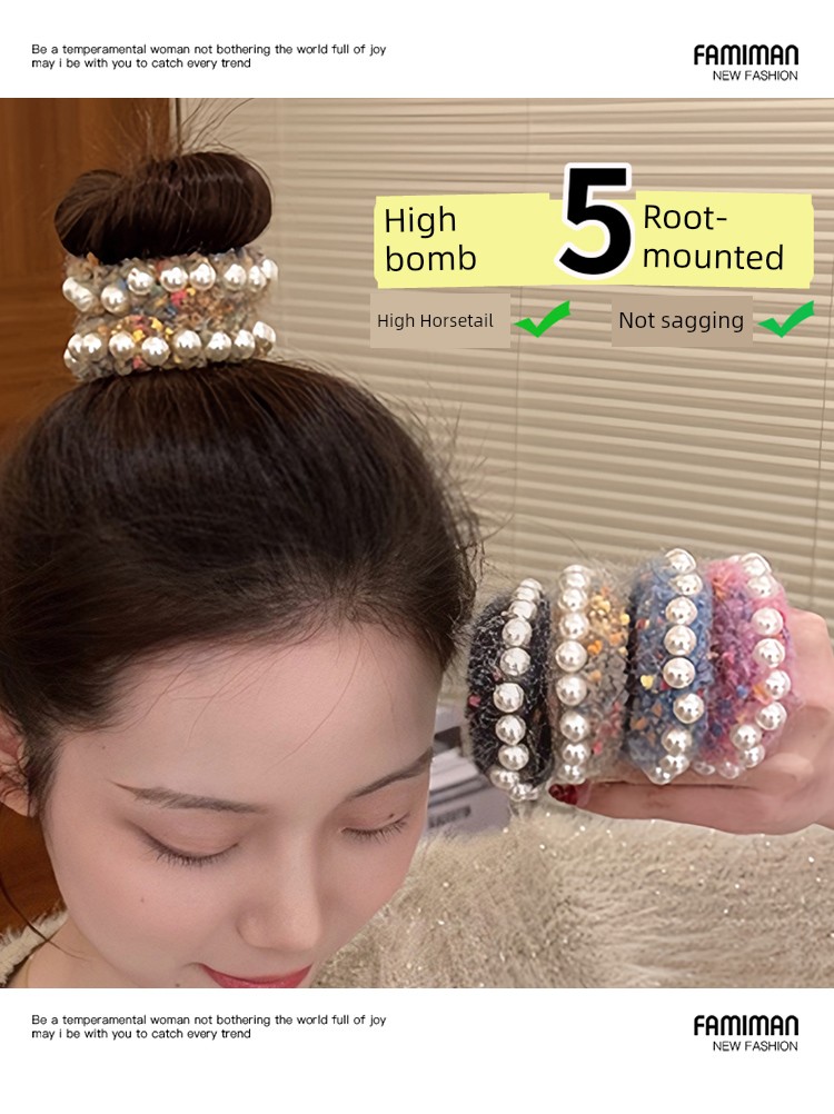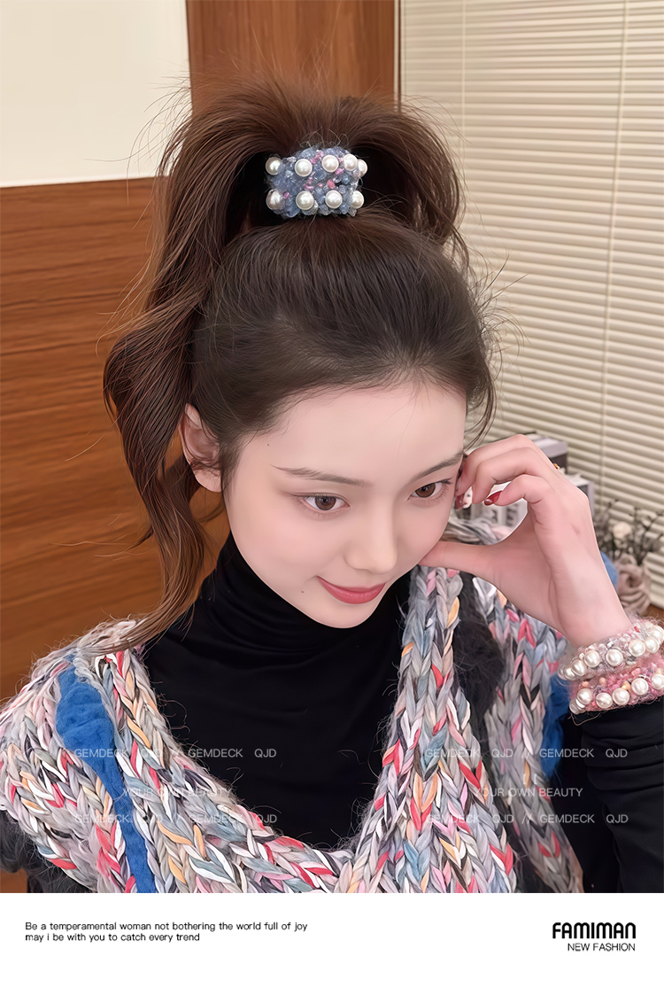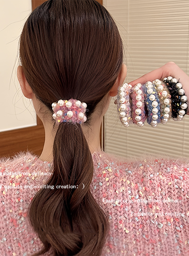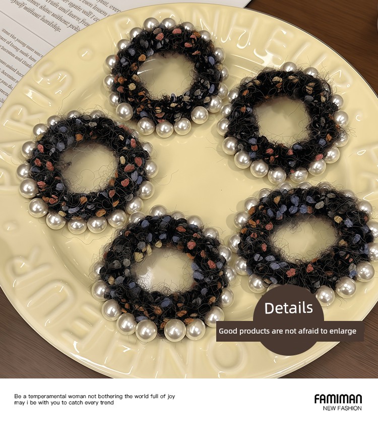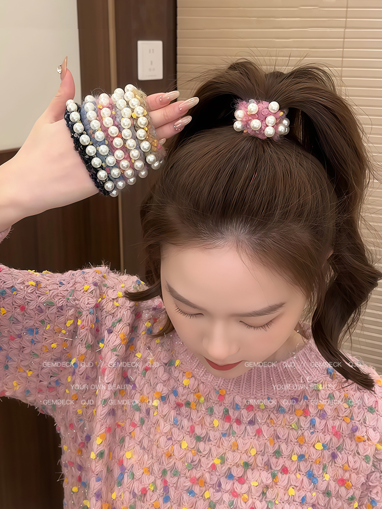 Fall and Winter Color Wool Pearl Hair Band Sweet Beauty High Ponytail Hair String Rubber Band Female Tie Ball Head Rope Rubber Band Headdress