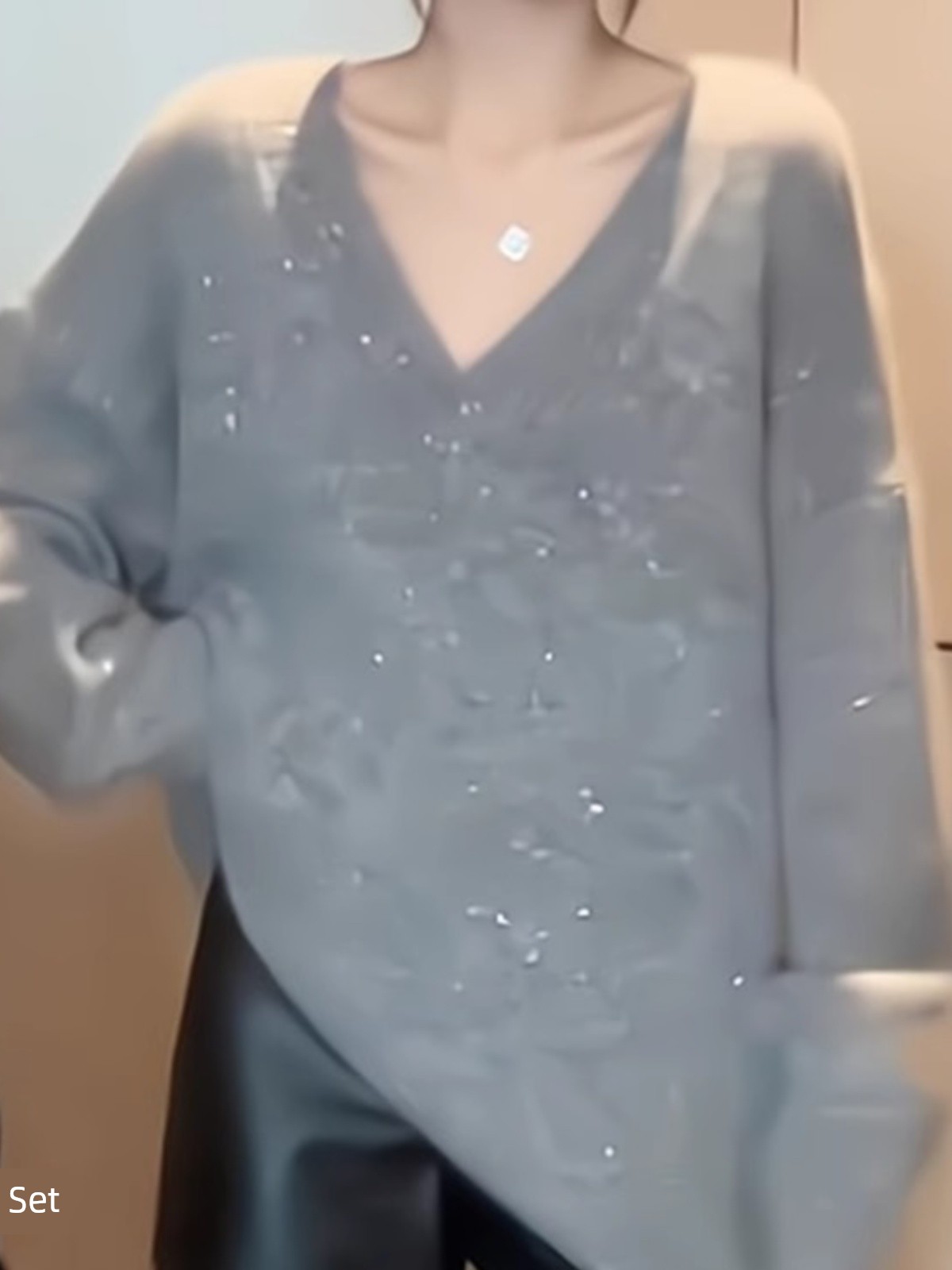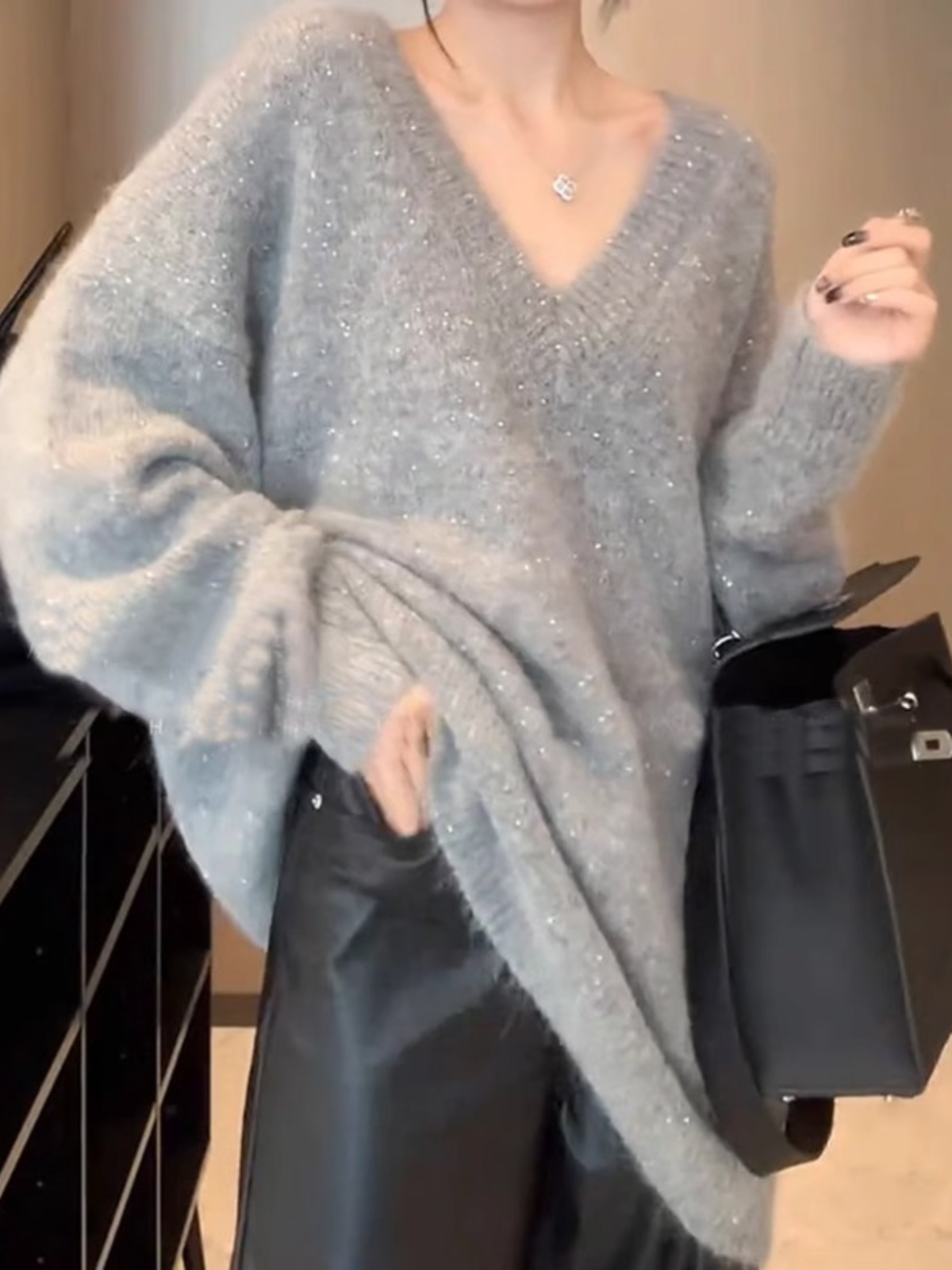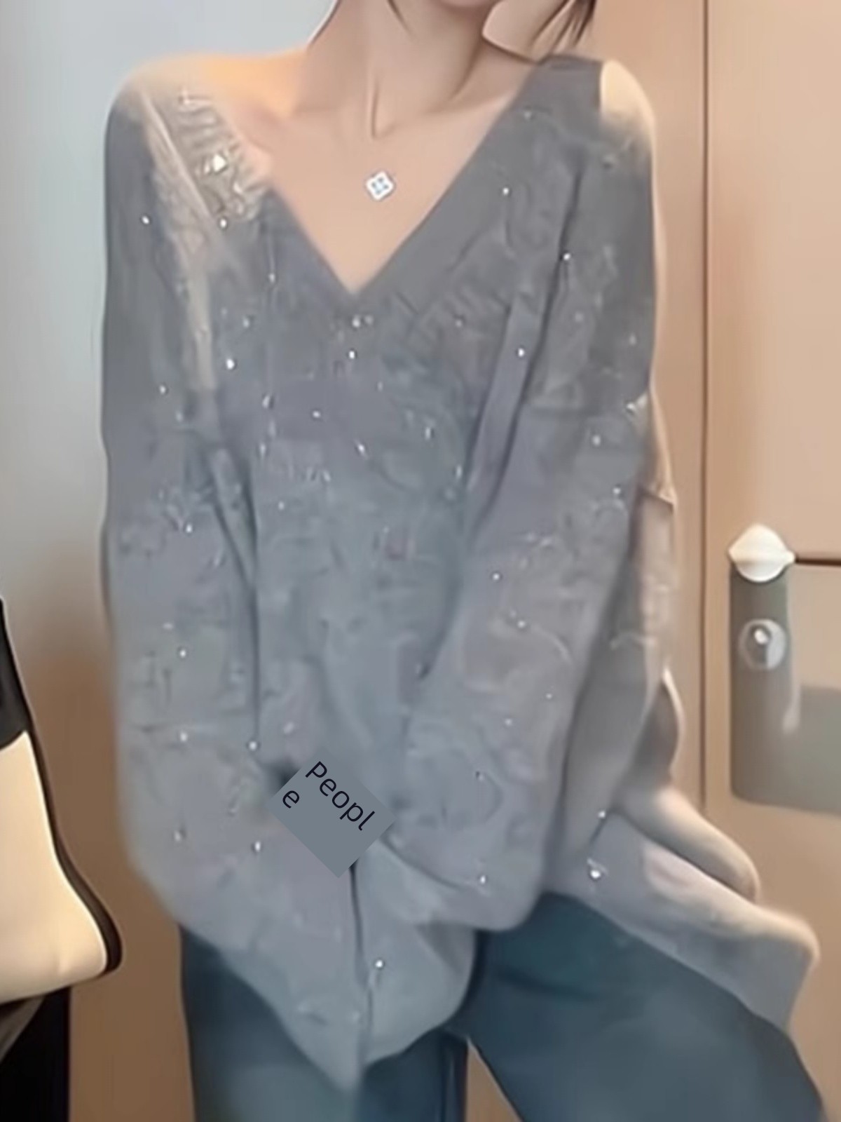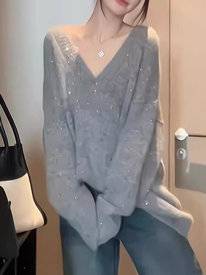Fancy Heavy Industry Gray V-neck Sequin Sweater Female Spring & Fall 2025 New Lazy Wind Fashion All-Matching Knitwear