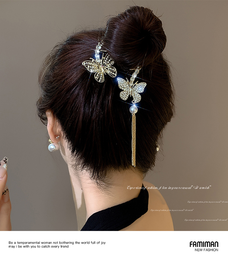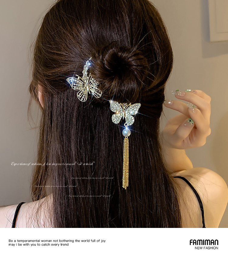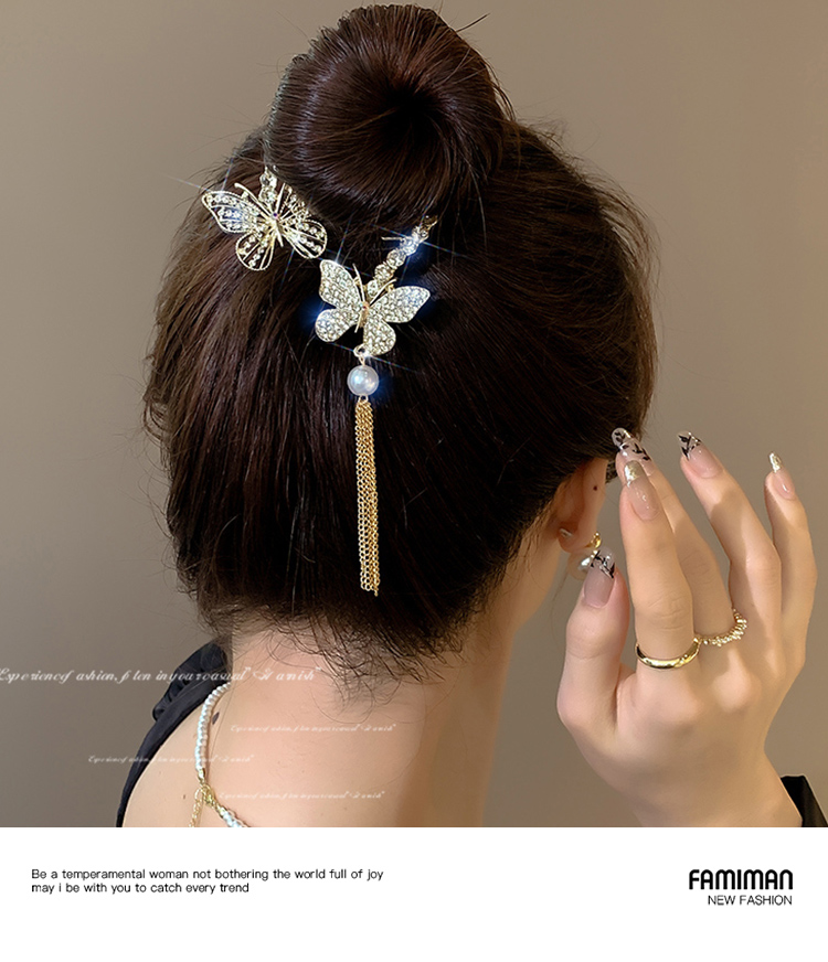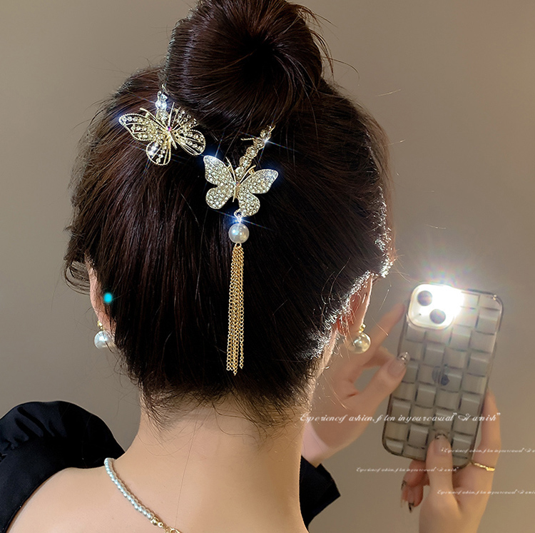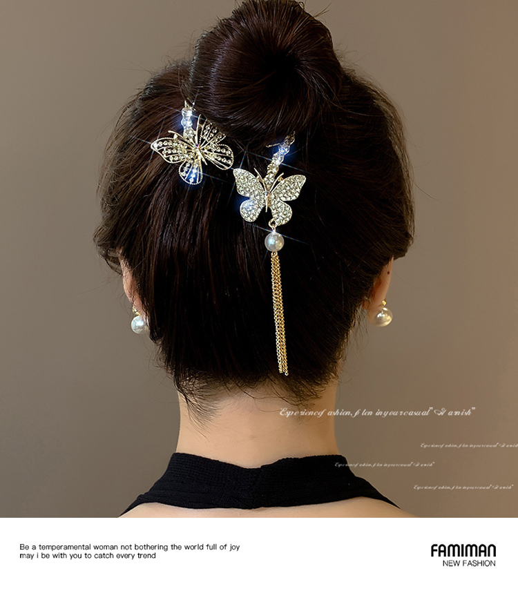 Fancy Rhinestone Butterfly Tassel Topknot Hair Clip Female Back Head Updo Gadget Twist Clips Hairpin Headdress