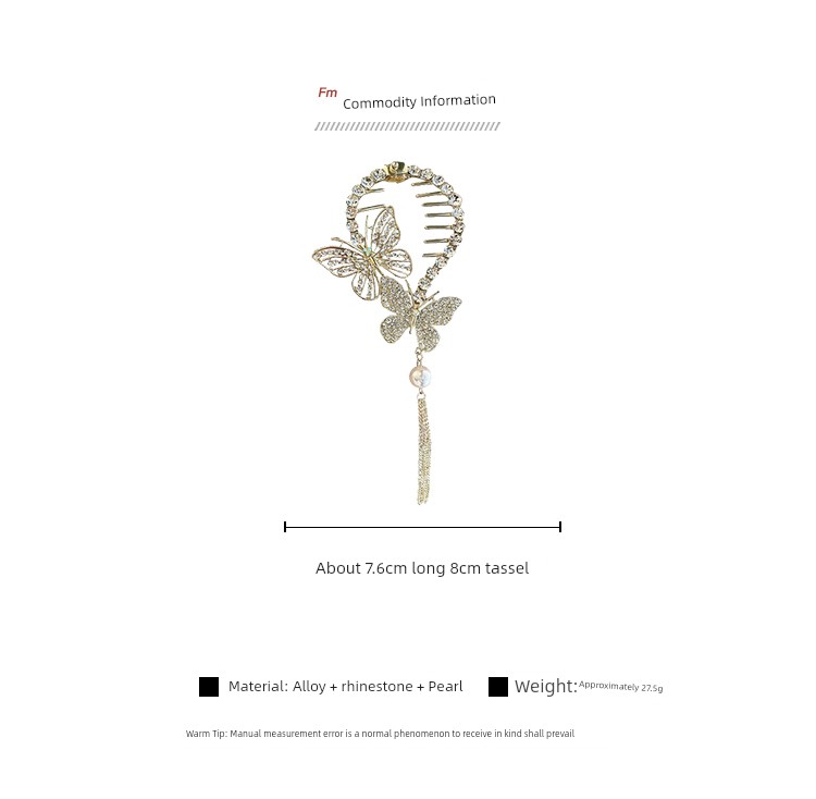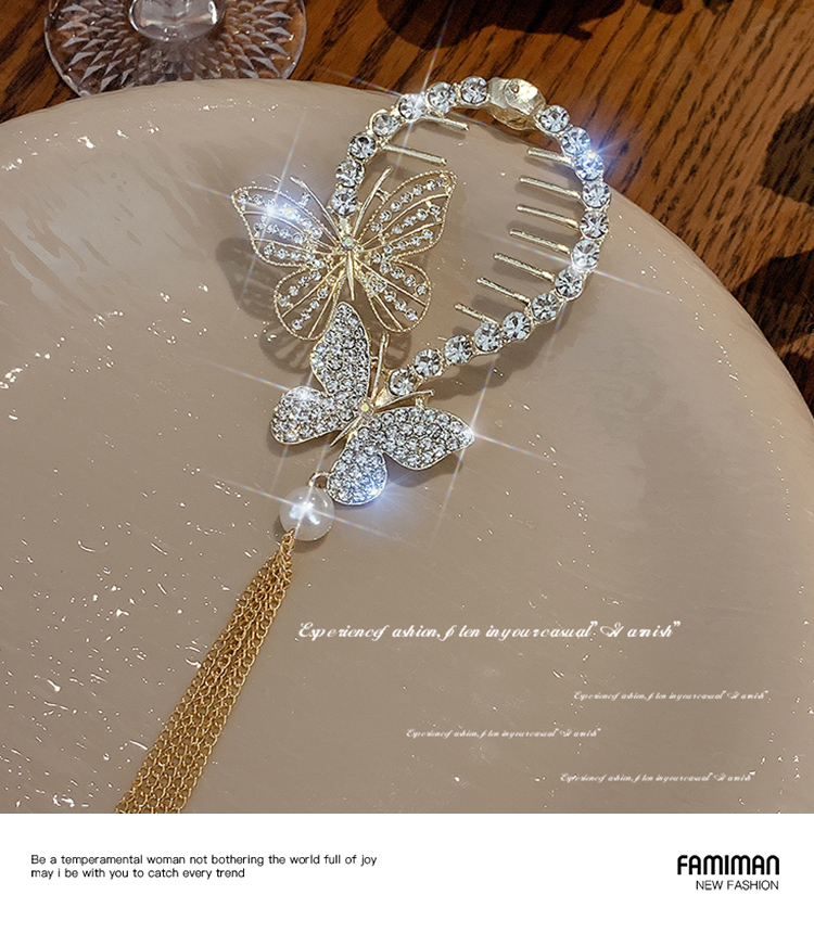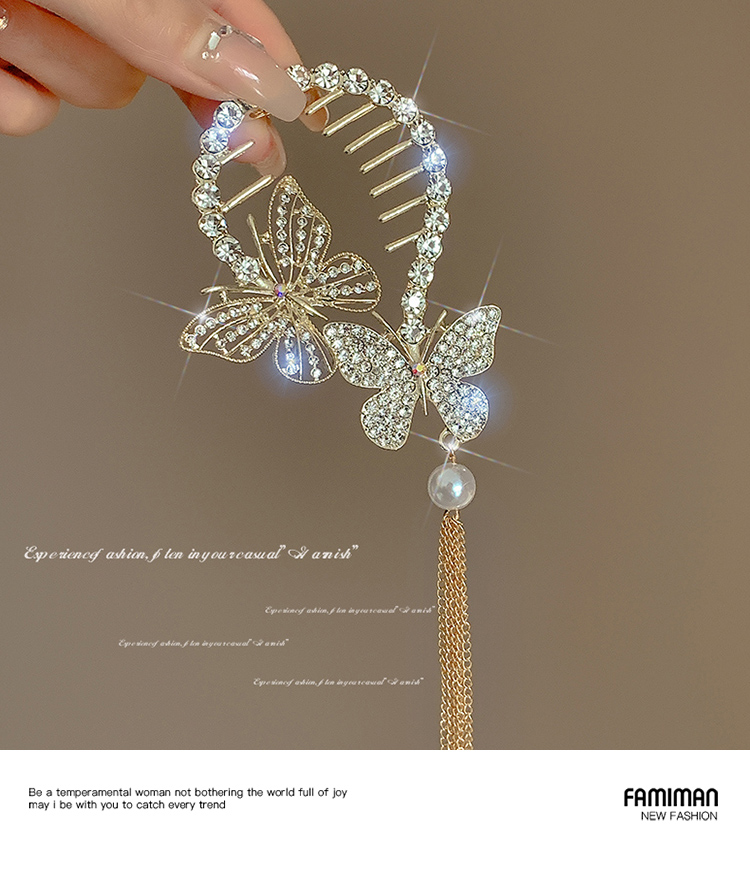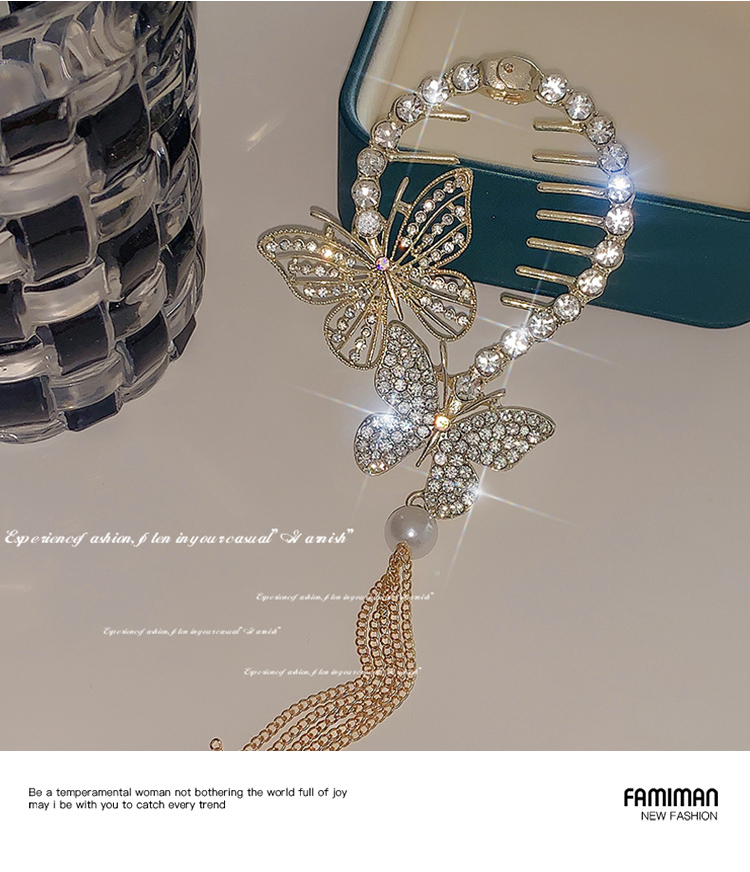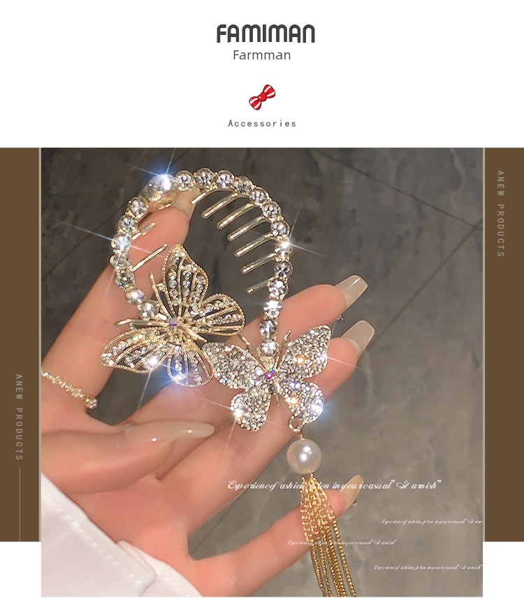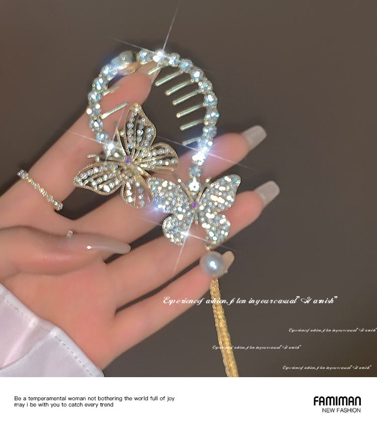 Fancy Rhinestone Butterfly Tassel Topknot Hair Clip Female Back Head Updo Gadget Twist Clips Hairpin Headdress