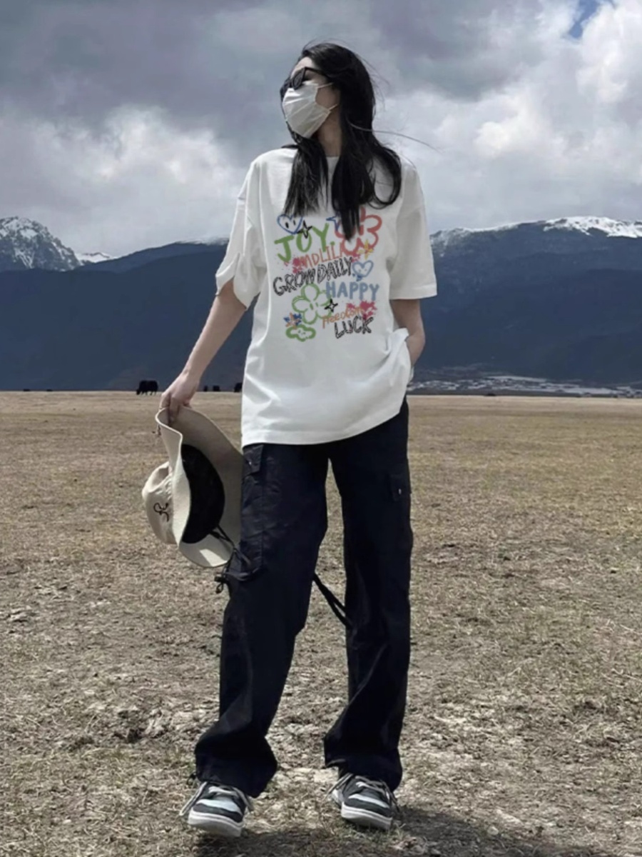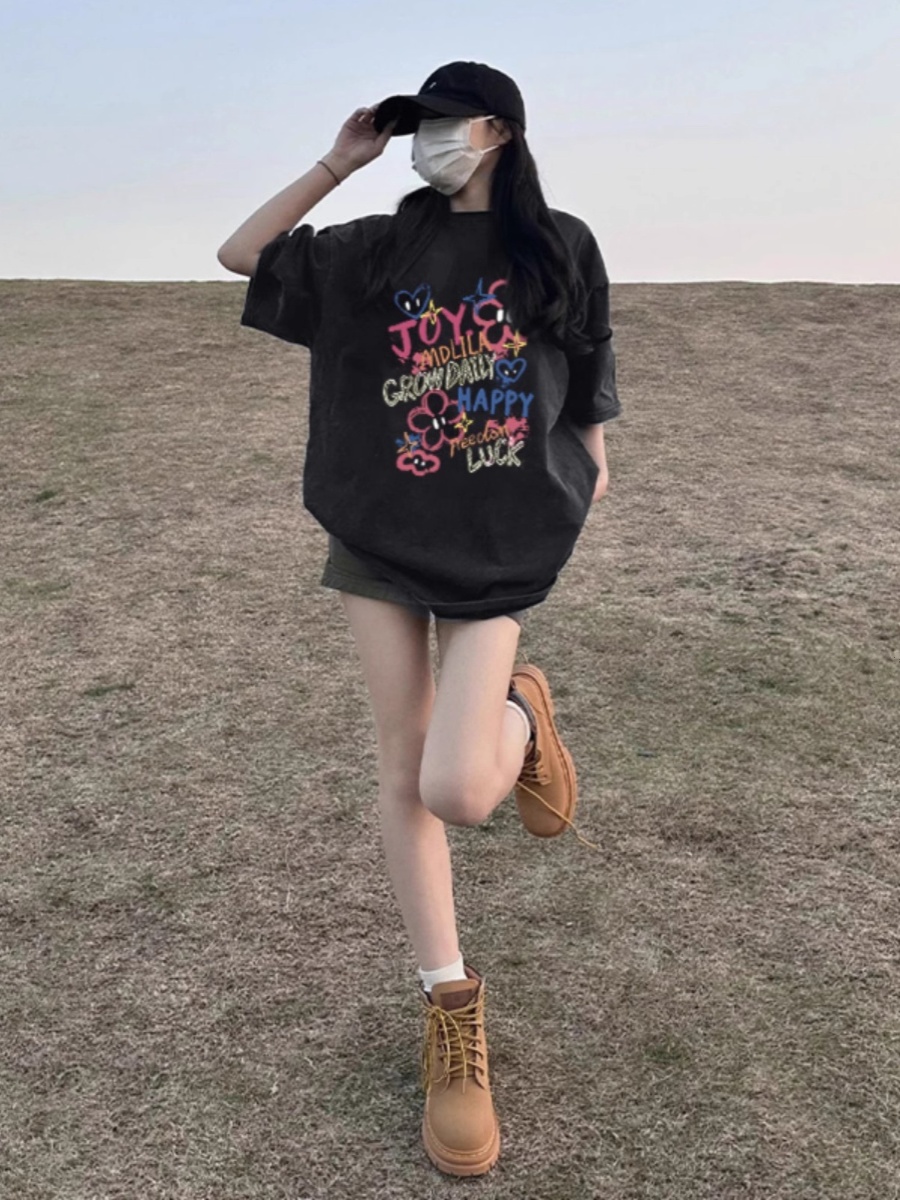 Fashion Brand Cartoon Flower Summer Loose Niche Design Half Sleeve Tops 2025 American Retro Short Sleeve T-shirt for Women