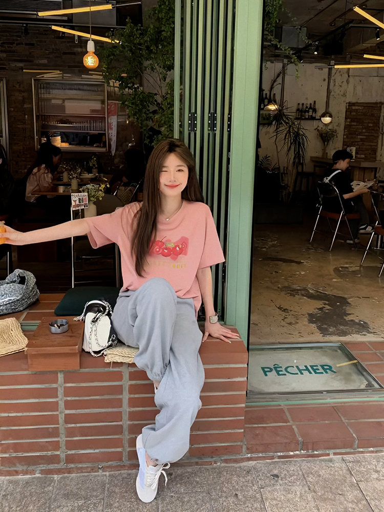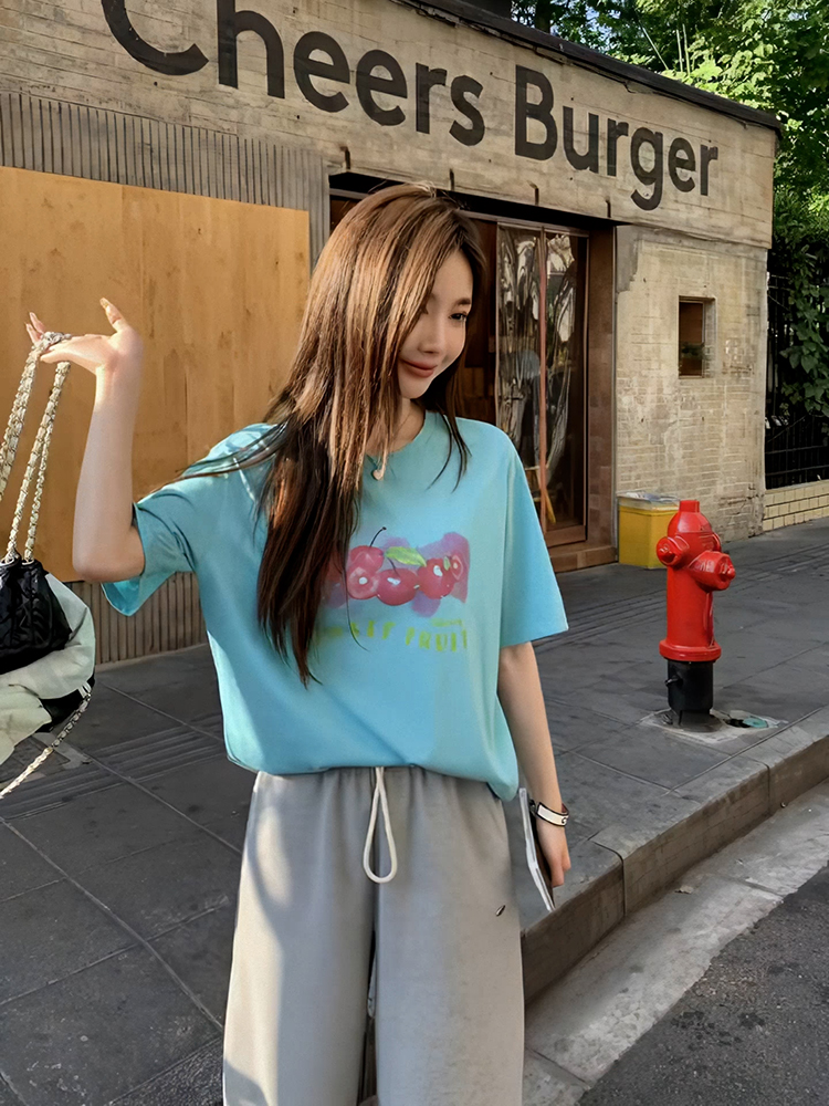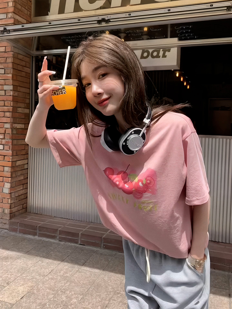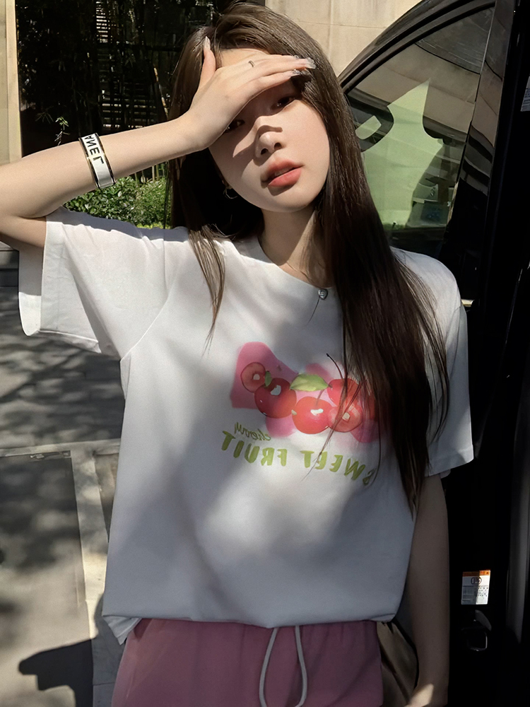 Fashion Letter Cherry Print T-Shirt 2025 New Arrival Female Stylish Loose Casual All-Matching round Neck Short Sleeve Tops