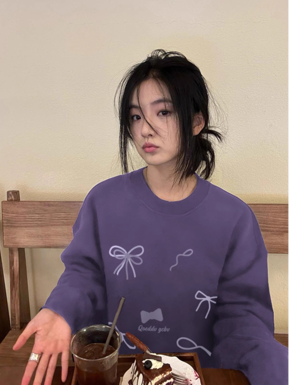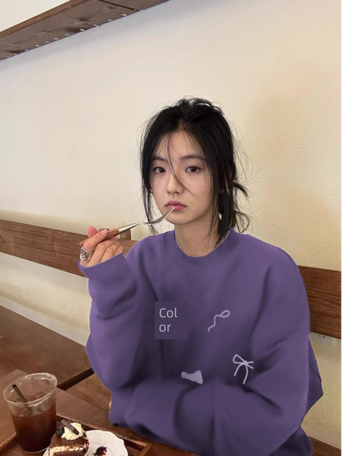 Fleece-lined Thickened Purple Hoodie Women 2025 New Popular Spring and Autumn Small Slim Shoulder Hoodless round Neck Top