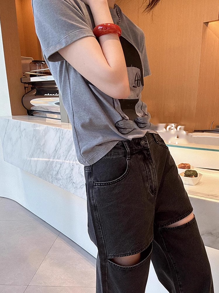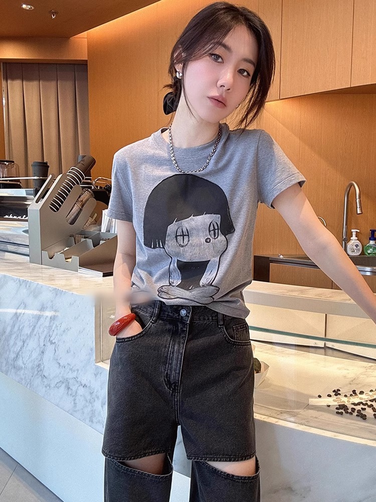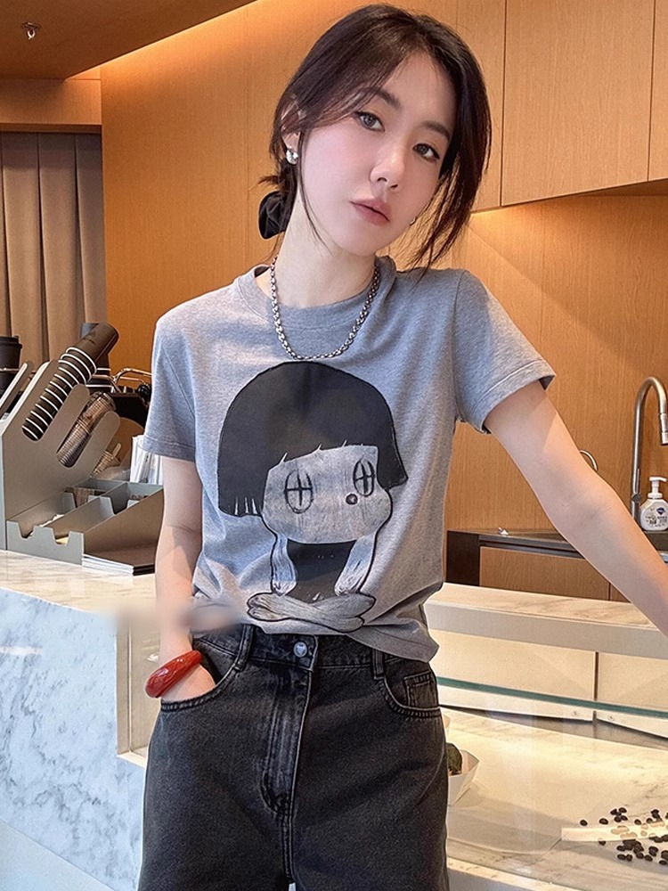 French Sweet and Spicy Small Top Super Nice Shoulder Slim Looking Small Gray Printing round Neck Short Sleeve T-Shirt Women's Summer