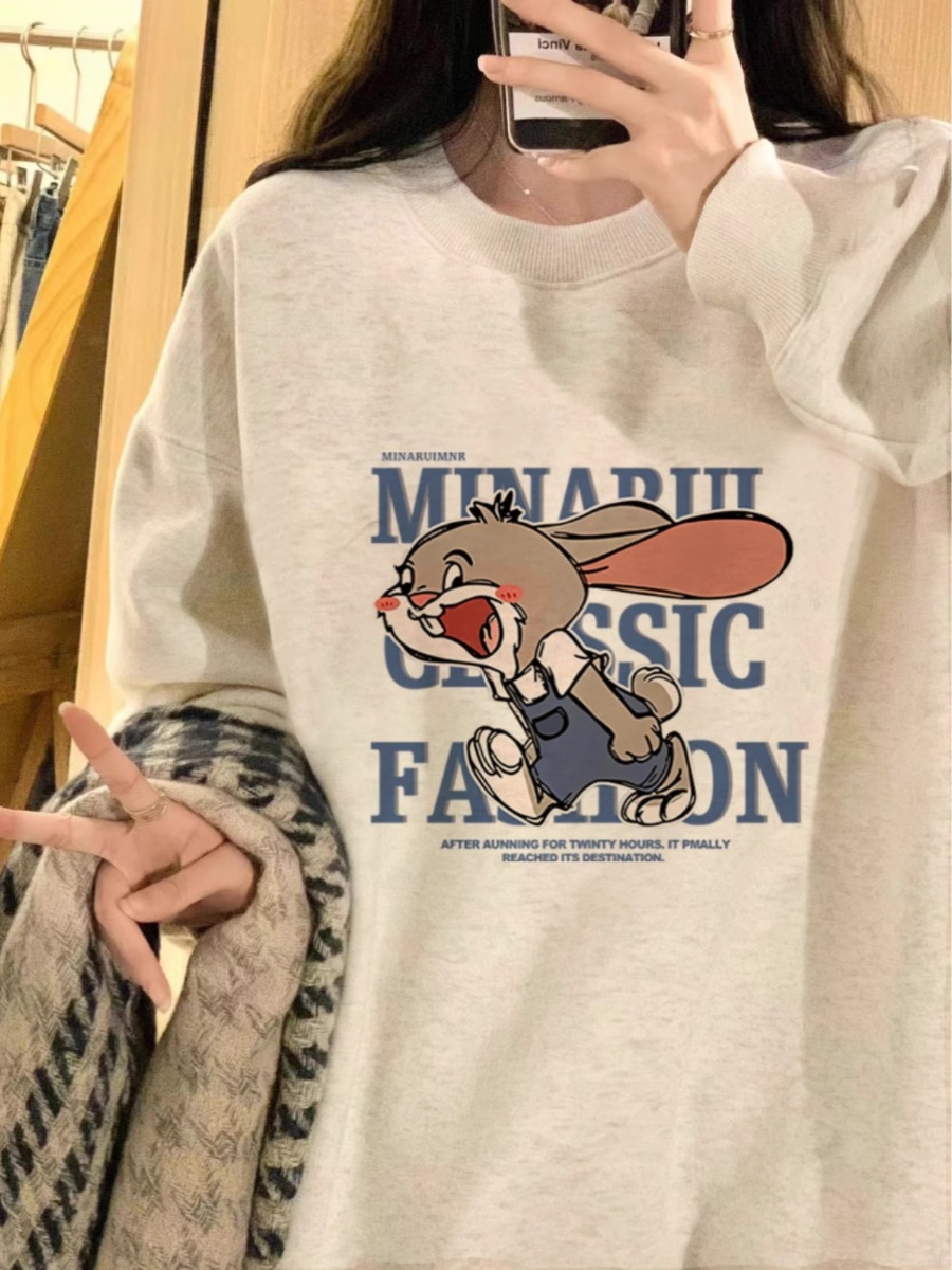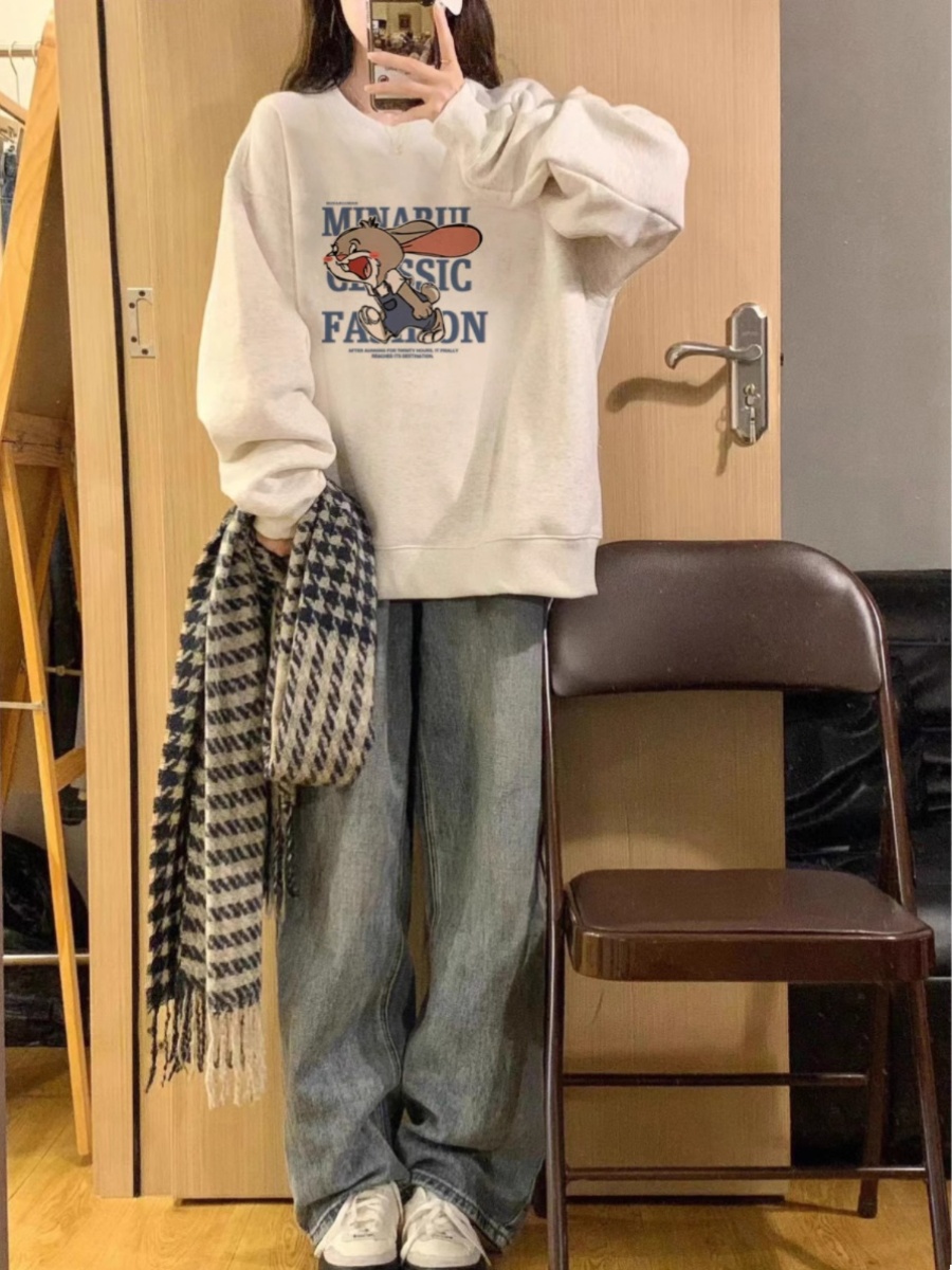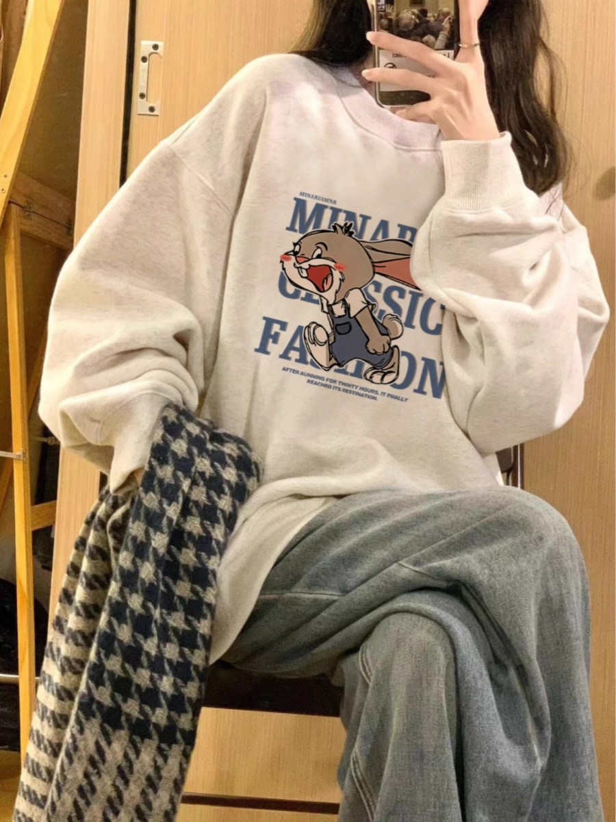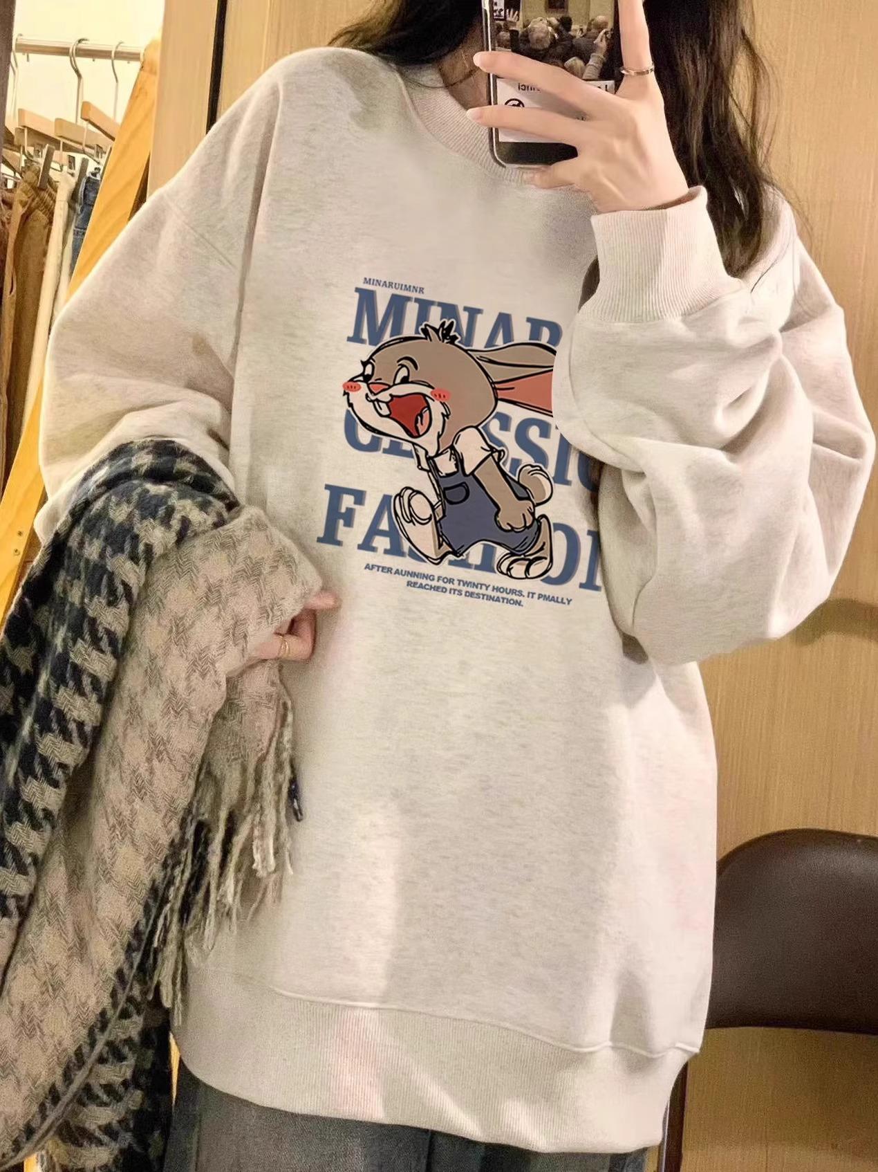 Gray Cartoon round Neck Sweatshirt Female Spring & Fall Loose Velvet Thickened American Retro Pure Cotton Stylish Top without Hood