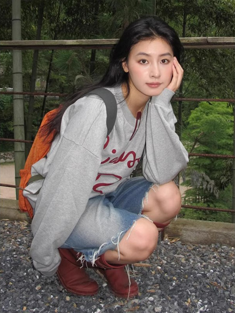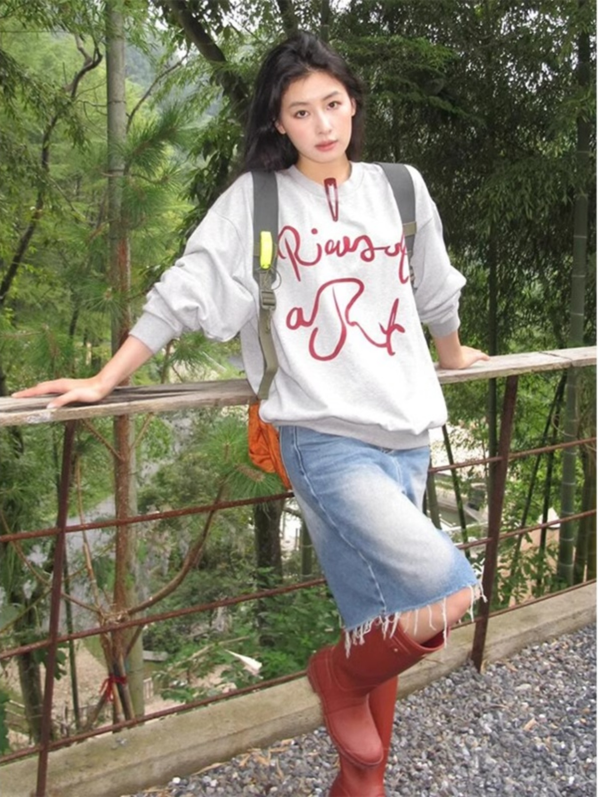 Gray Loose Feeling Sweatshirt Women's Spring and Autumn Contrast Color Letter Crew Neck Long-Sleeved Fleece Sweater Oversize Lazy Style Top