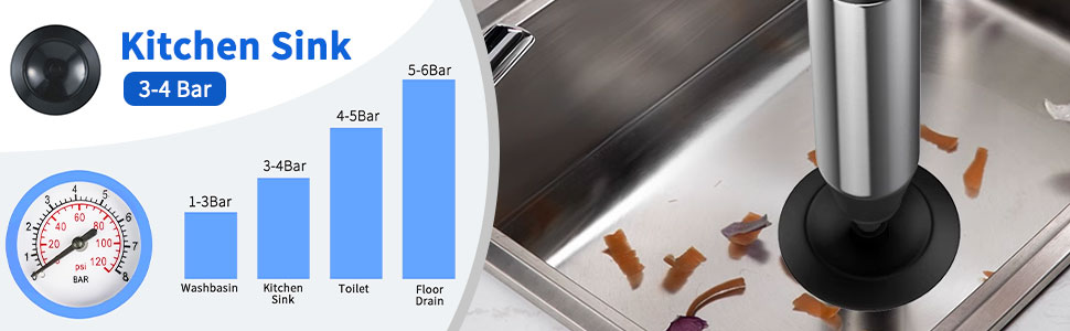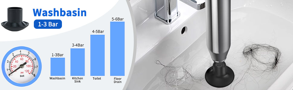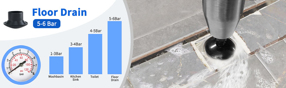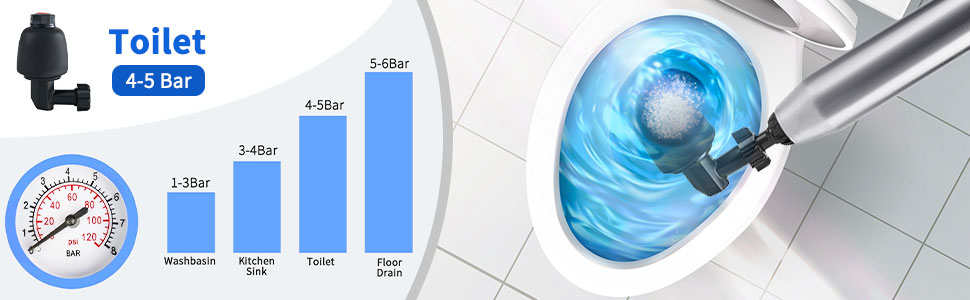 - REAL-TIME PRESSURE BAROMETER: Air pressure indicator of drain blaster allow you to know the real-time pressure while you are inflating, more convenience to adjust according to different requirments (0-8Bar), avoiding splashing and damage caused by excessive force, and truly humanized design.