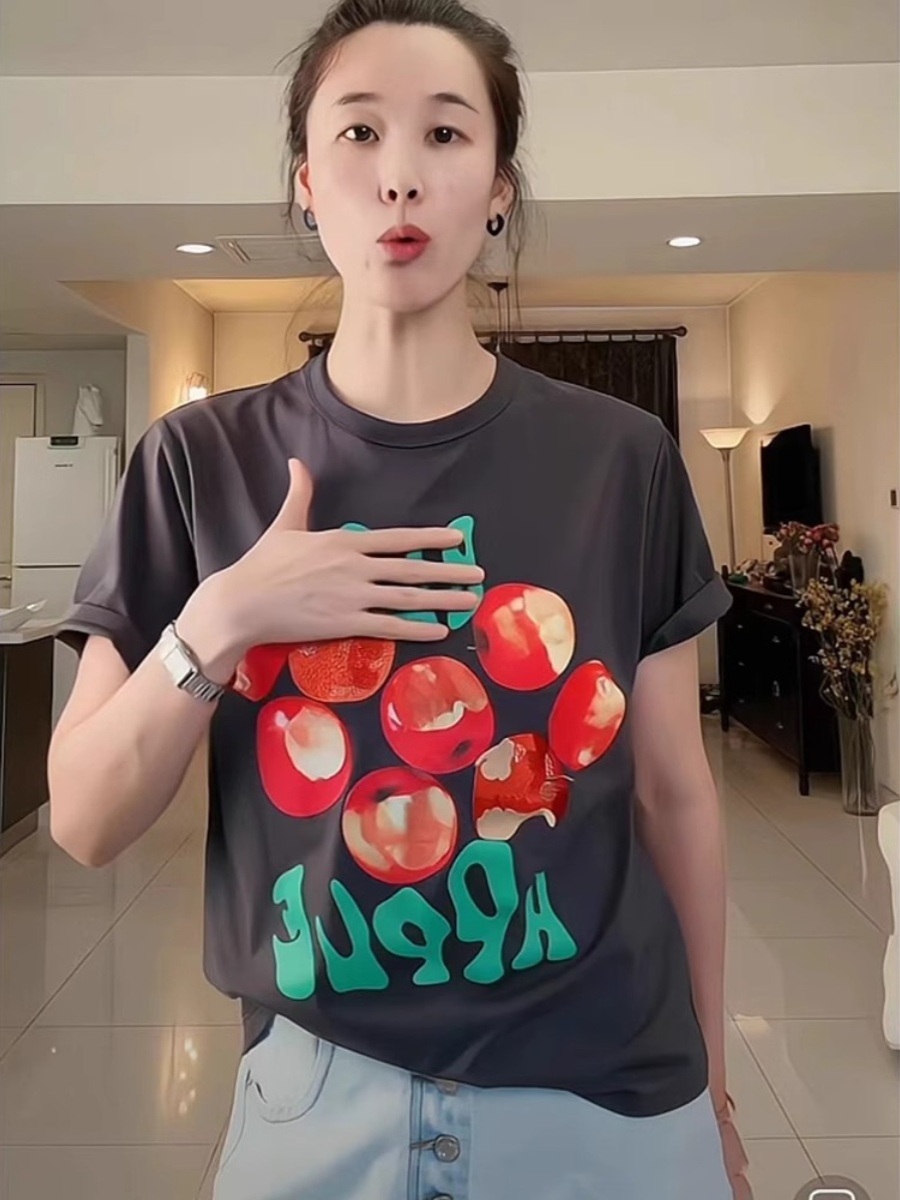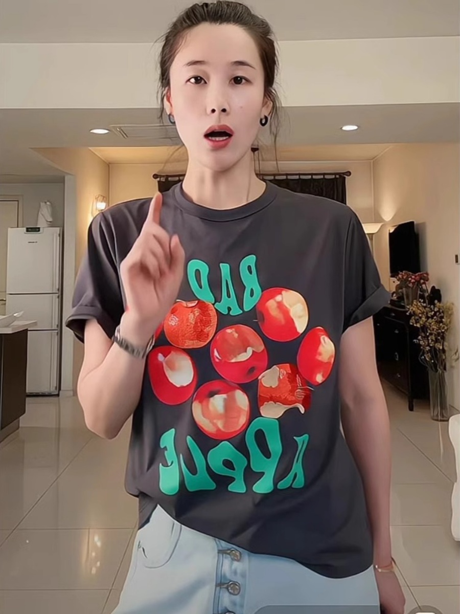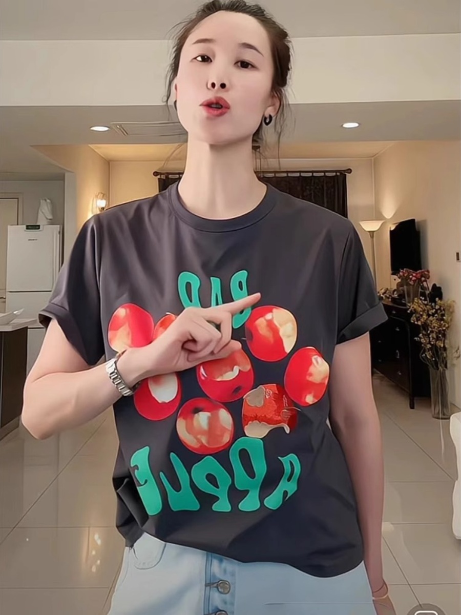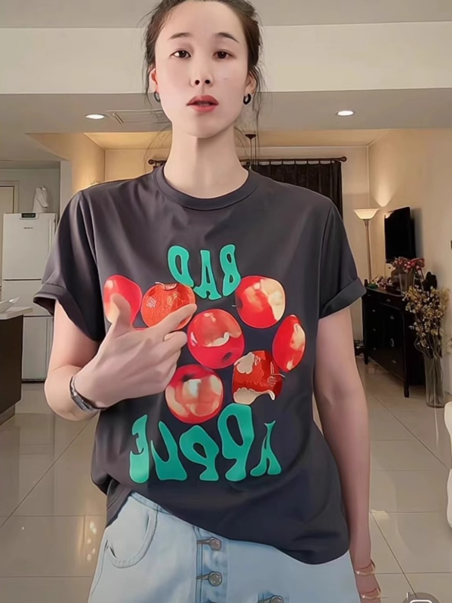 Hong Kong Style Retro Fun Bad Apple Print Short Sleeve Women's T-Shirt Summer Fashion All-Matching Loose Youthful-Looking Design Blouse