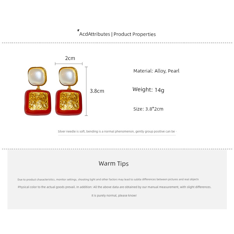 Hong Kong Style Retro Red Drop Oil Square Pearl Stud Earrings Accessible Luxury Fancy Elegant Generous Earrings New Arrival Exaggerated Earrings