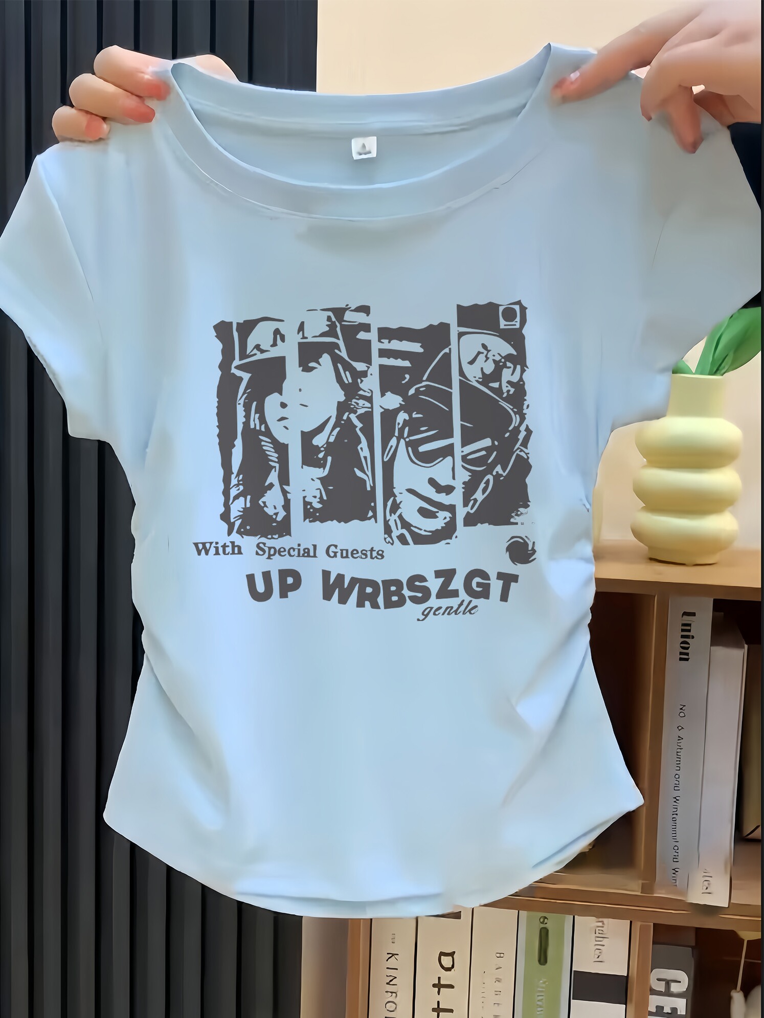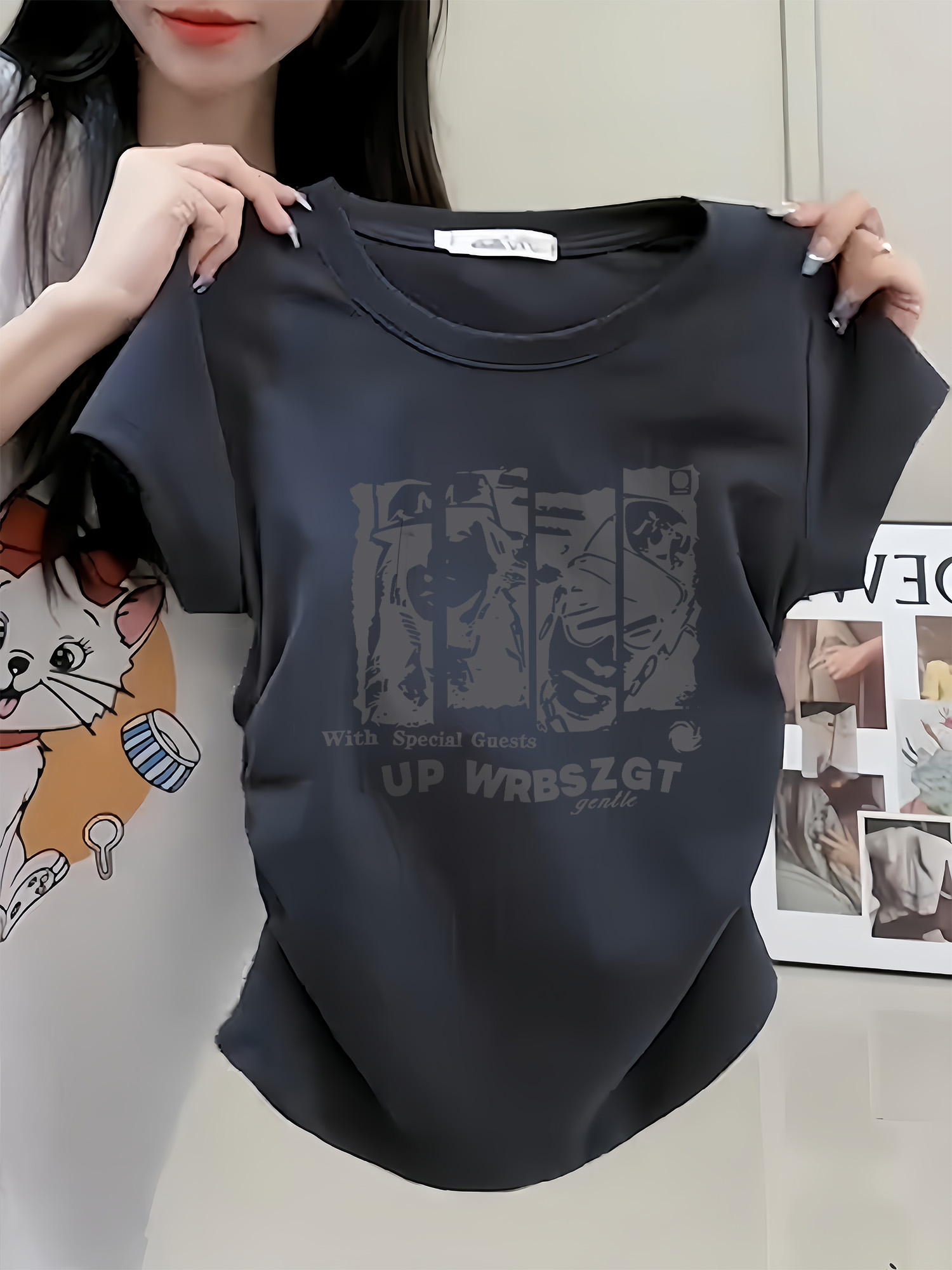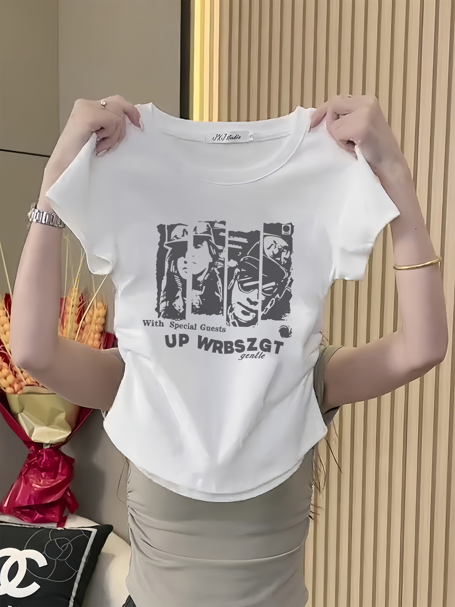 Hot American Short Silm Pure Cotton Print Tops Women's Summer 2025 New Arrival Shoulder round Neck Short Sleeve T-shirt Fashion