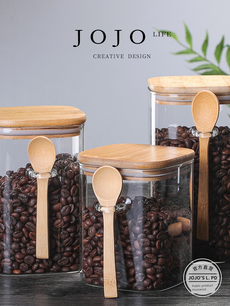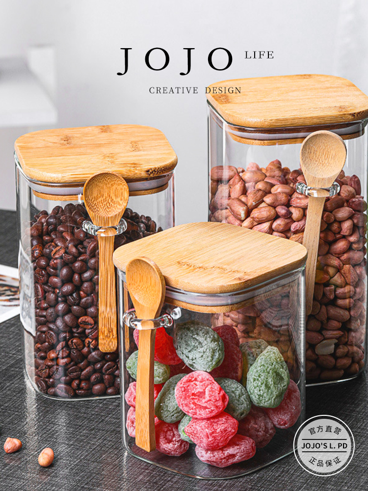 Jojo's L. Pd. Bait. Square Glass Sealed Can For Home Storage Tank with Wooden Spoon Kitchen | Bait