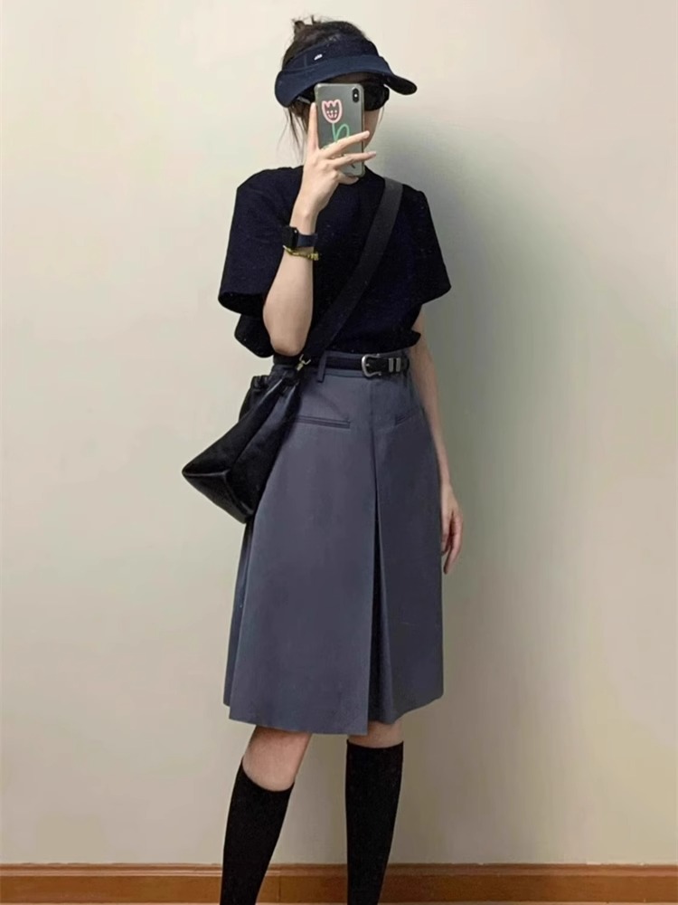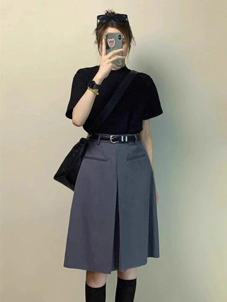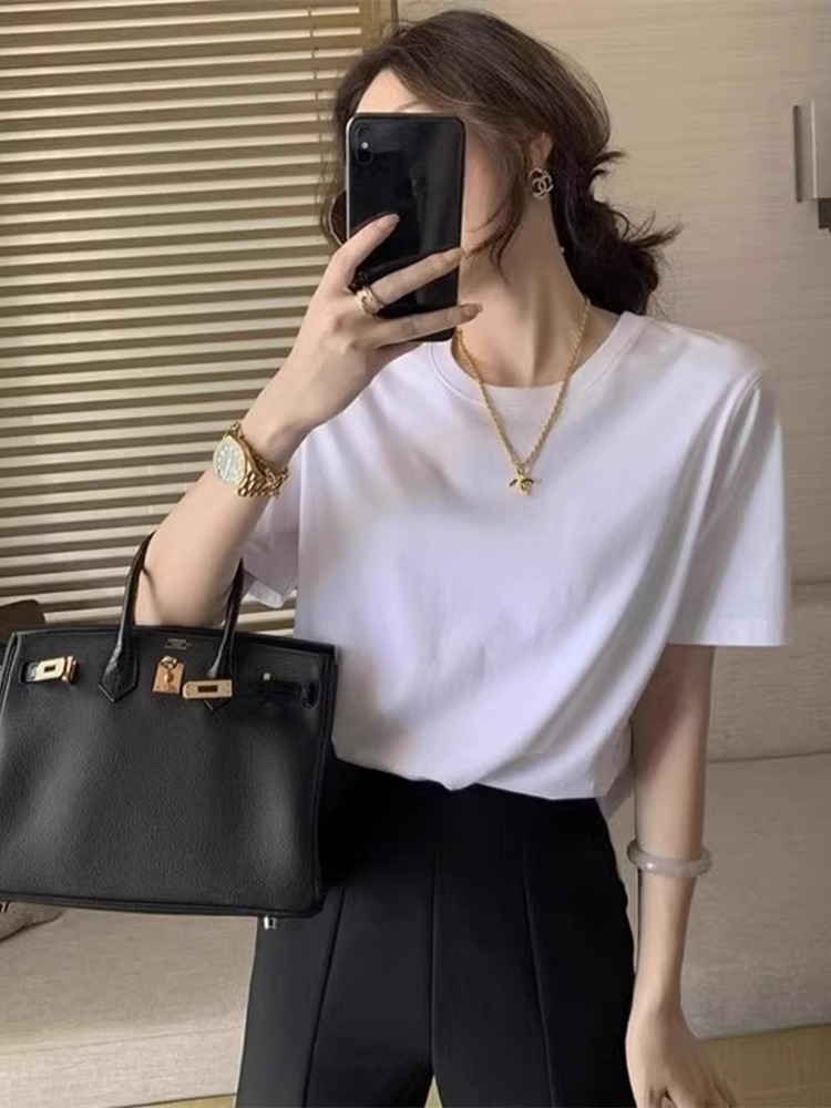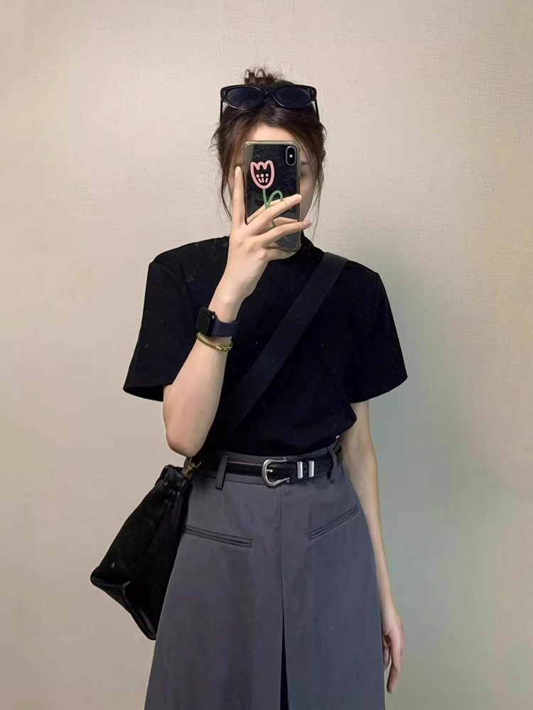 K-style Black round Neck Shoulder Short Sleeve T-Shirt Women's Summer Thin Loose Slim Looking Casual T-shirt Fancy Tops