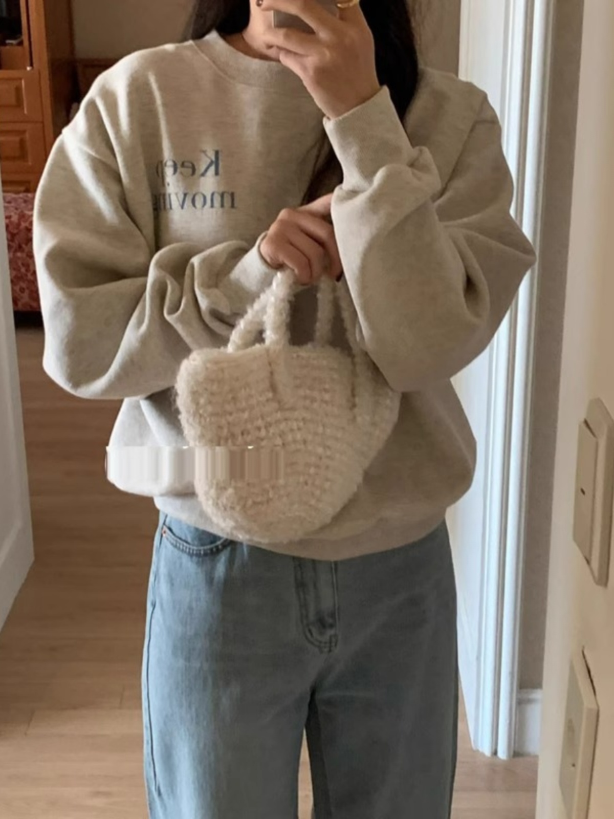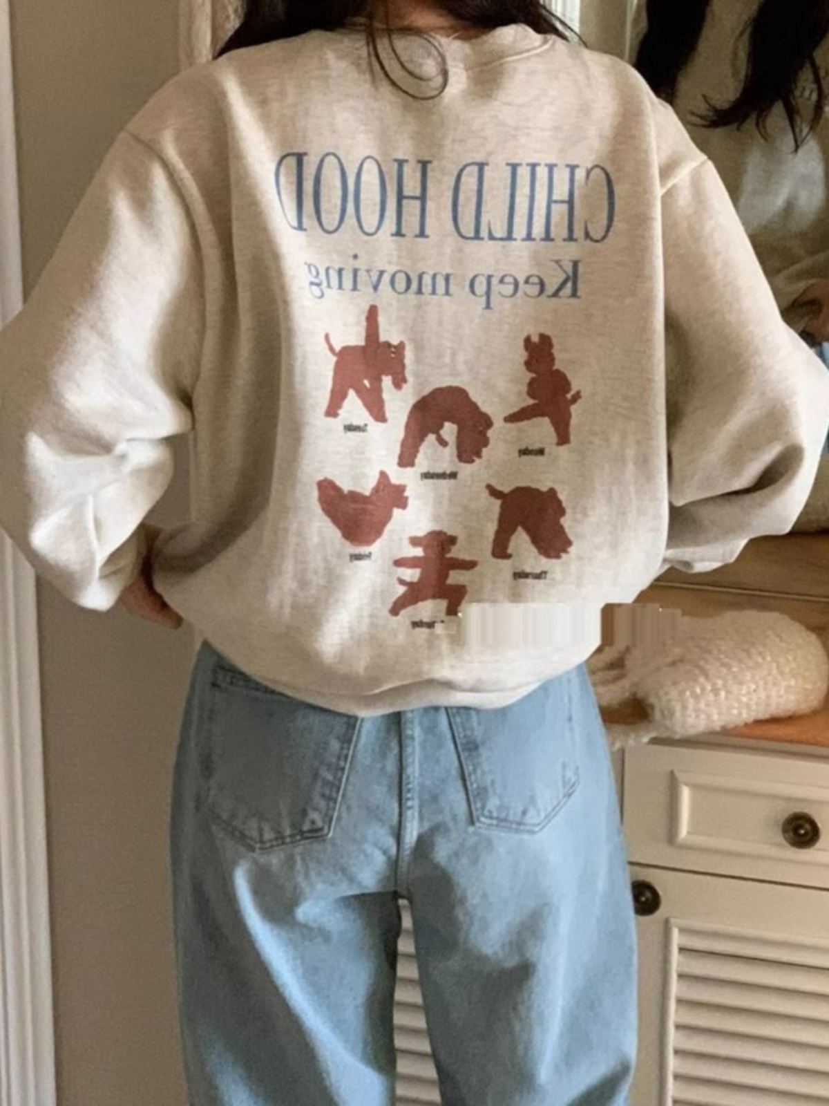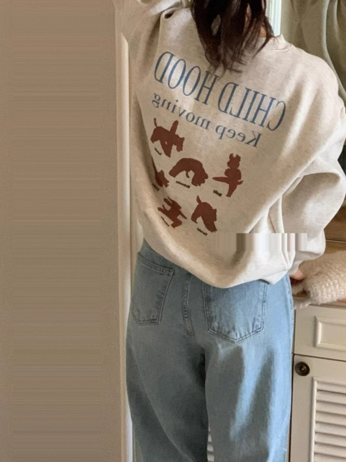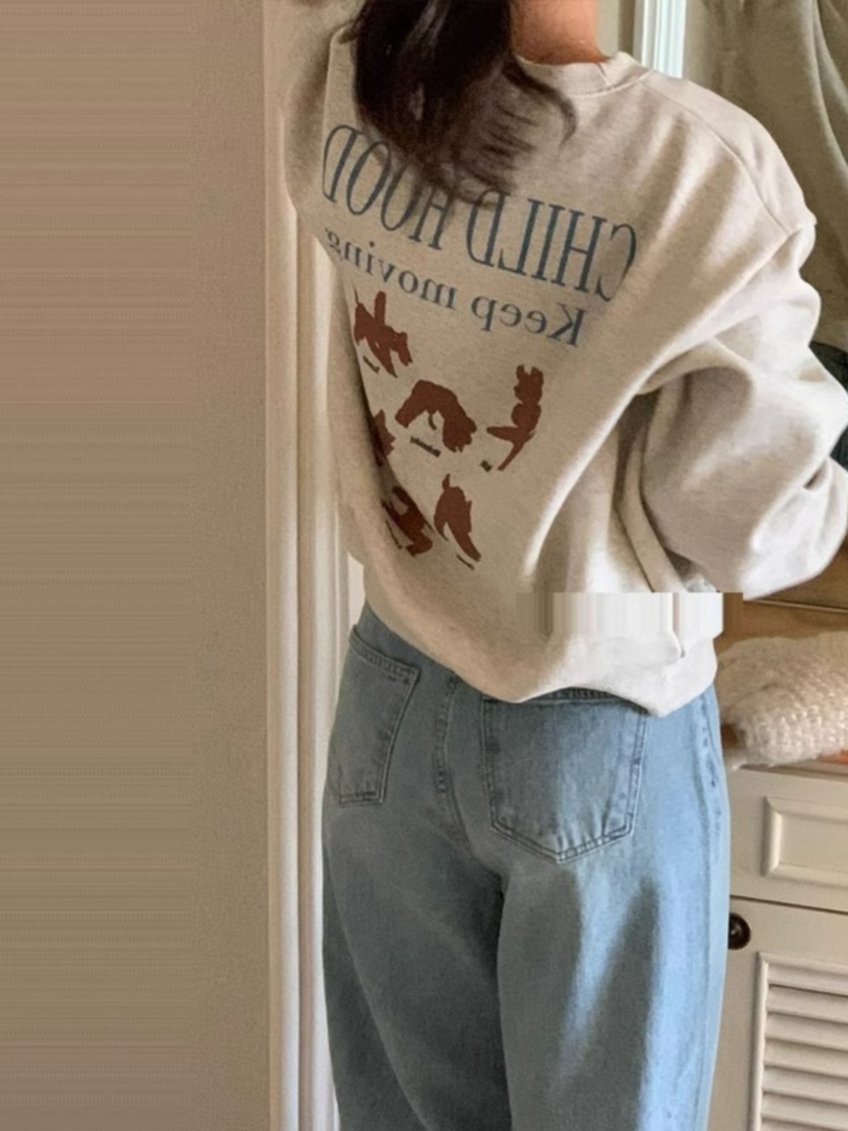 K-style Fleece-lined Thickened Cartoon Printed Crew Neck Sweatshirt Female Spring & Fall Stylish Niche Style Loose Casual Long Sleeves Tops