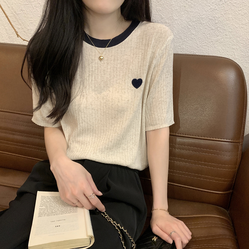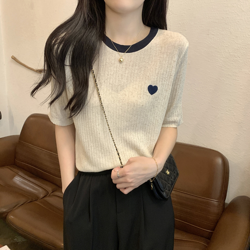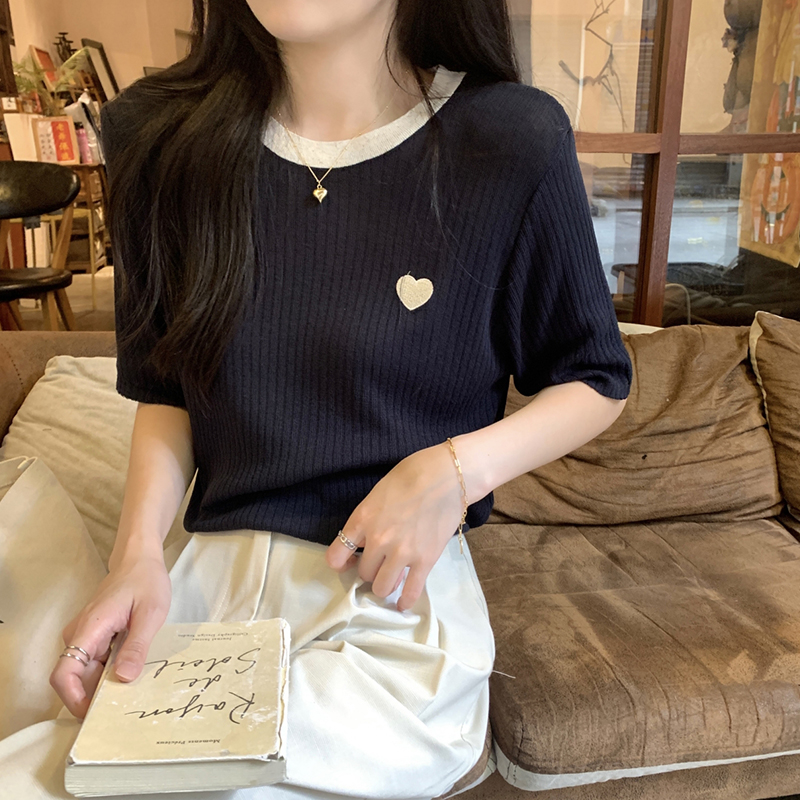 K-style Heart Embroider Contrast Color round Neck Short Sleeve Knitwear Women's Summer Retro Slimming Silm Shoulder Short Tops