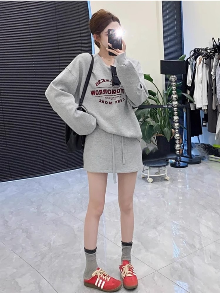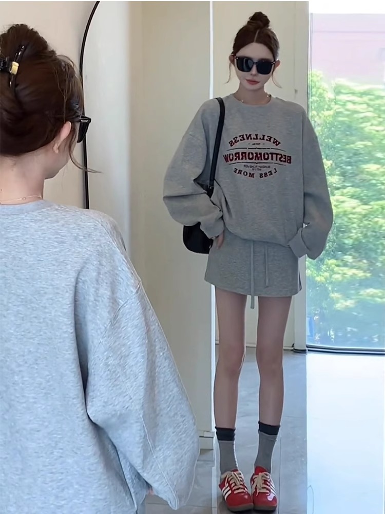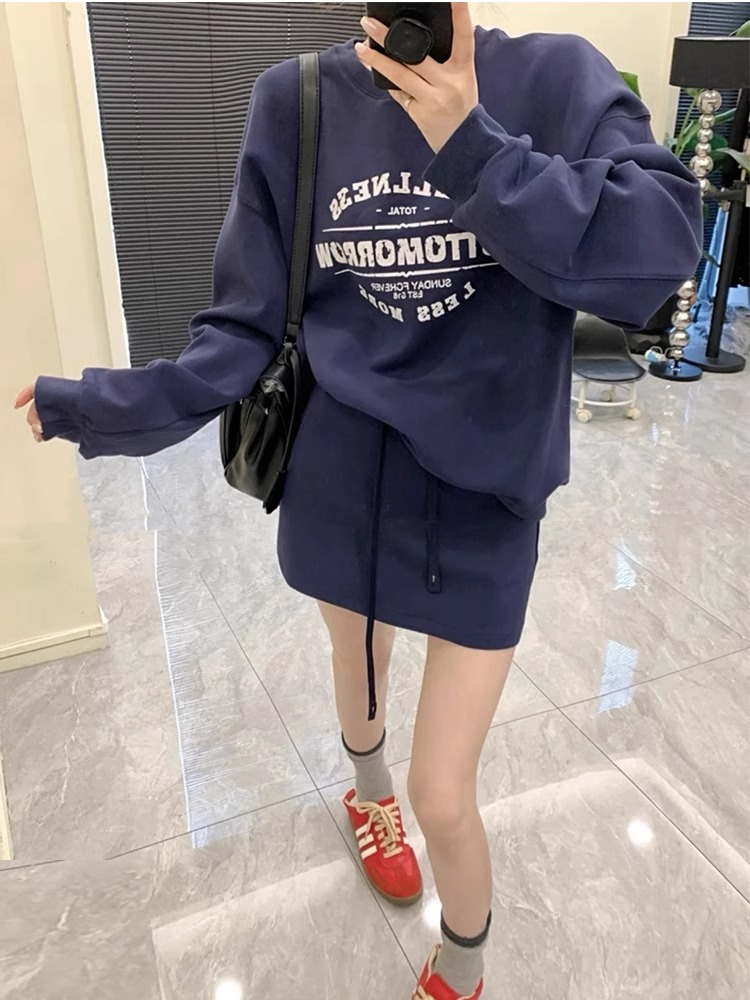 Korean Style Contrast Color Letters Sweatshirt Two-piece Set Fashion Elegant Loose-Fitting Slim-Fit Pullover Sweatshirt Female High Waist Short Skirt Suit