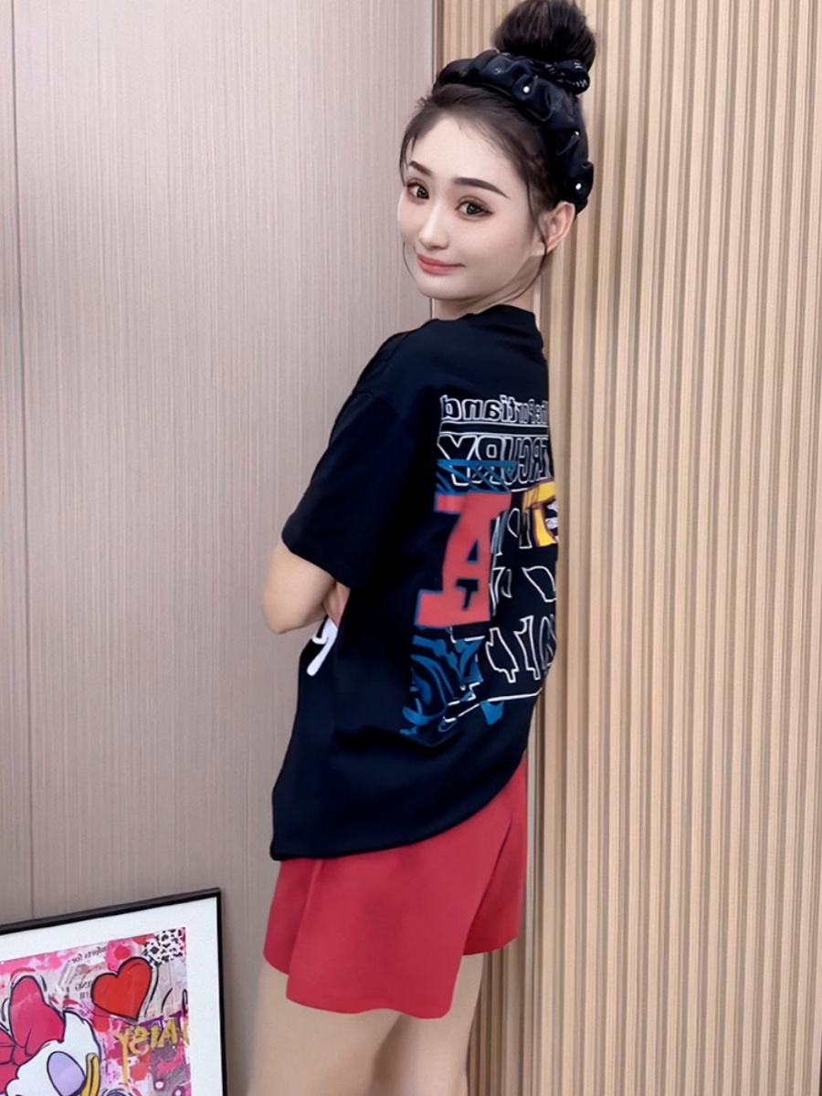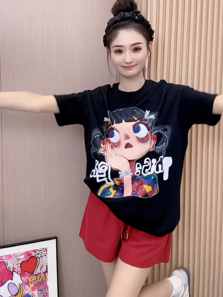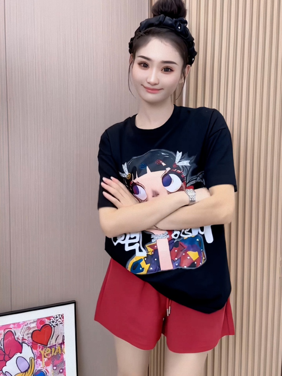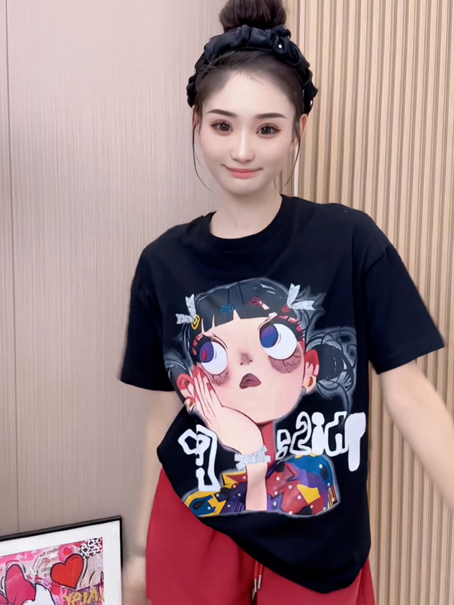 Korean Style Pure Cotton Little Girl Print Short Sleeve T-shirt Female 2025 Summer New Arrival Best Selling Loose Show Thin Black Tops