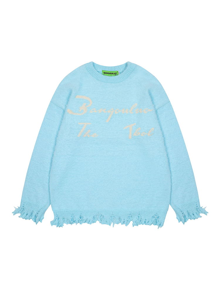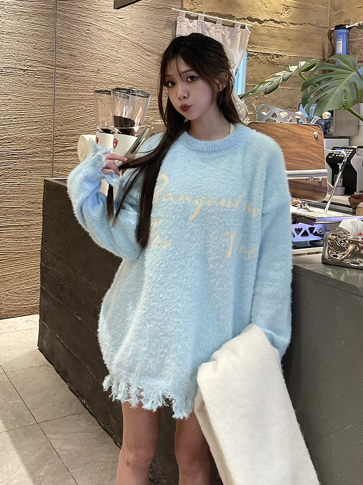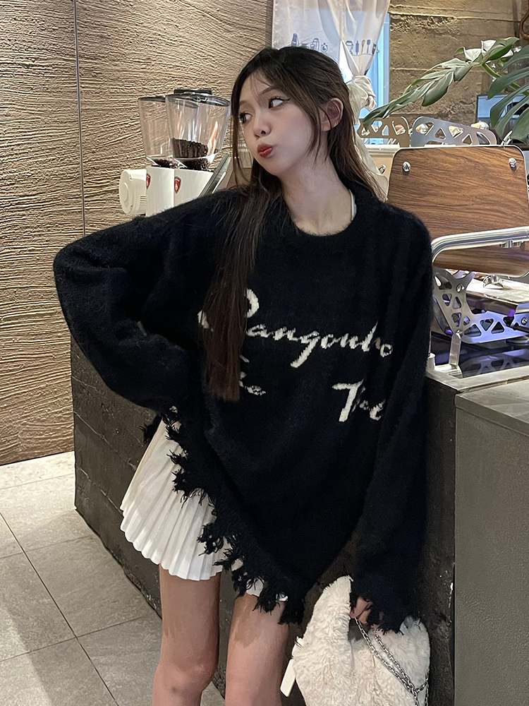 Korean Style Soft Glutinous Letter Jacquard round Neck Sweater Women's Autumn Idle Style Loose BF Easiest for Match Hem Worn Knitwear