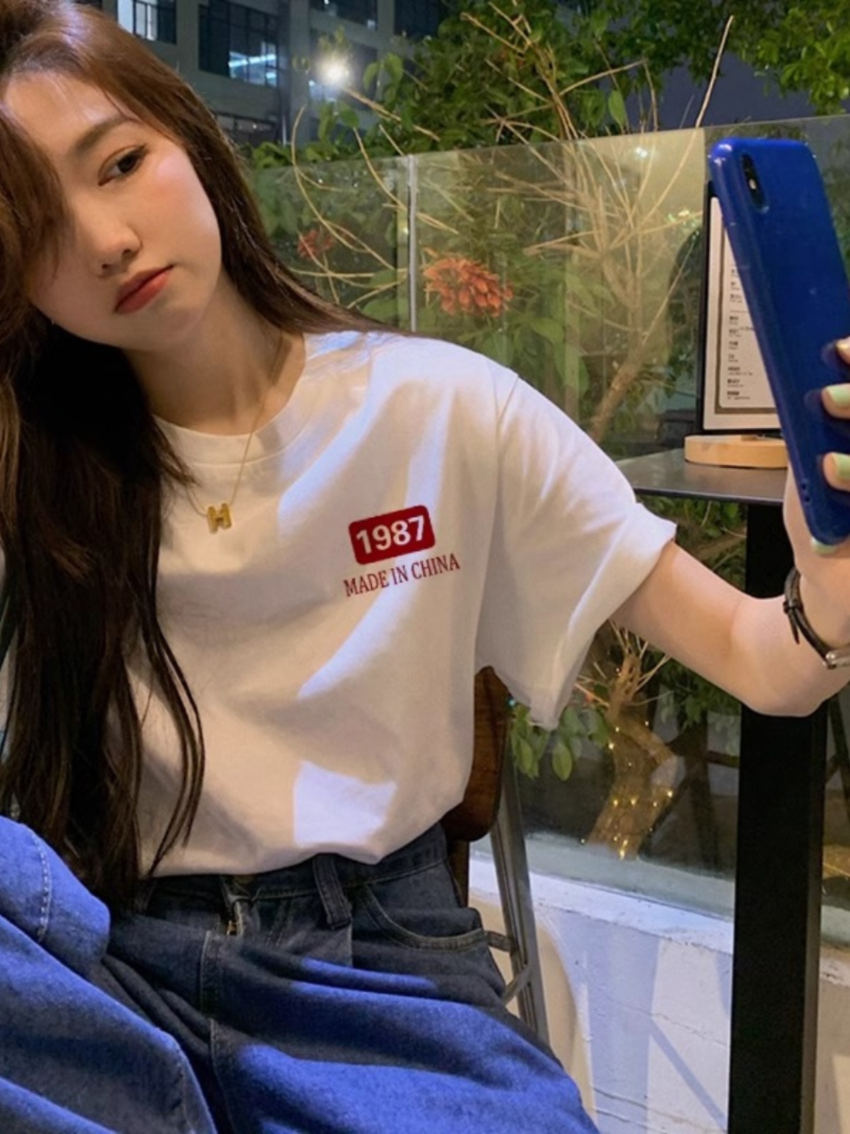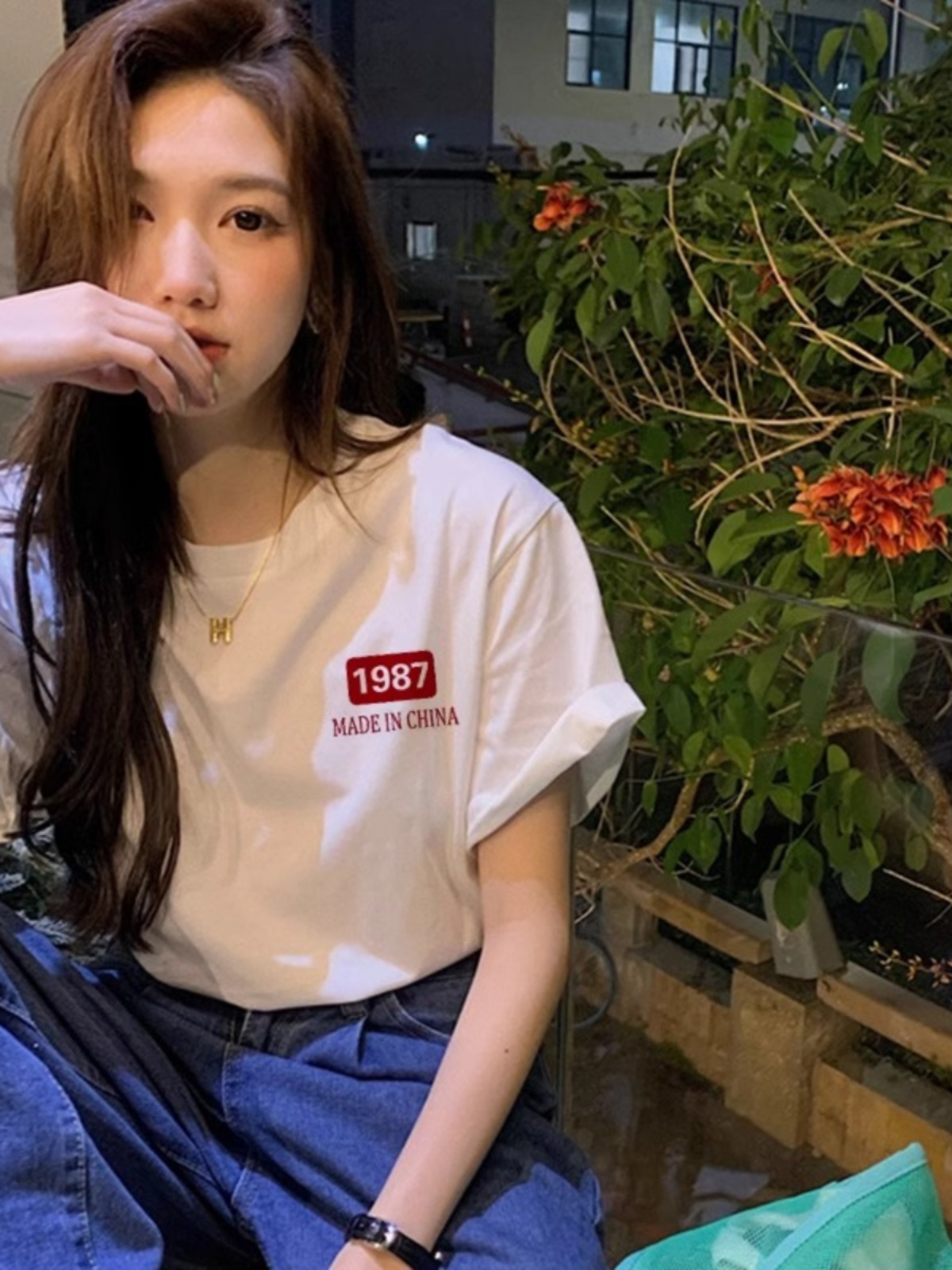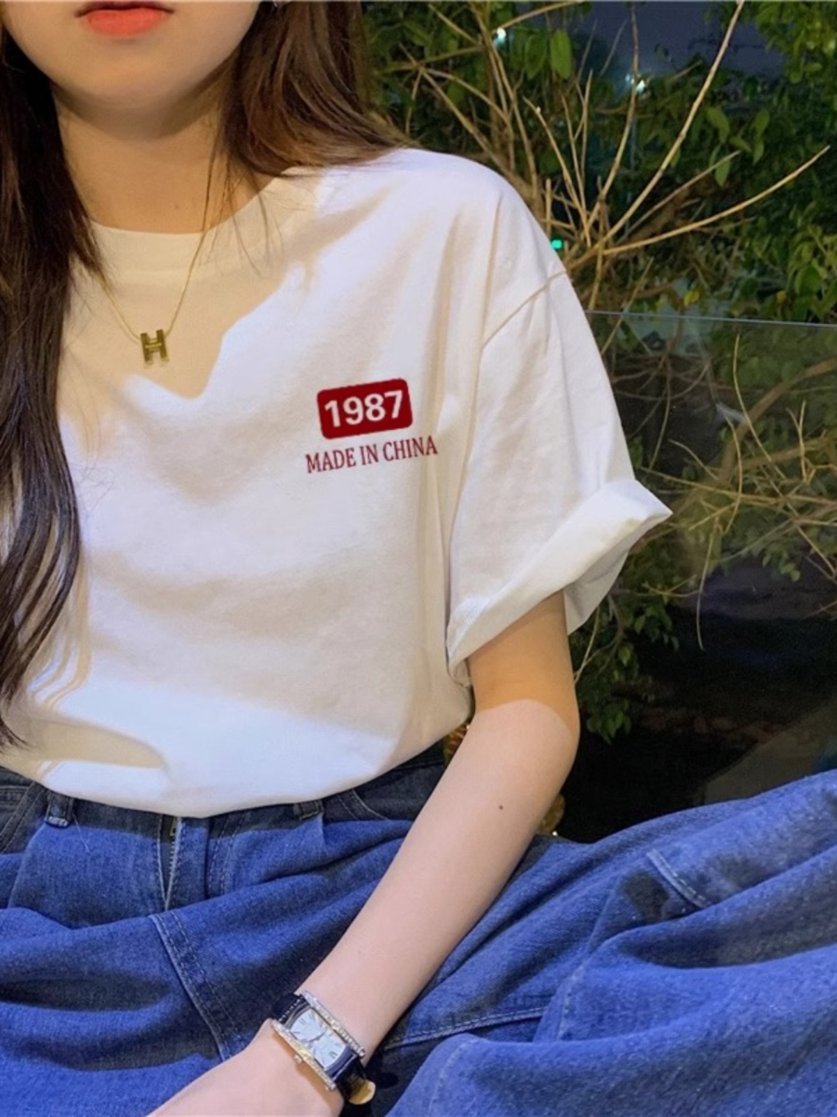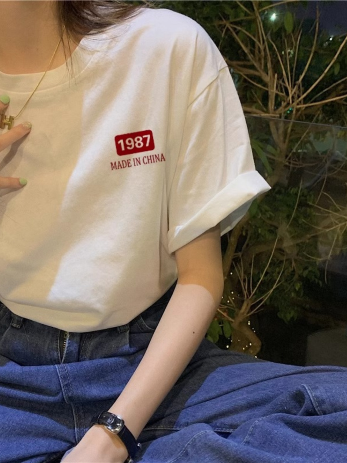 Loose White T-shirt Women's Clothing Pure Cotton Short Sleeve Summer 2025 Hong Kong Style Chic Retro Printed Half Sleeve Shoulder Tops