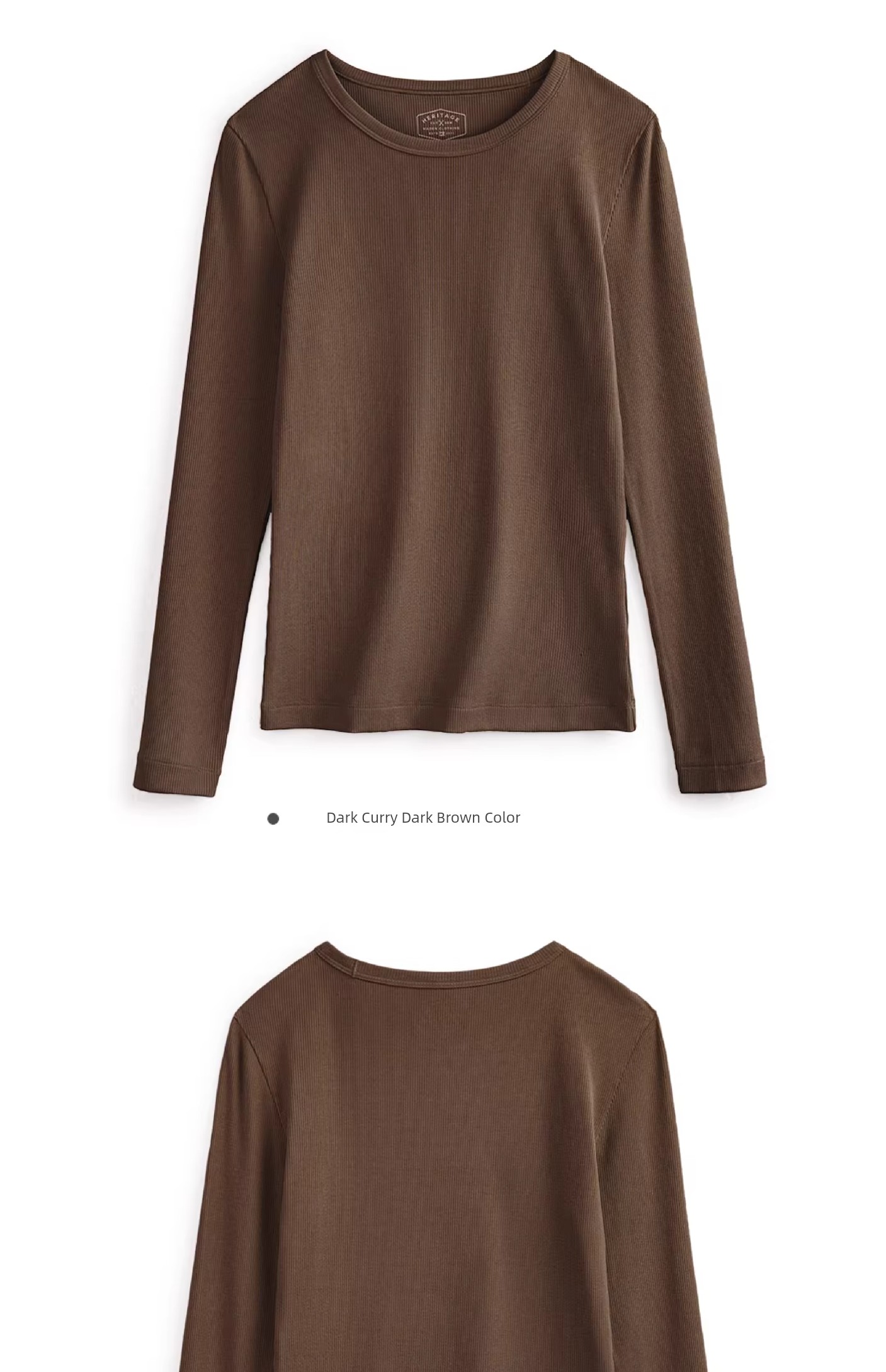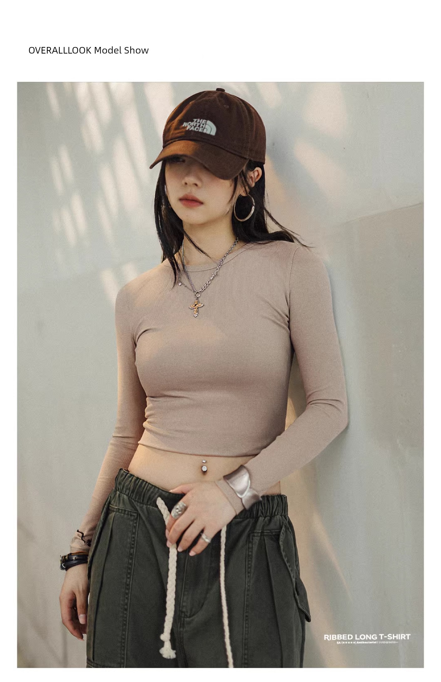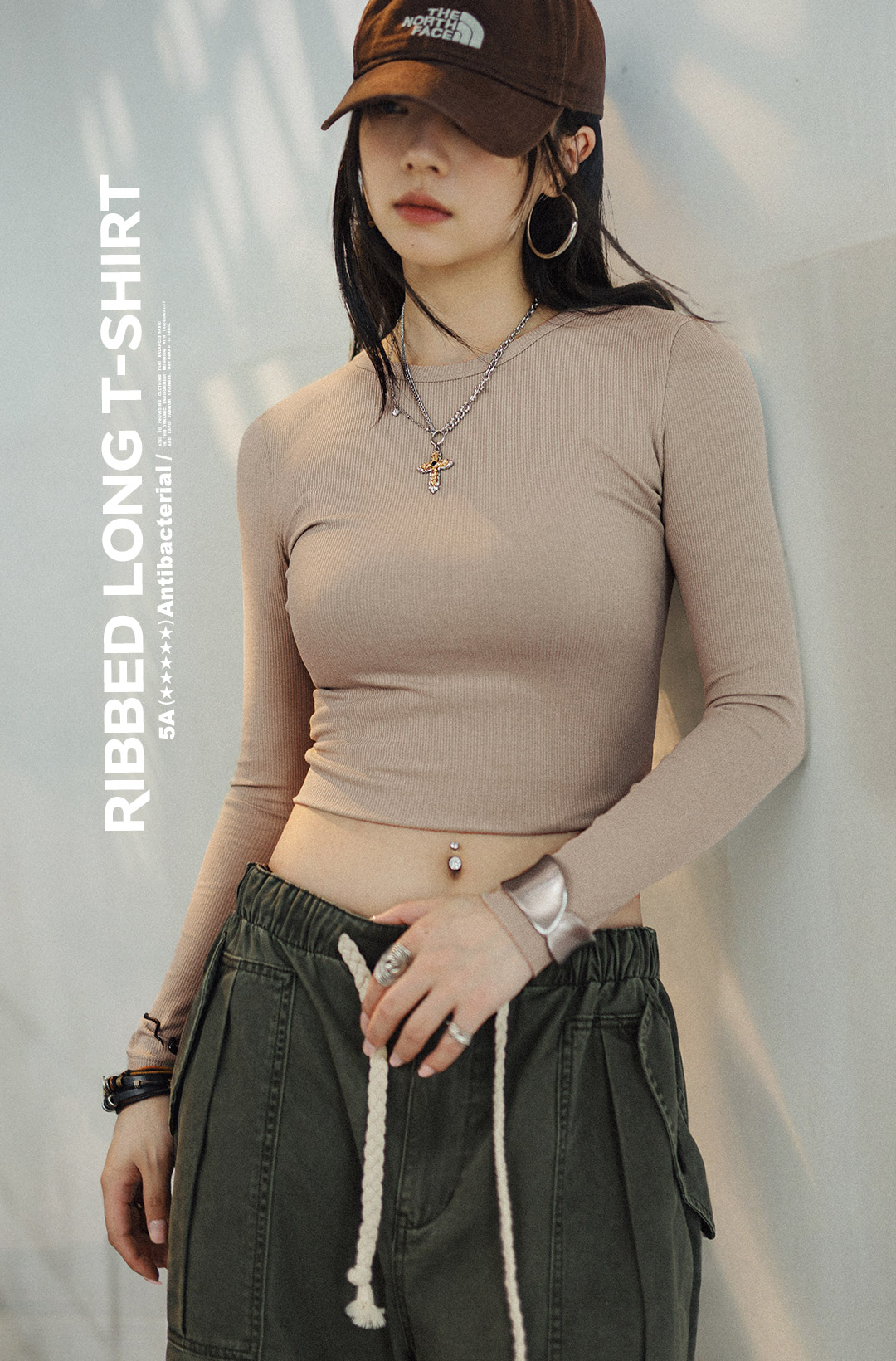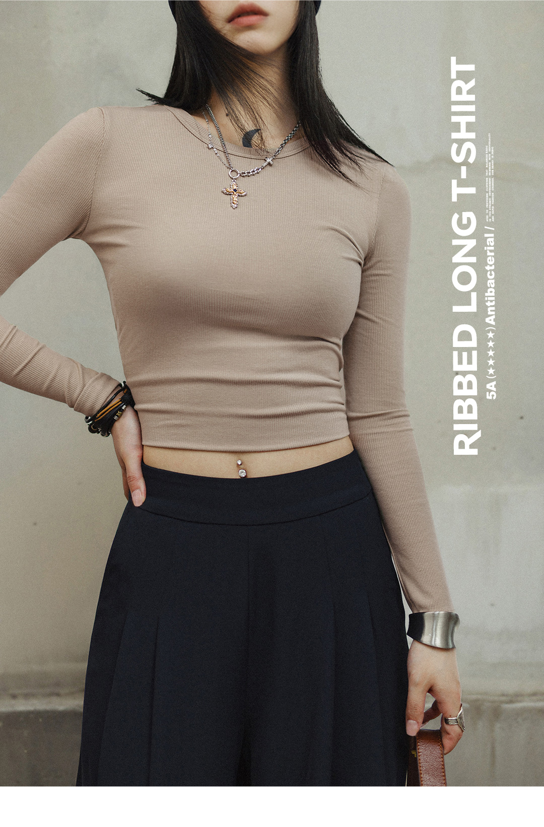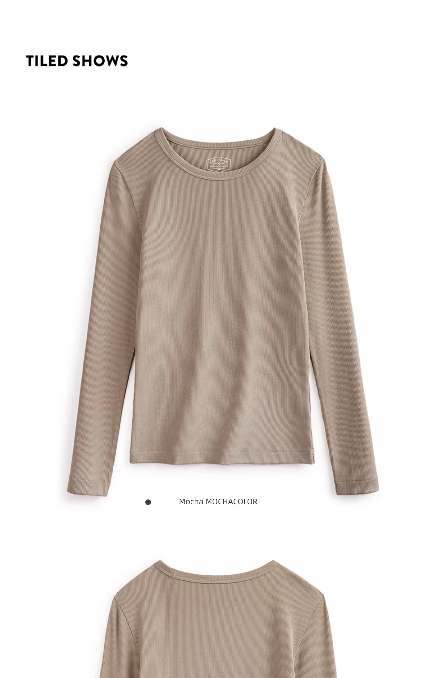 Madden Rib Knitting Figure-Flattering Long Sleeves T-Shirt Solid Color Inner Wear Mask T Silm Base Shoulder Tops Spring & Fall Women