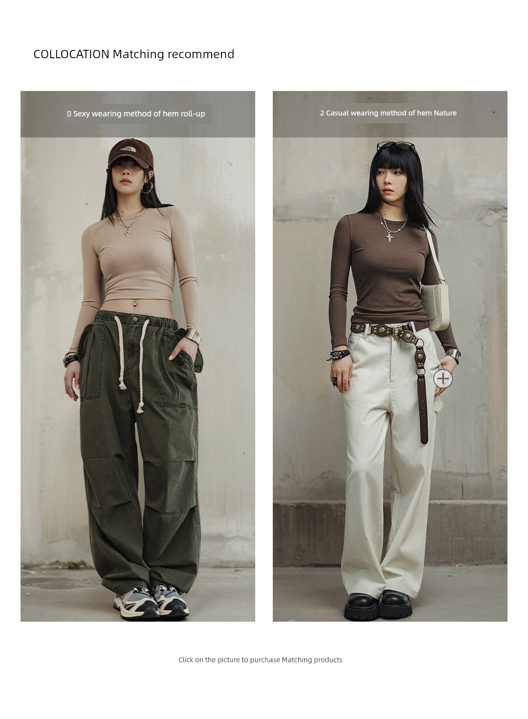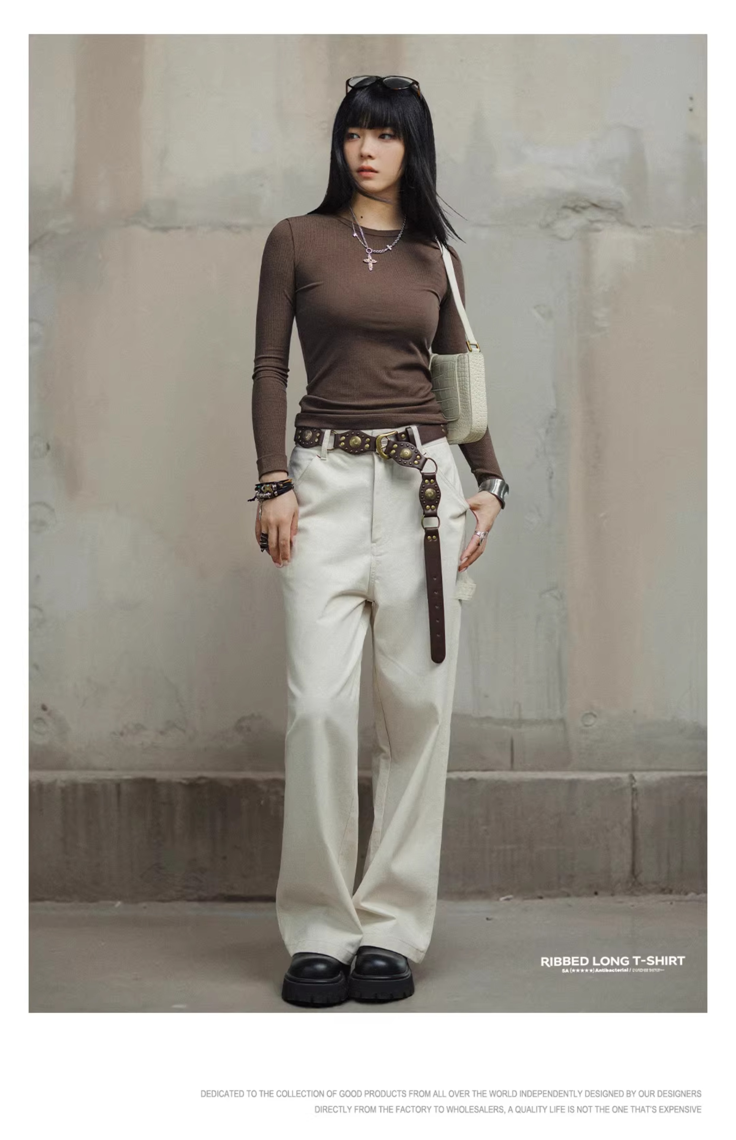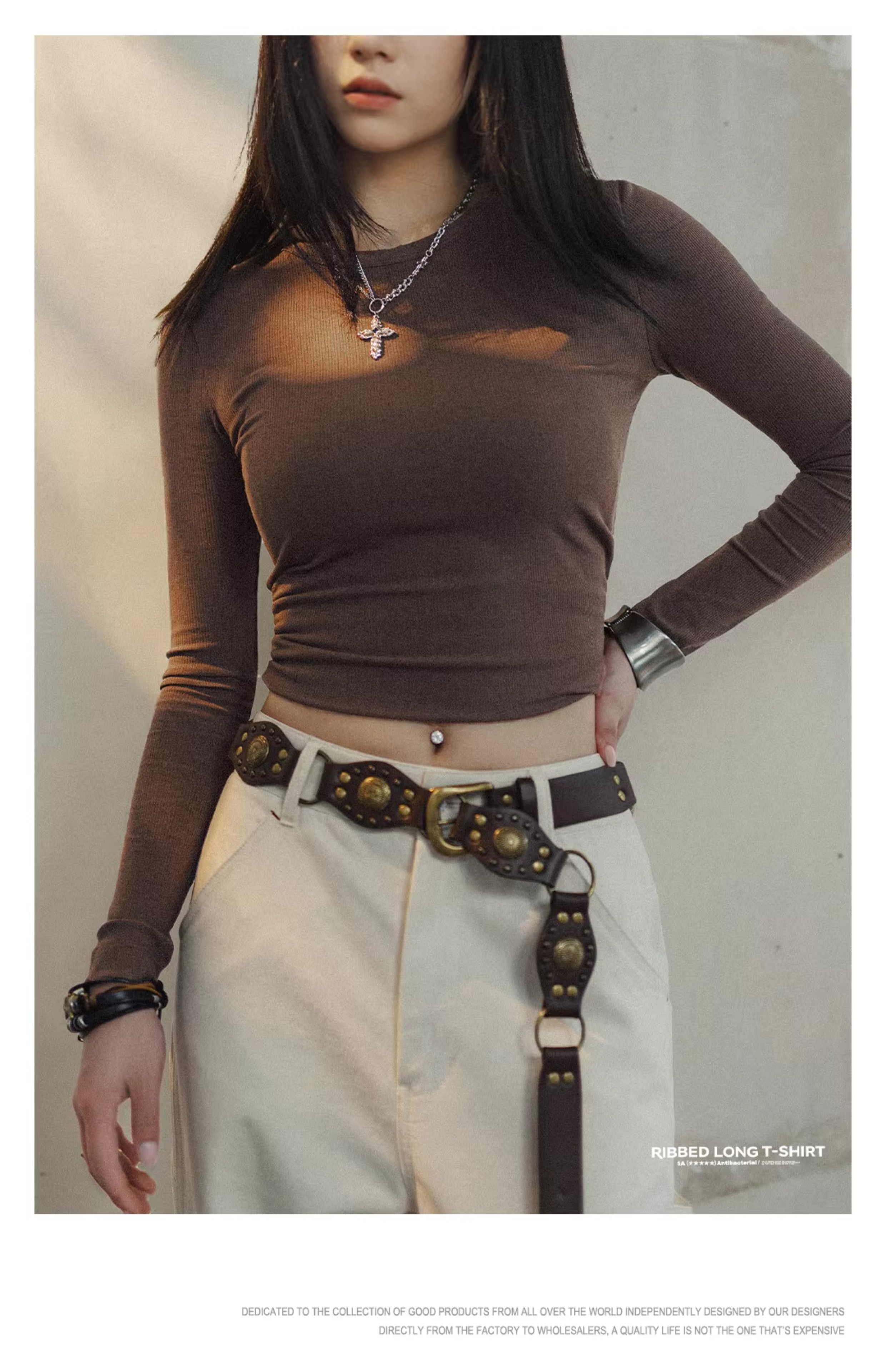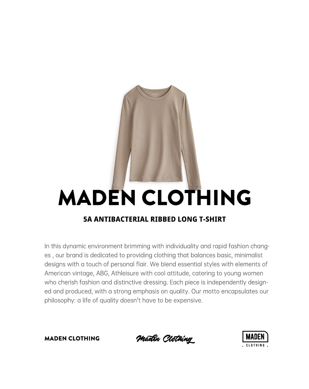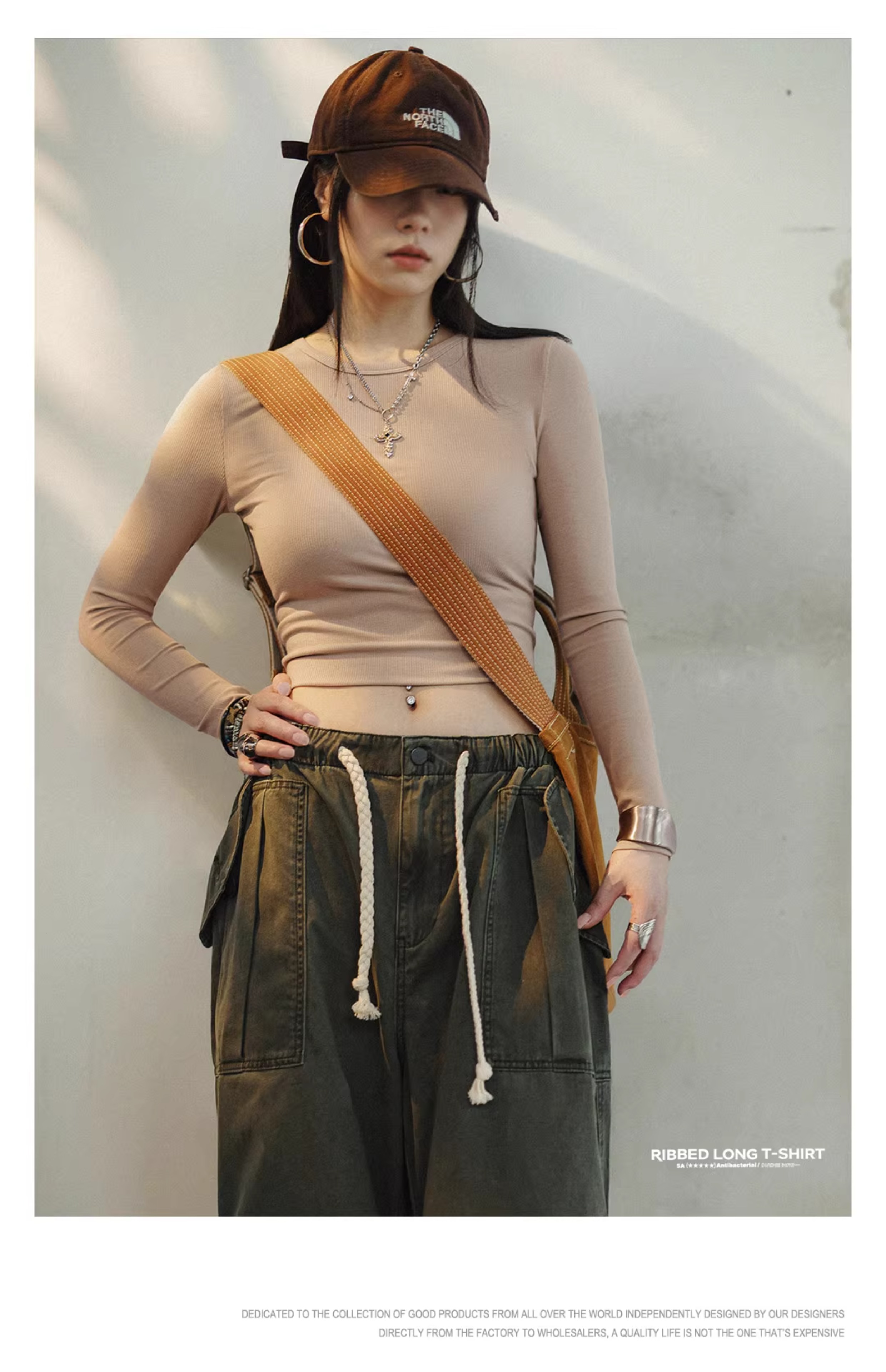Madden Rib Knitting Figure-Flattering Long Sleeves T-Shirt Solid Color Inner Wear Mask T Silm Base Shoulder Tops Spring & Fall Women