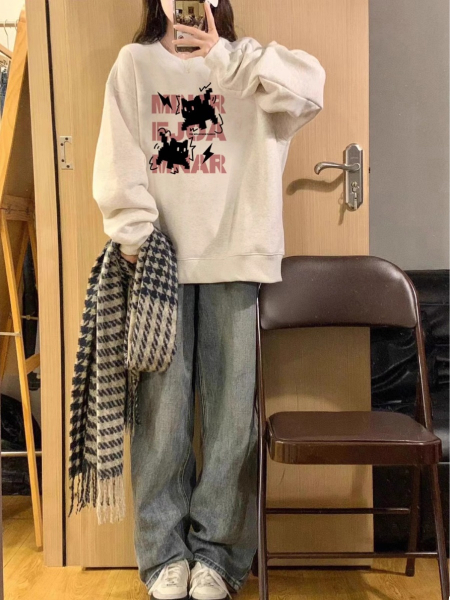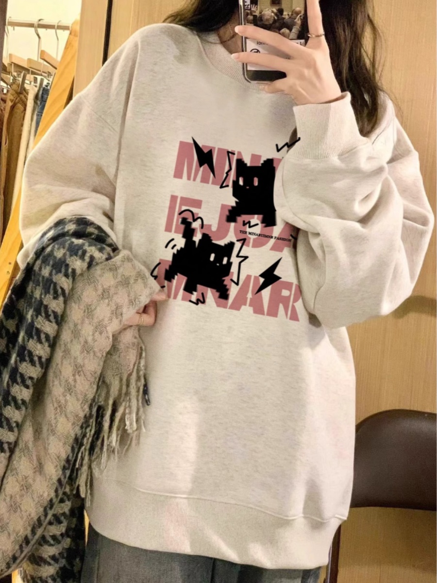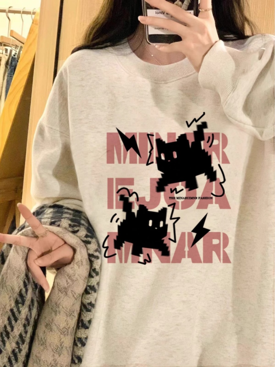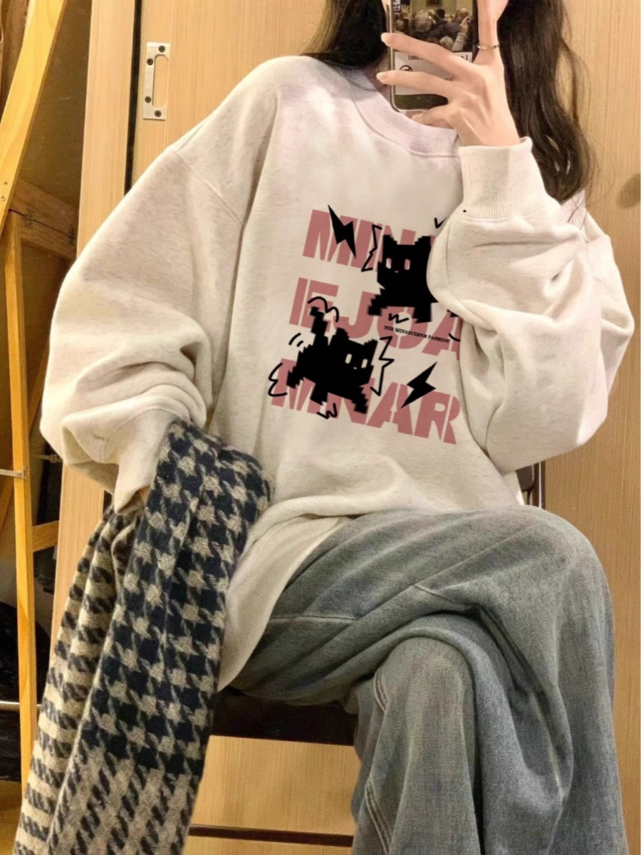 Melange Gray round Neck Heavy Weight Cat Long Sleeves Sweatshirt Women's Spring and Autumn Loose Velvet Thickened Pure Cotton Top without Hood