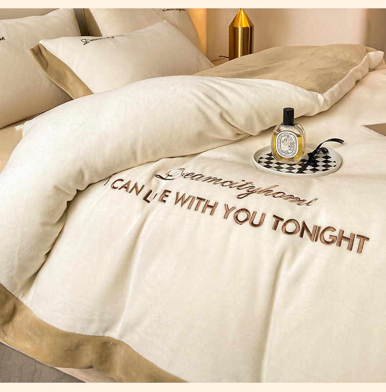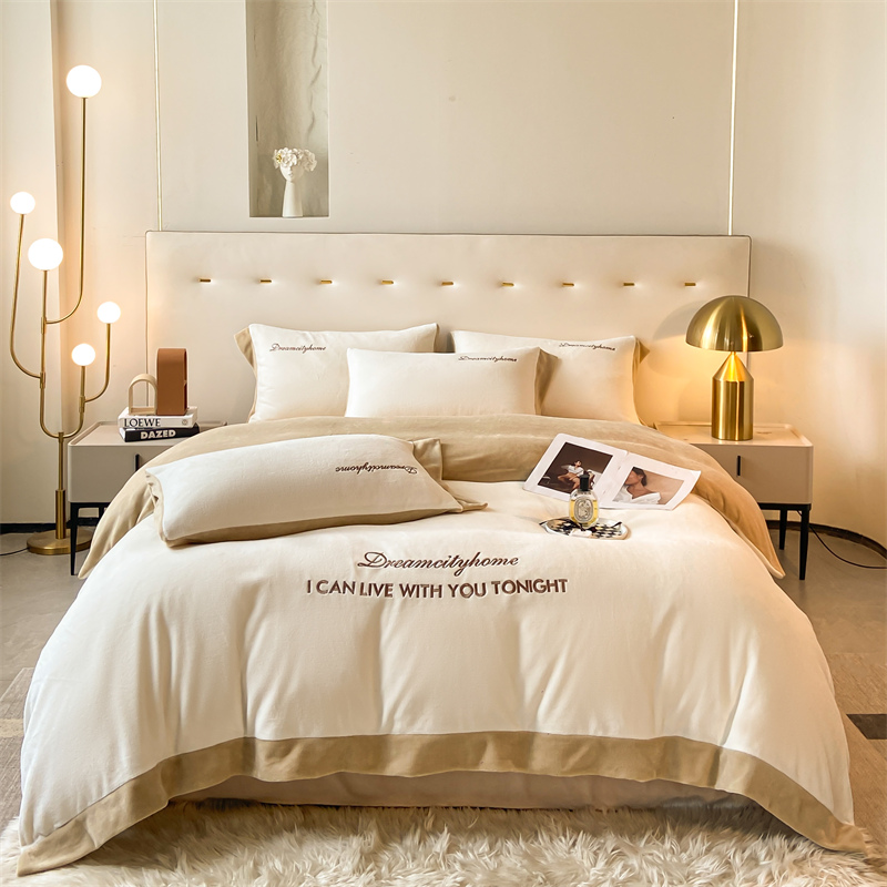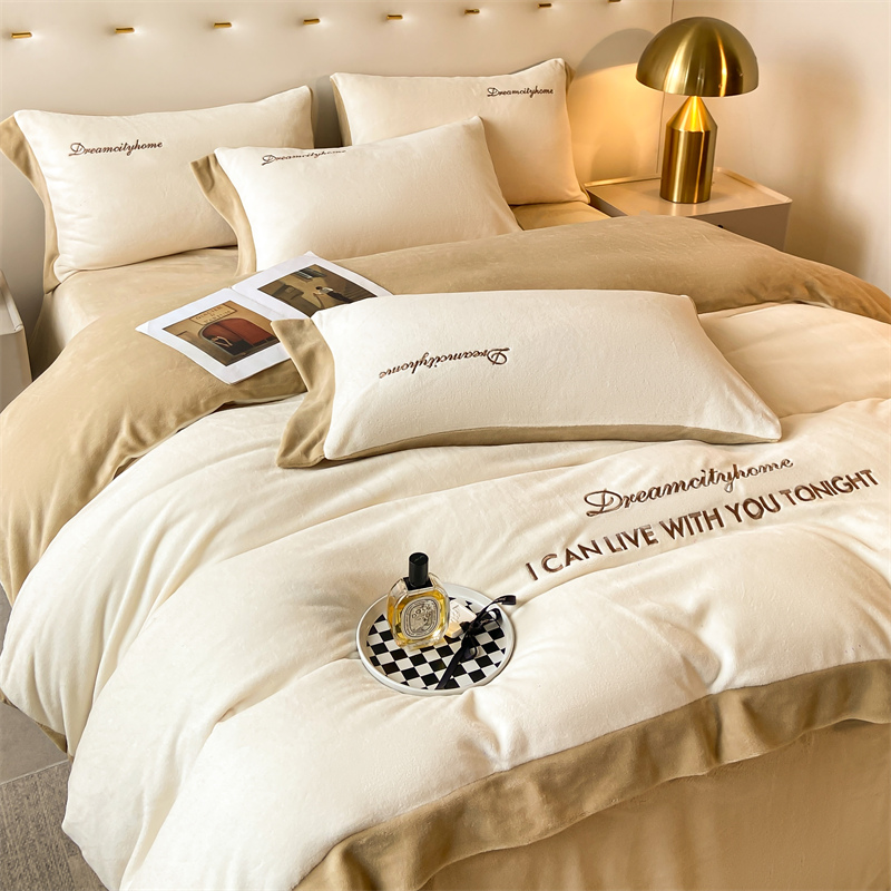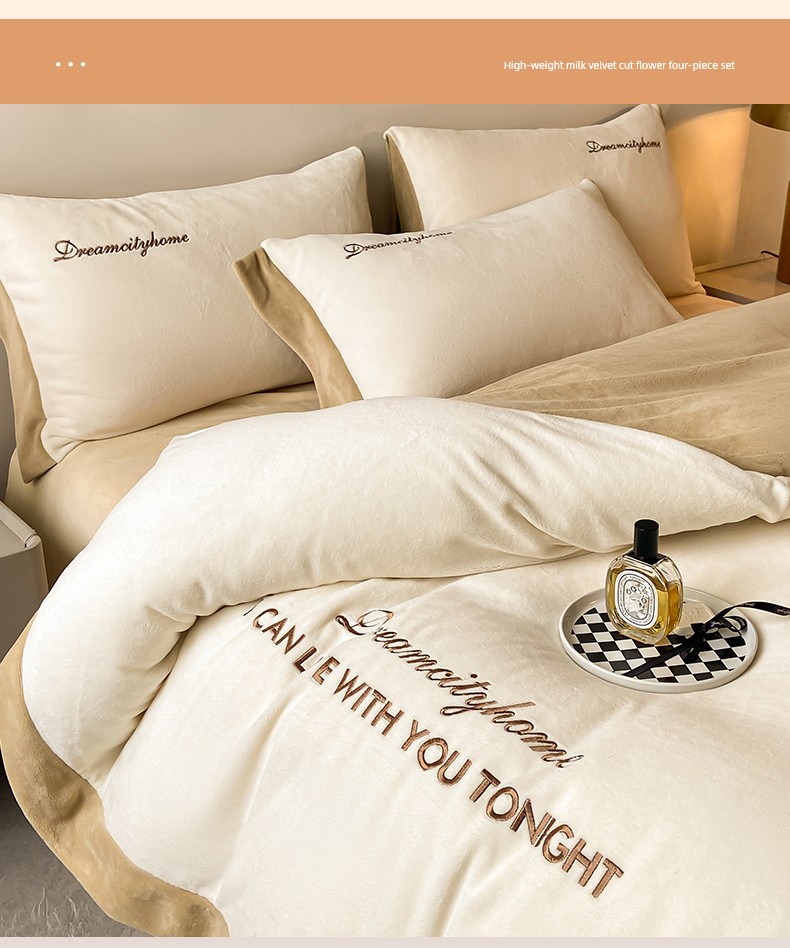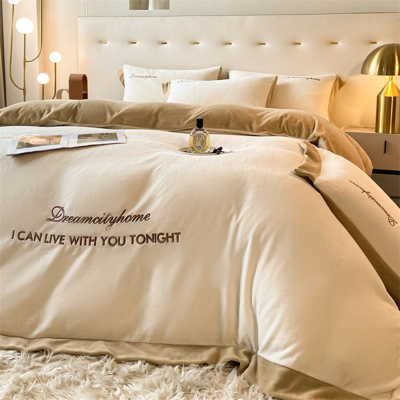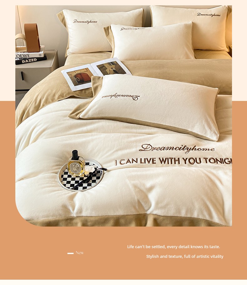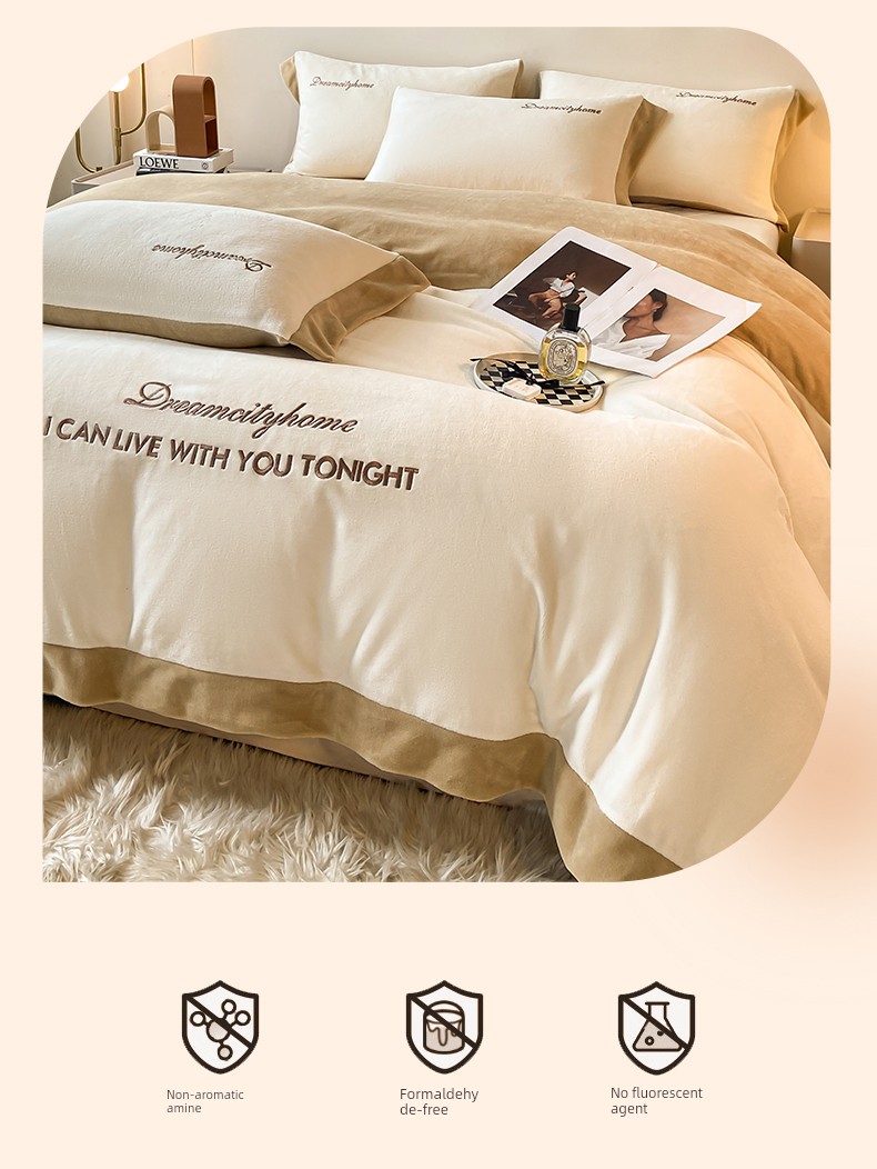Milk Fiber Four-Piece Bedding Set Accessible Luxury Fancy 2025 New Arrival Coral Fleece Embroider Single Fitted Sheet Quilt Cover
