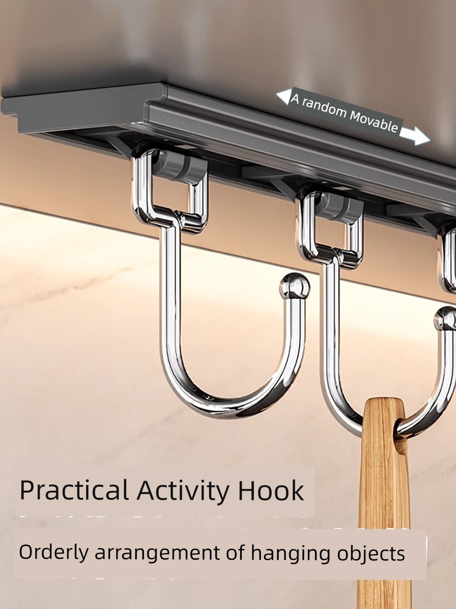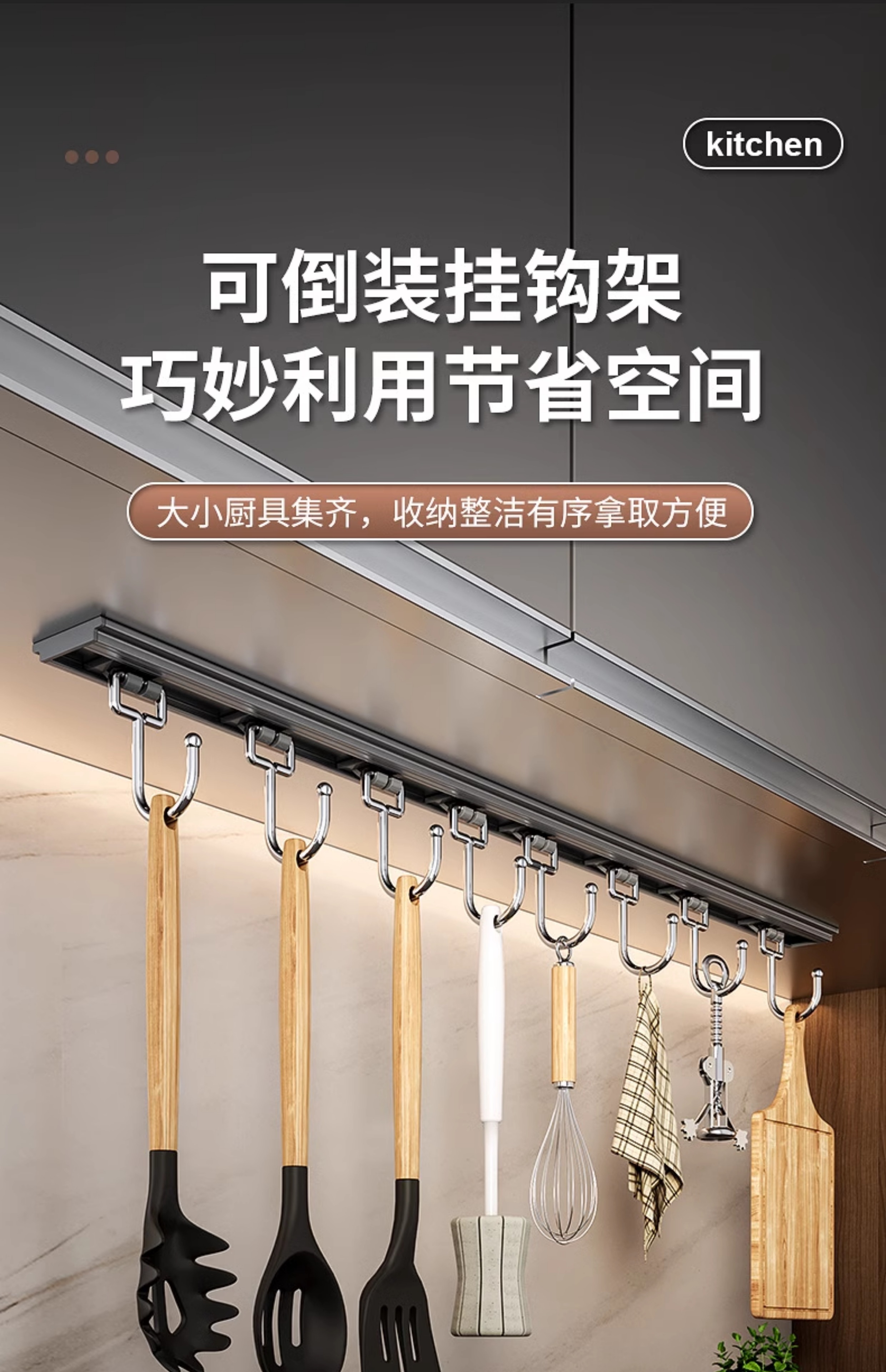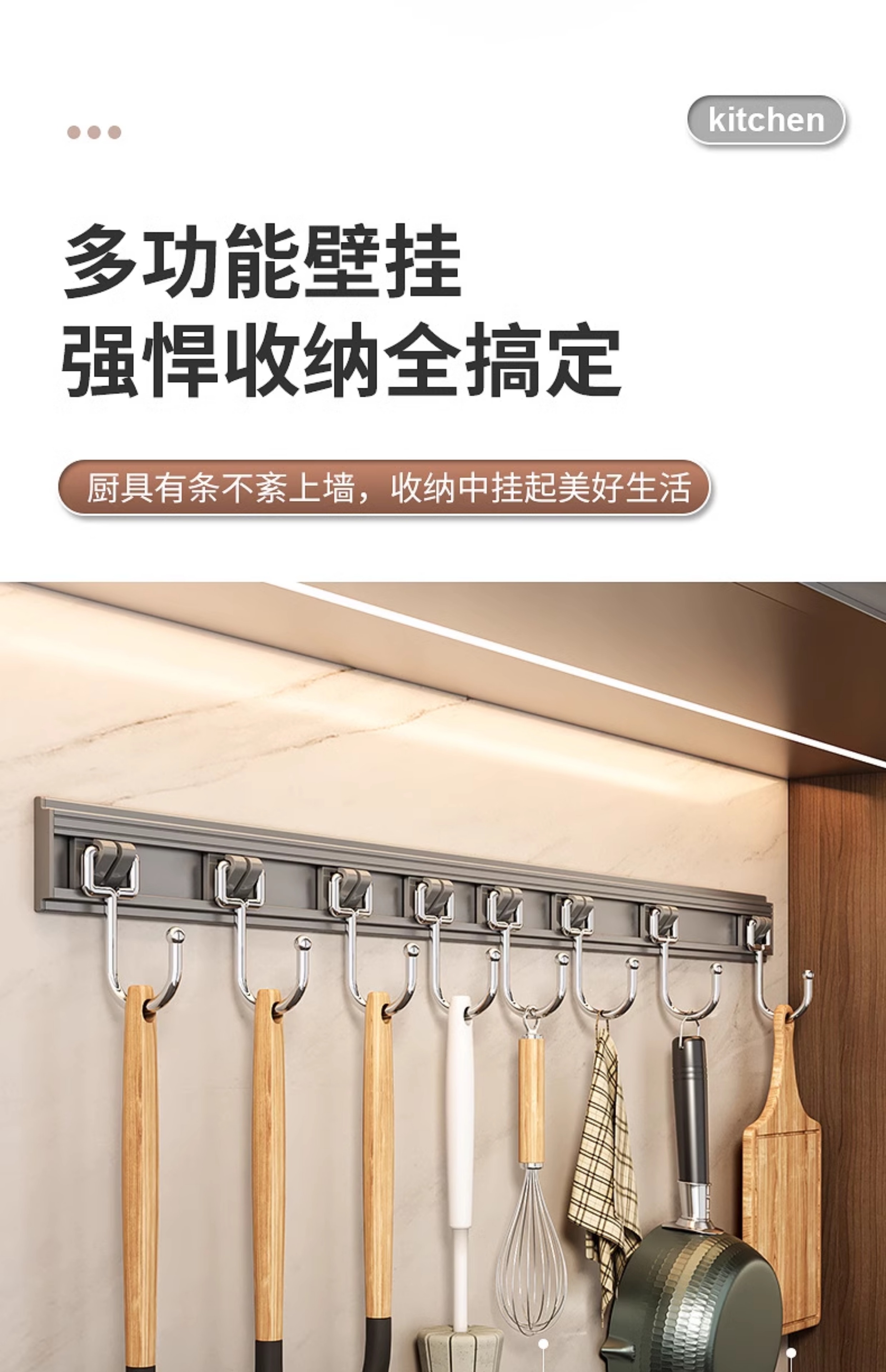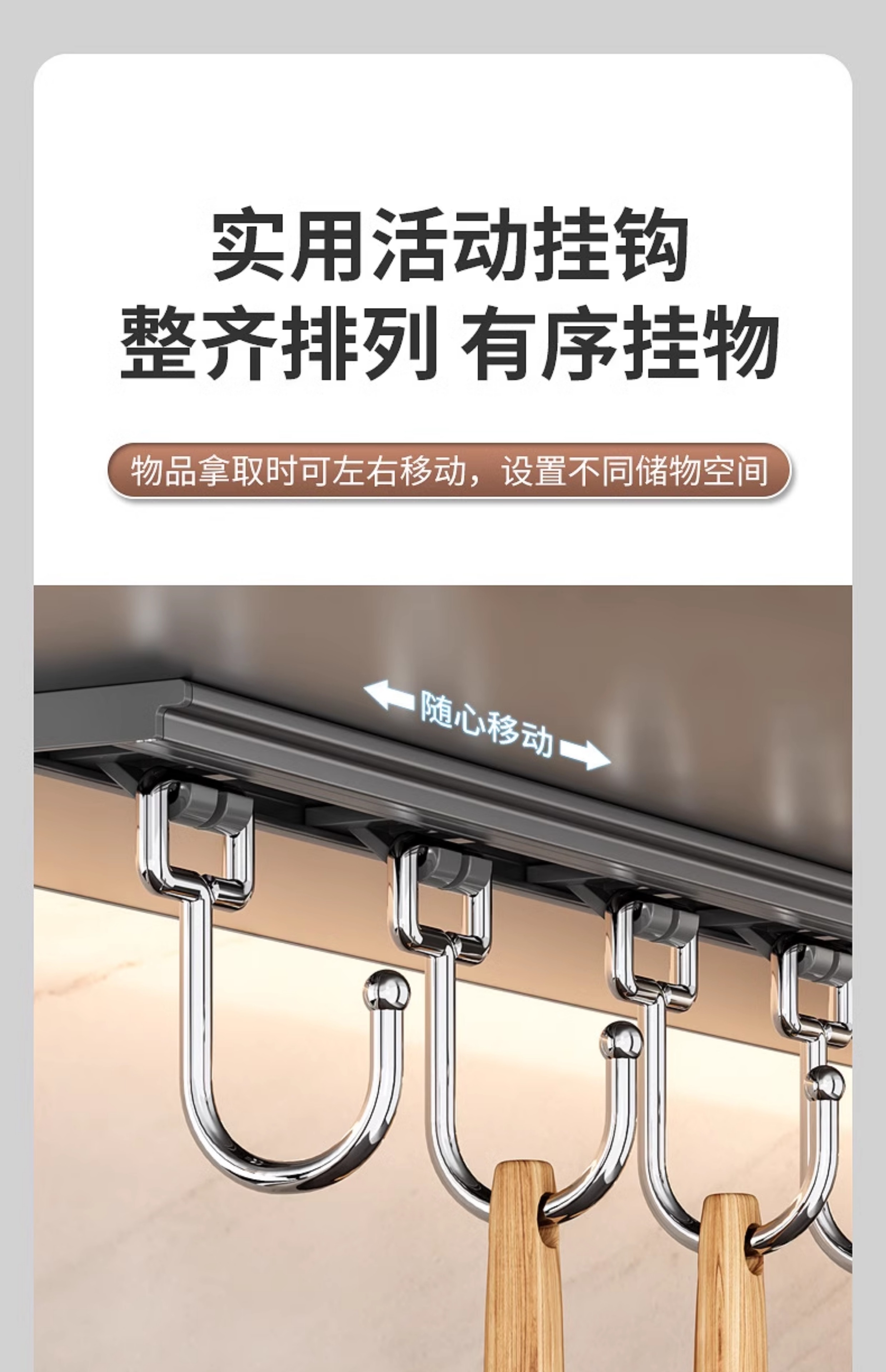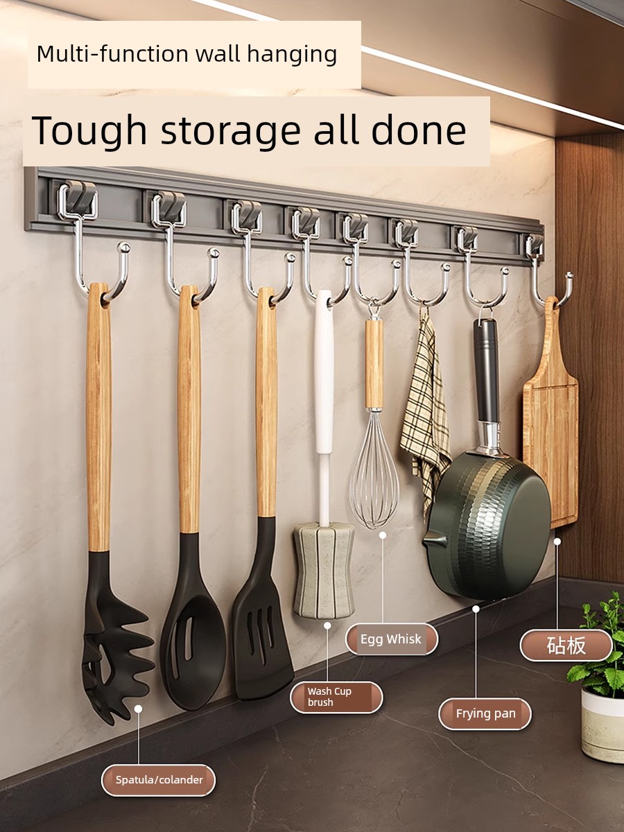 Multi-Functional Movable Rack Punch-Free Kitchen Hook Rack Hanging Rod Wall-Mounted Alumimum Kitchenware Rack Storage Rack