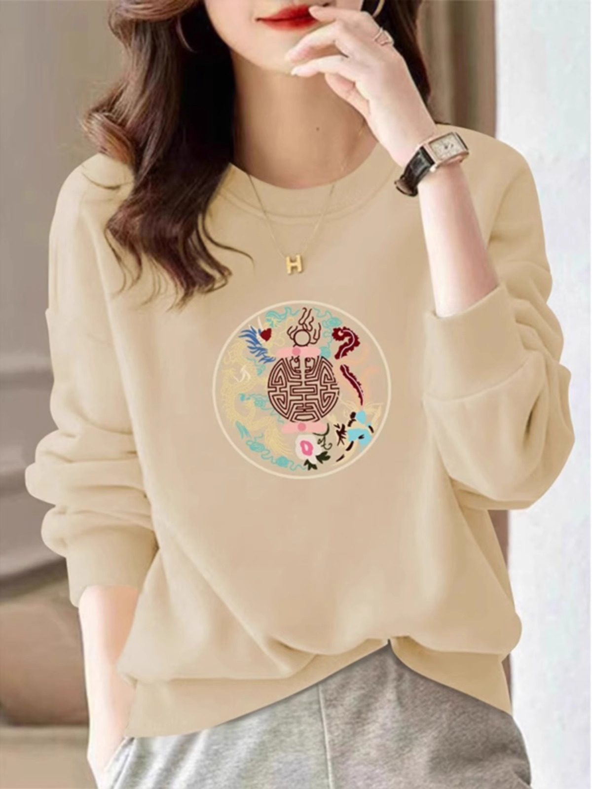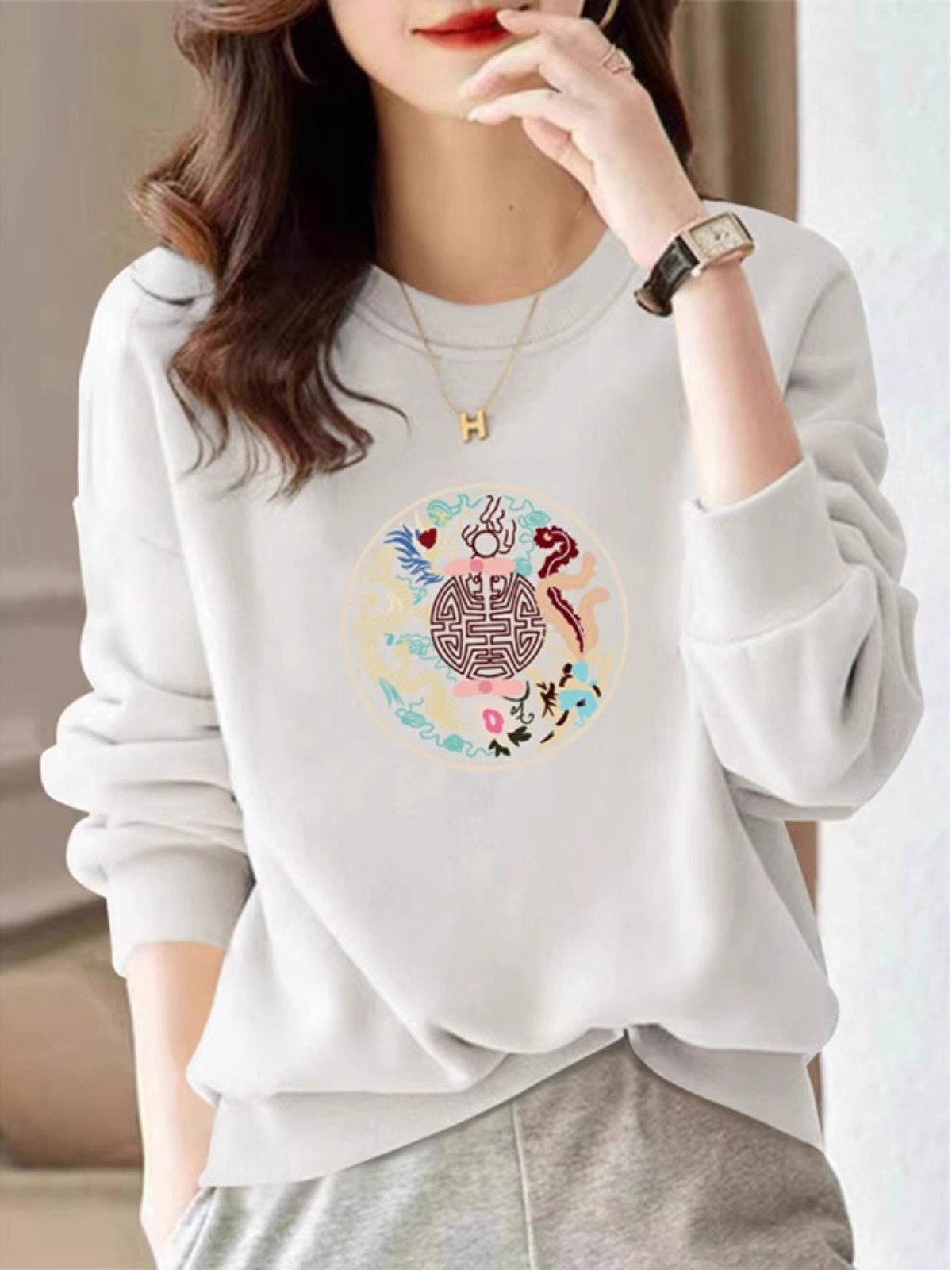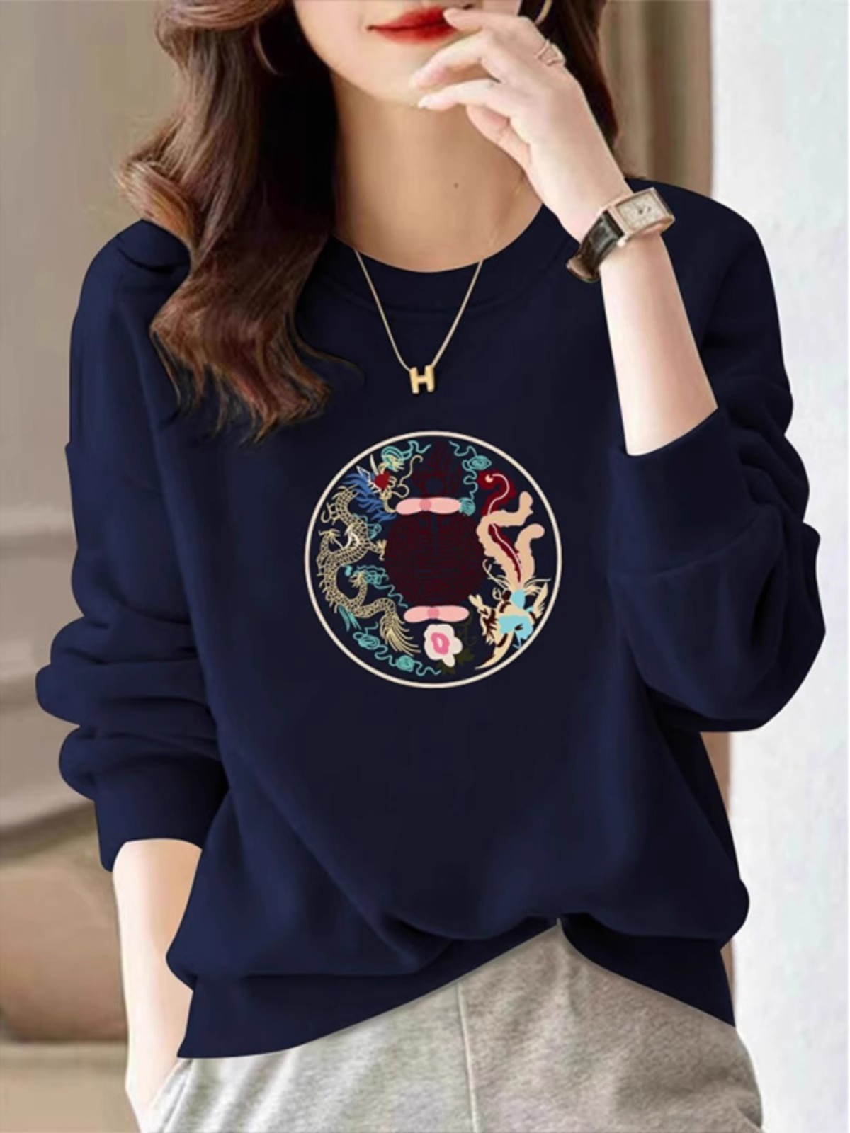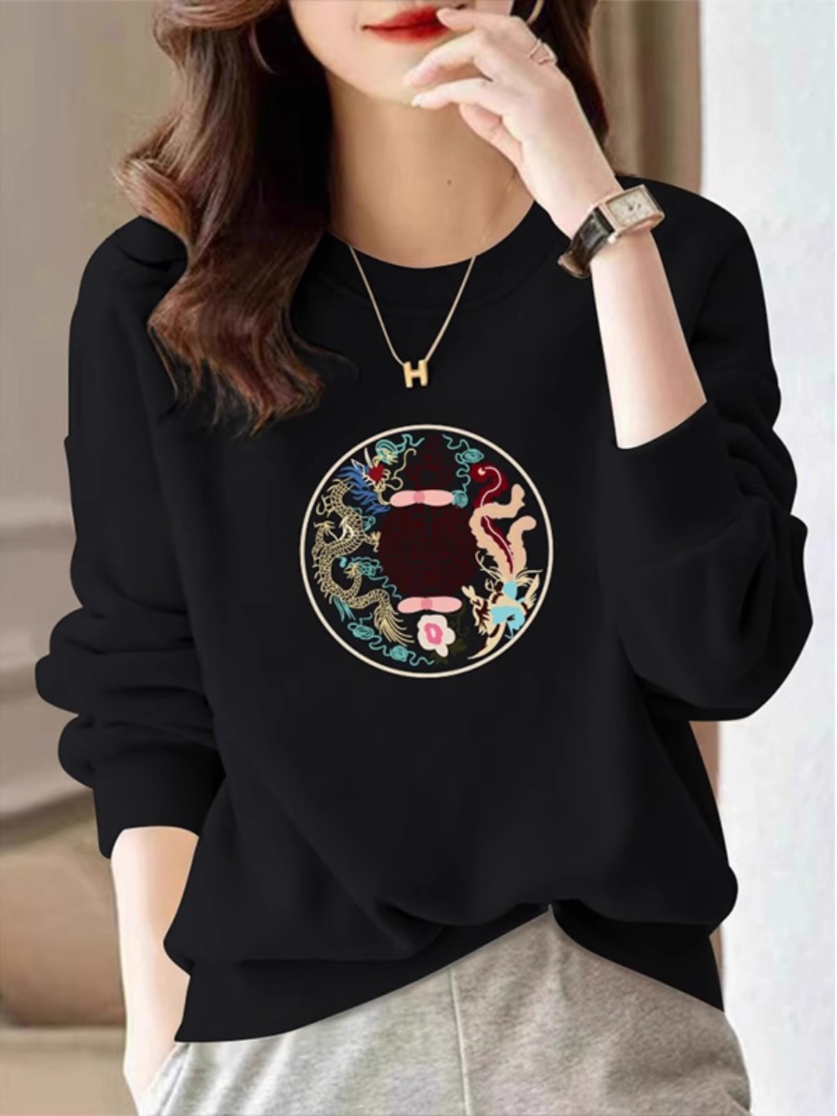 New Chinese Style National Style Printed Crew Neck Sweatshirt Women's New Arrival Loose Fashion Versatile Velvet Padded Thickened Top 2024