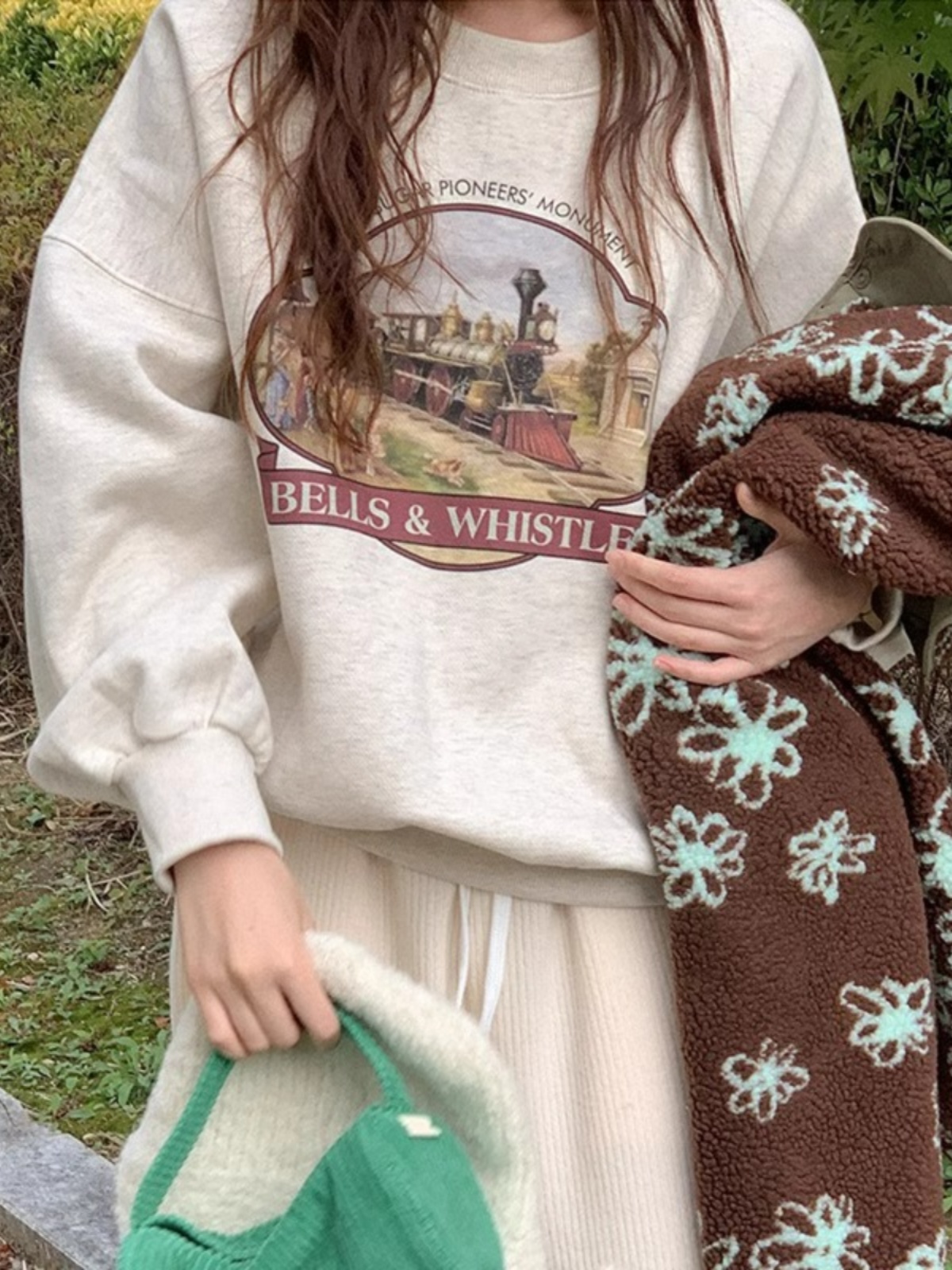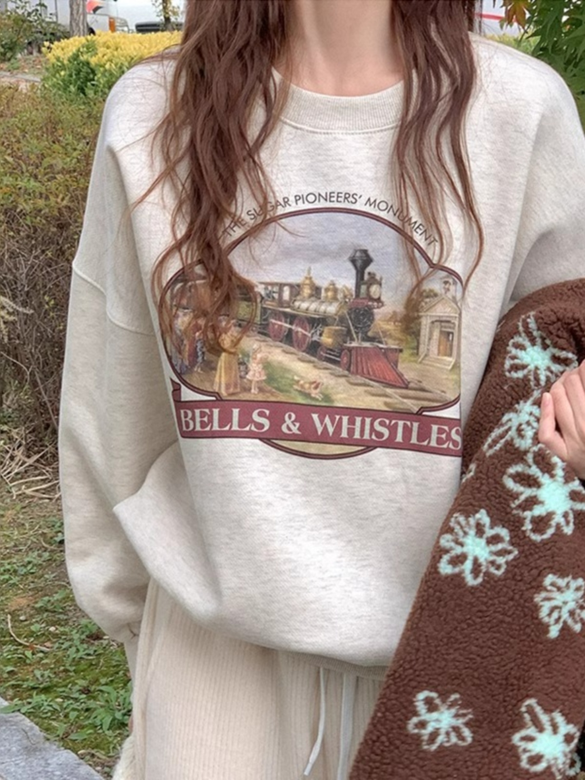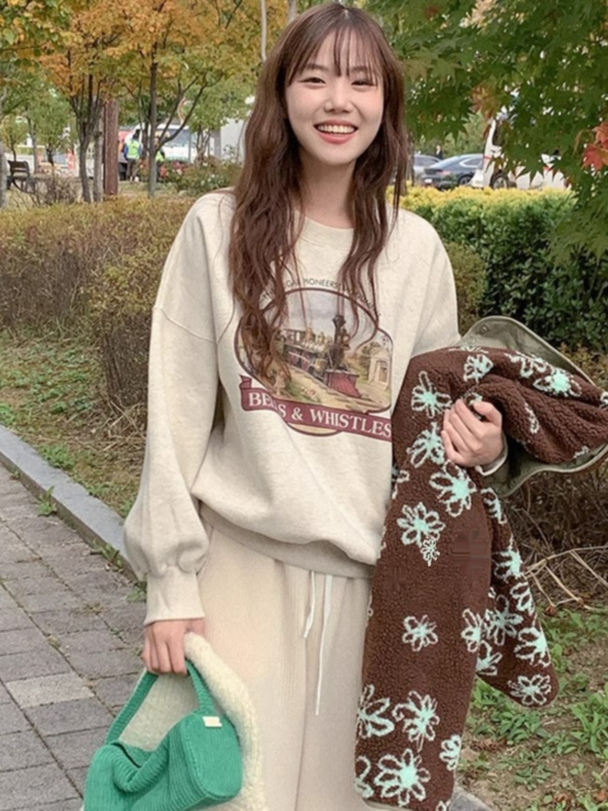 Oatmeal Color round Neck Sweatshirt Female Spring & Fall Stylish Alphabet plus Velvet Small American Retro Loose Pullover Top