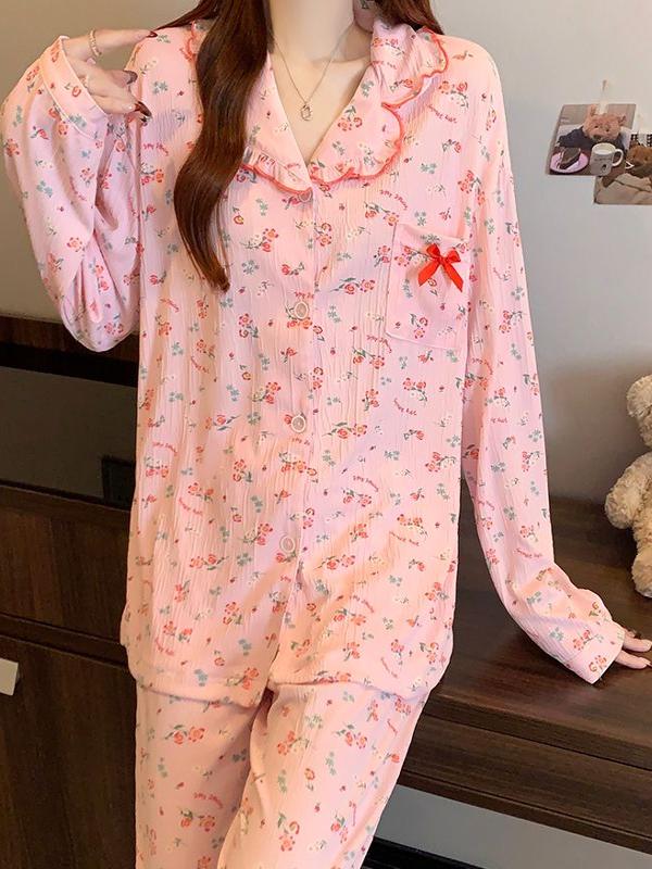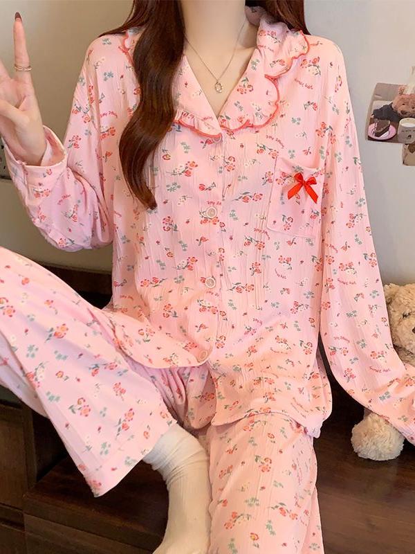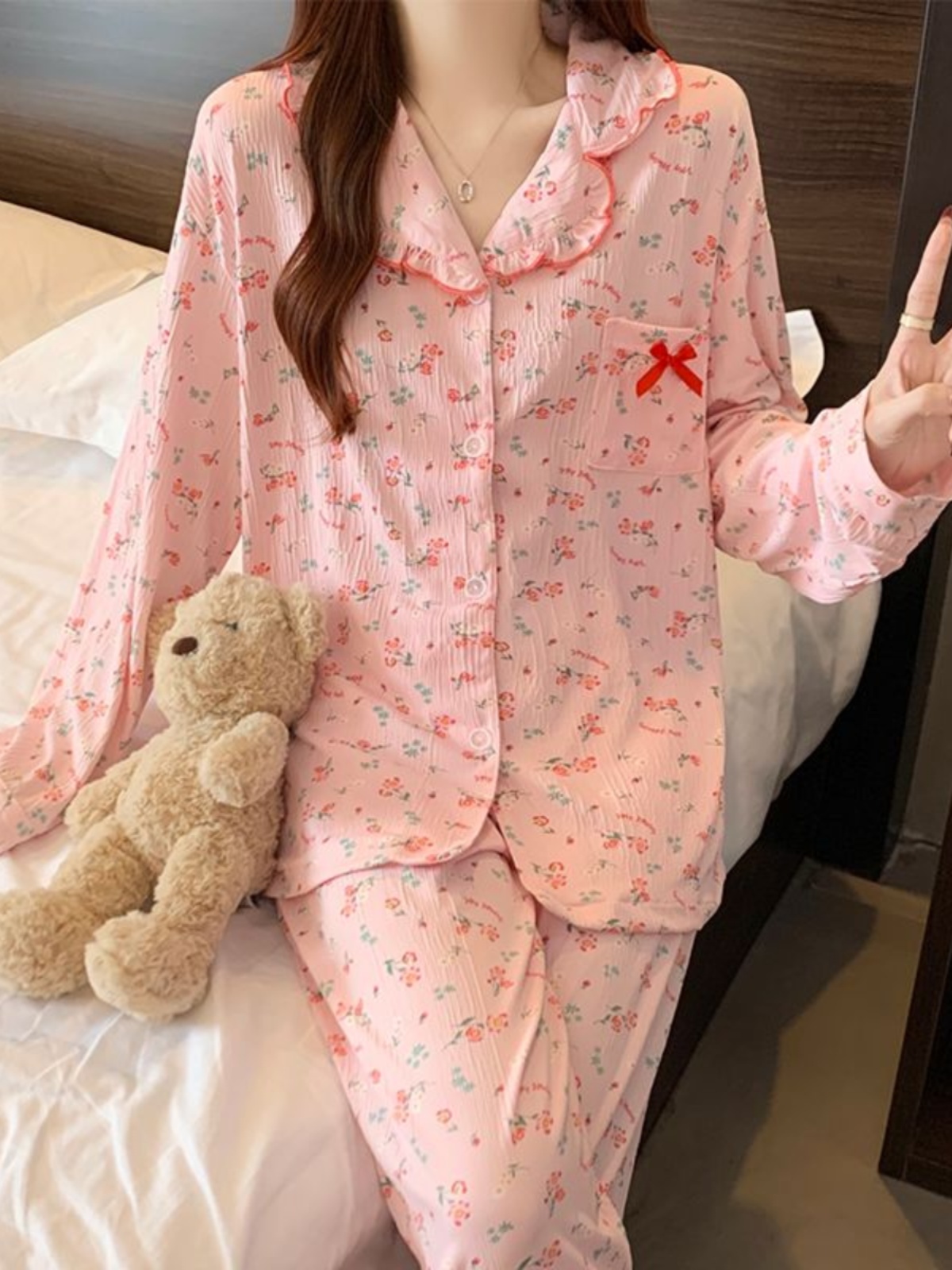 Pajamas 2025 Spring and Autumn Cartoon Plaid Soft Glutinous Zou Cloth Cardigan Women's Fresh Floral Casual Suit Homewear