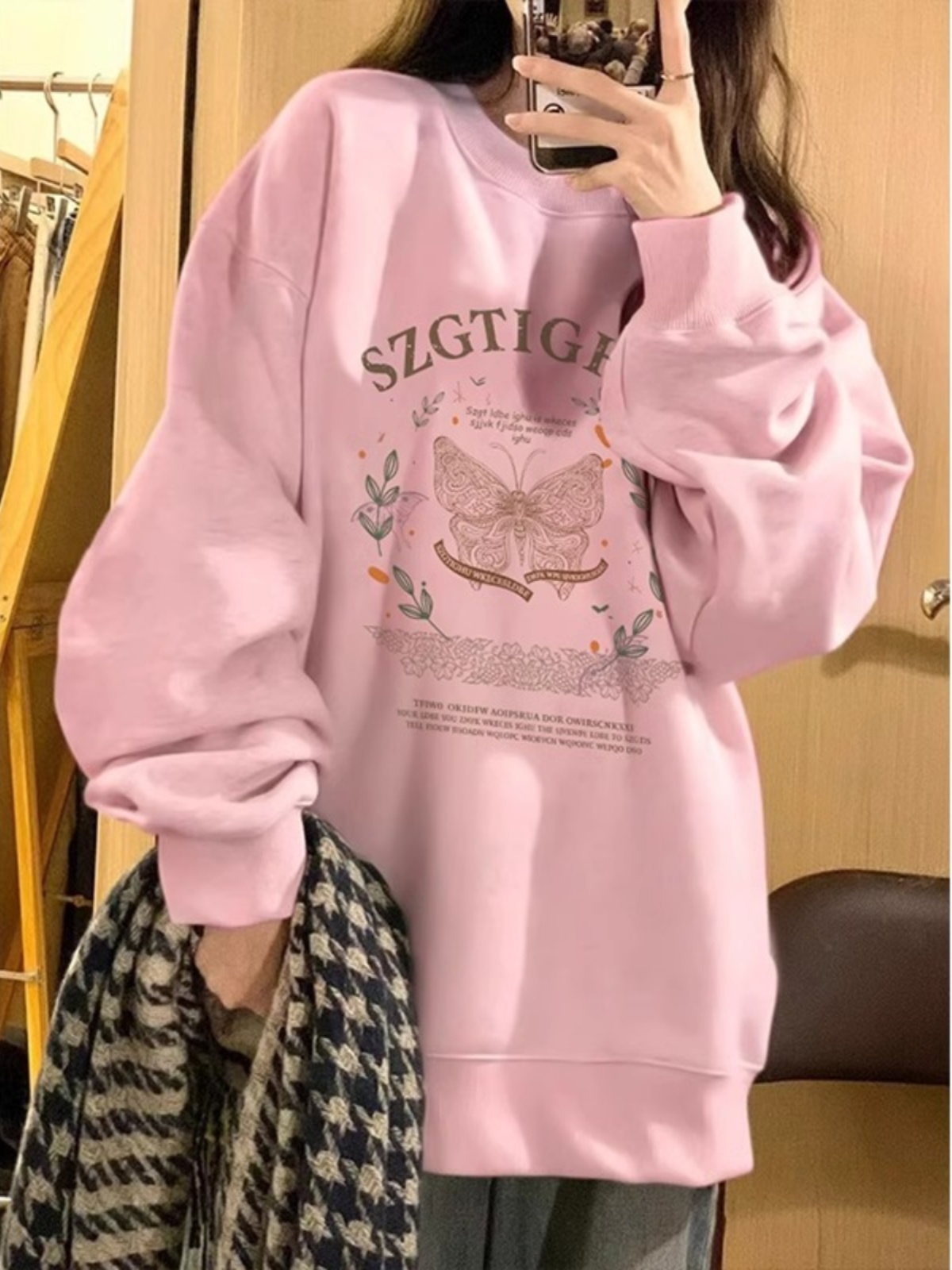 Pink round Neck Hoodie Women Spring and Autumn Thin Oversize Small Loose Idle Style Hoodless Top Design Sense