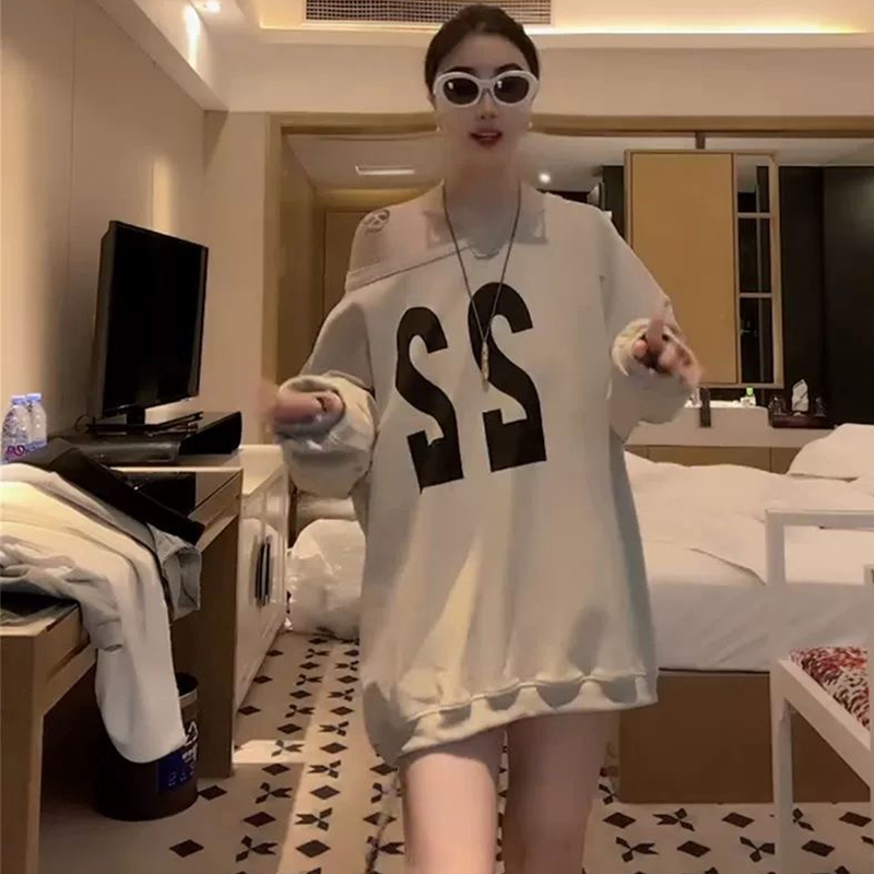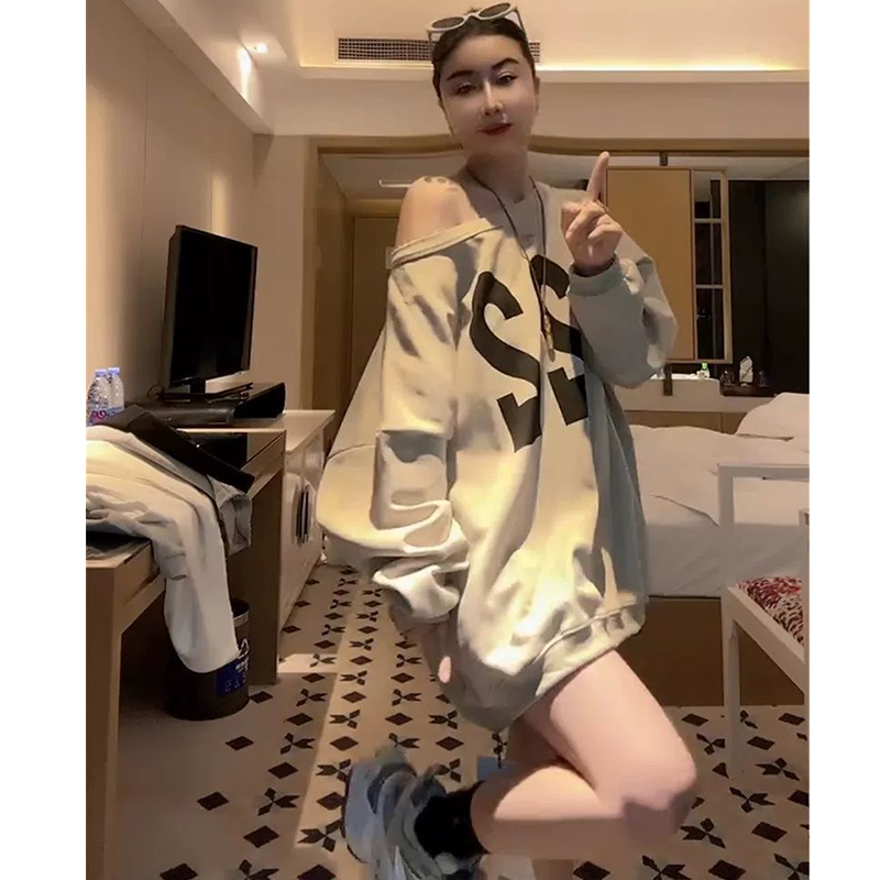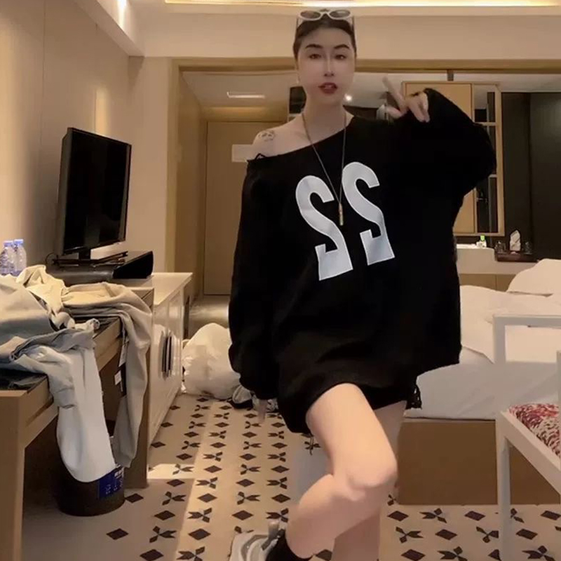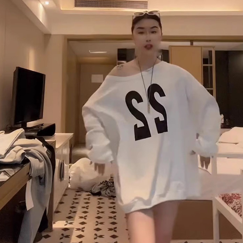 Plus Size Ladies Plus Size 1.00 Kg-150.00 kg Casual off-Shoulder Sweater Female New Arrival Loose Digital Print Mid Length Long Length Oblique Shoulder Tops