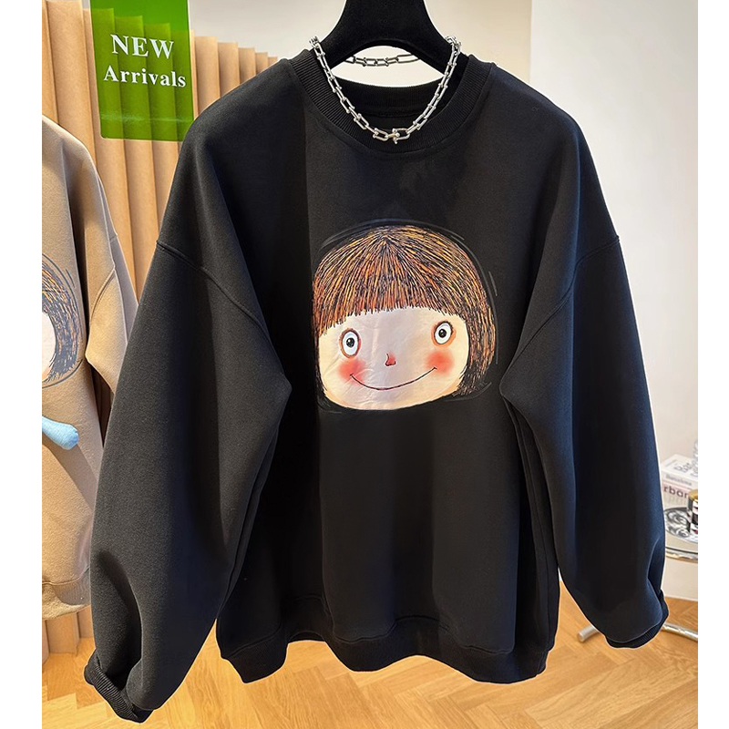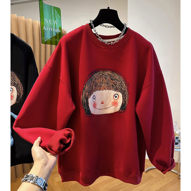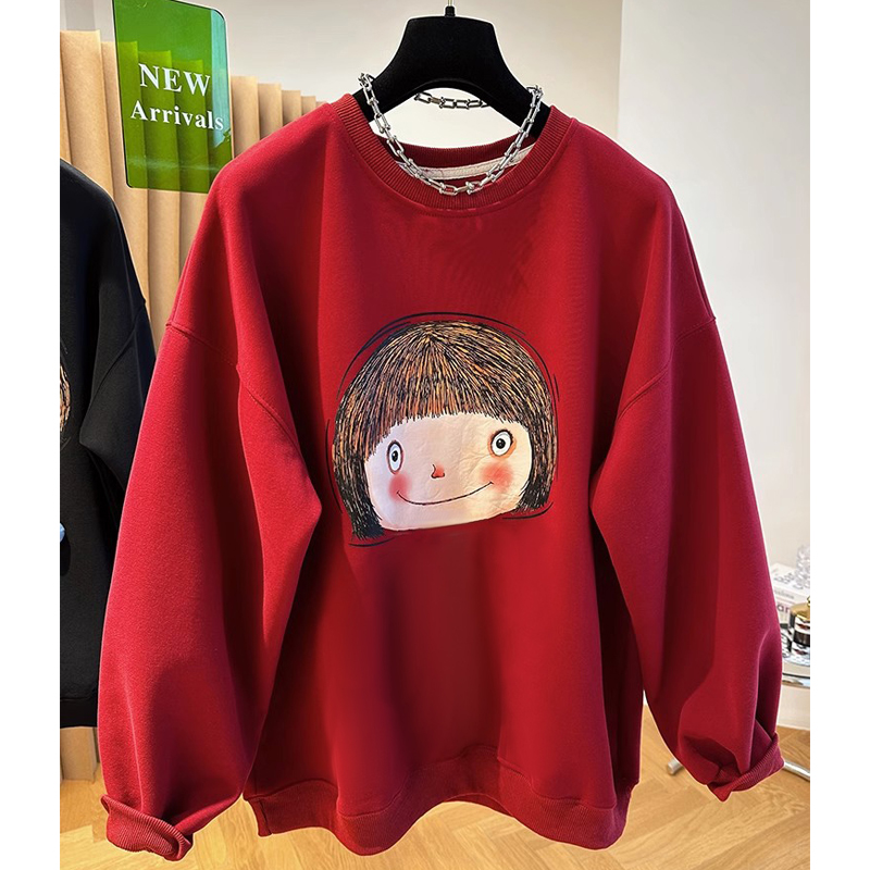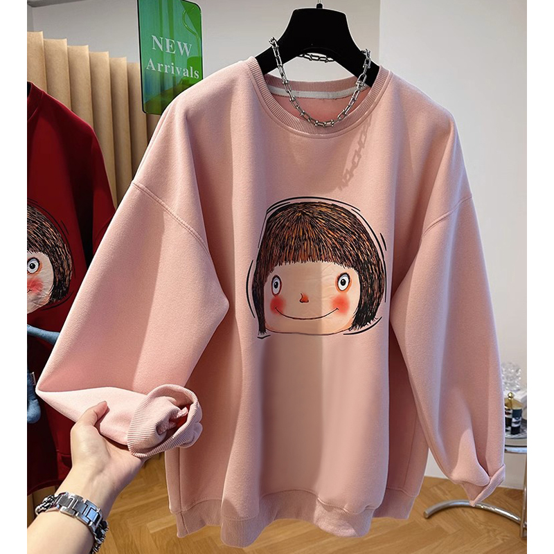 Plus Size Ladies Plus Size 100.00kg Fleece-lined Thin Sweatshirt Women's Loose Fall and Winter K-style Fashion All-Matching round Neck Pullover Top