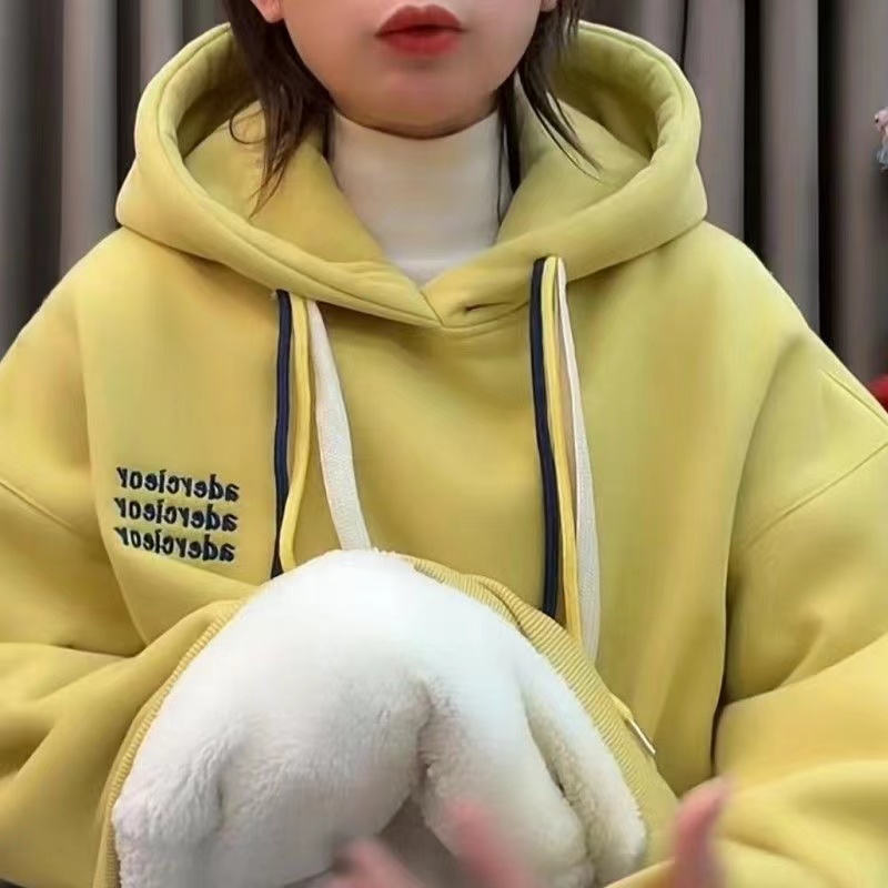 Plus Size Ladies Plus Size Velvet Padded Thickened Sweater Women's Winter New Arrival Fashion All-Match Three Rows Embroider Letter Hooded Outwear Women