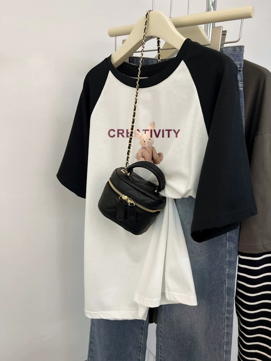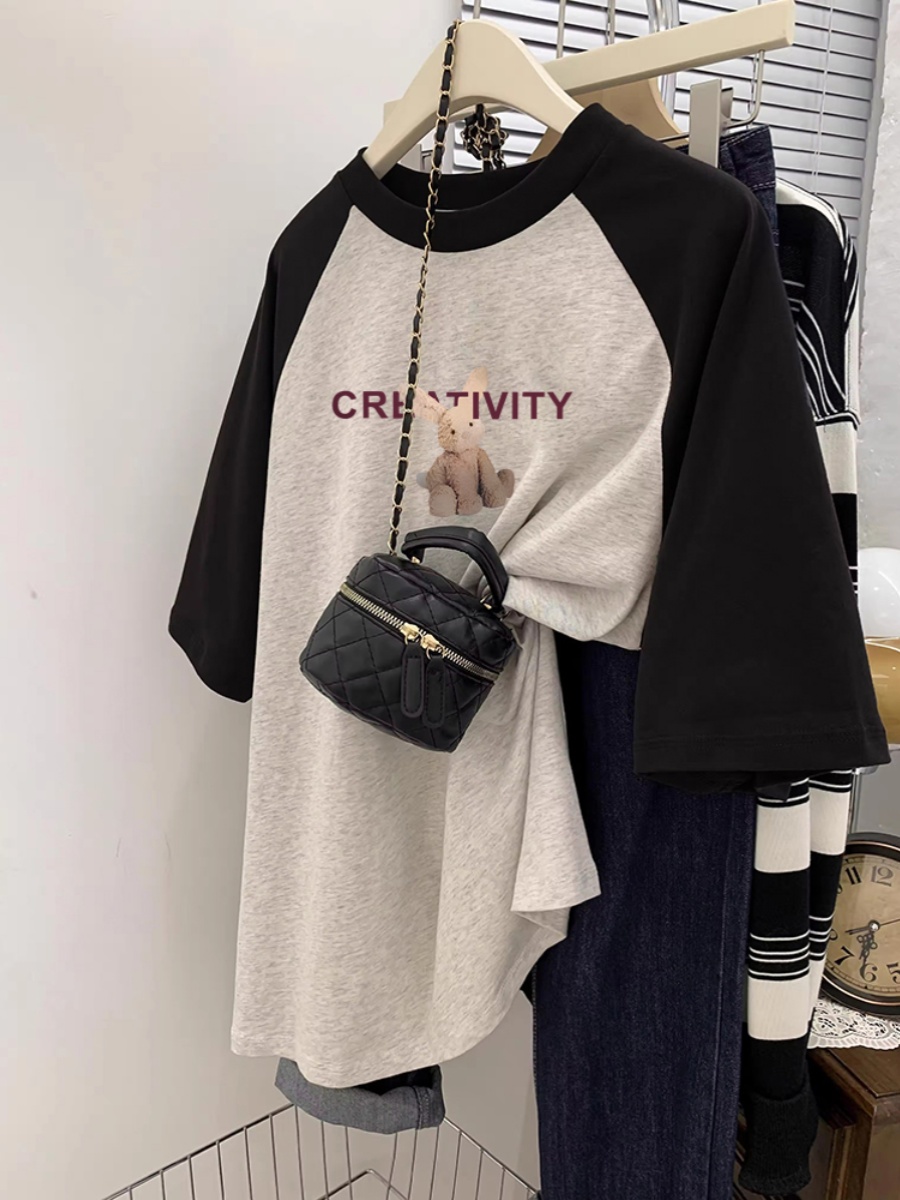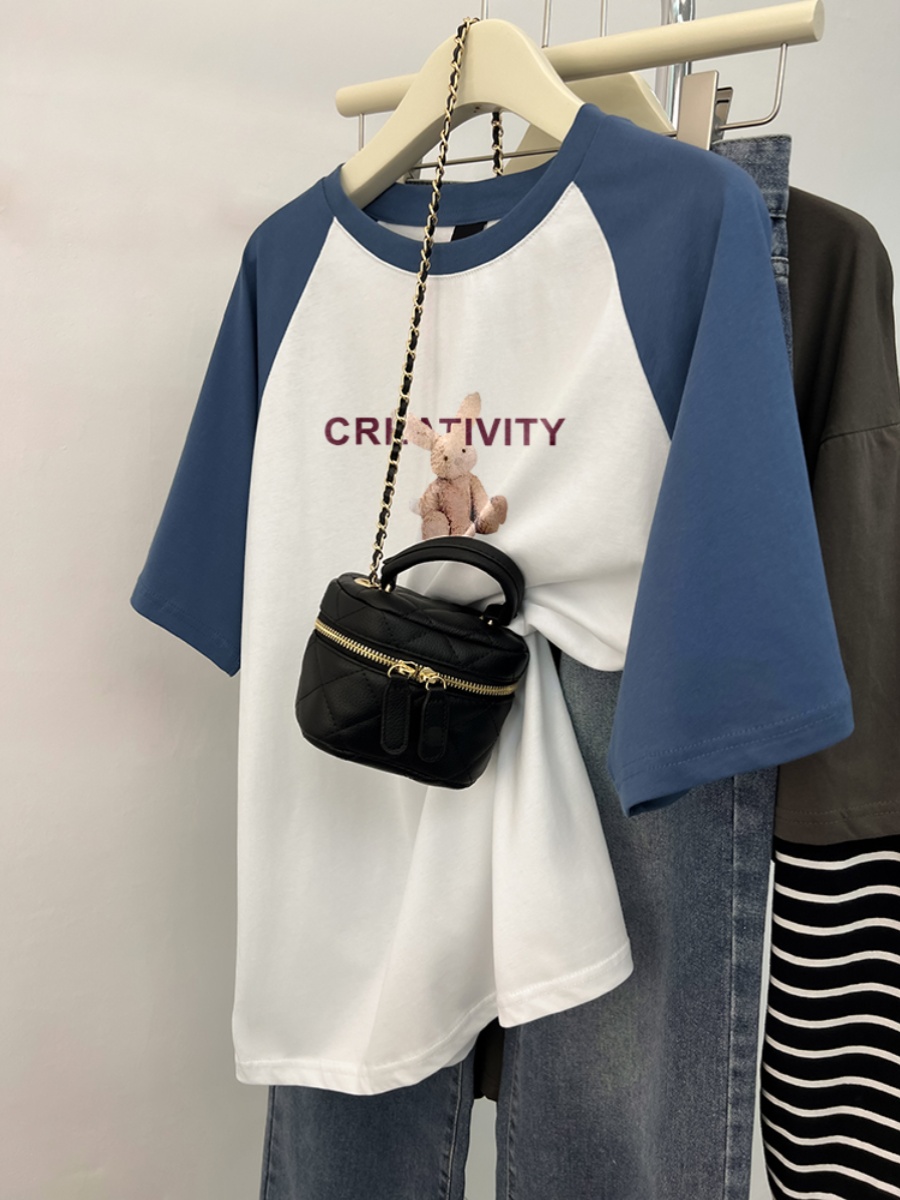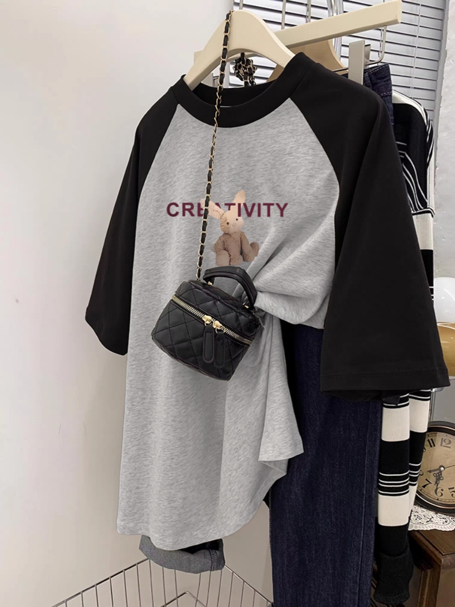 Plus Size Ladies Pure Cotton Short Sleeve T-Shirt Women's Summer Loose Slim Looking Plus Size Niche Design Contrast Color Raglan T-shirt Top