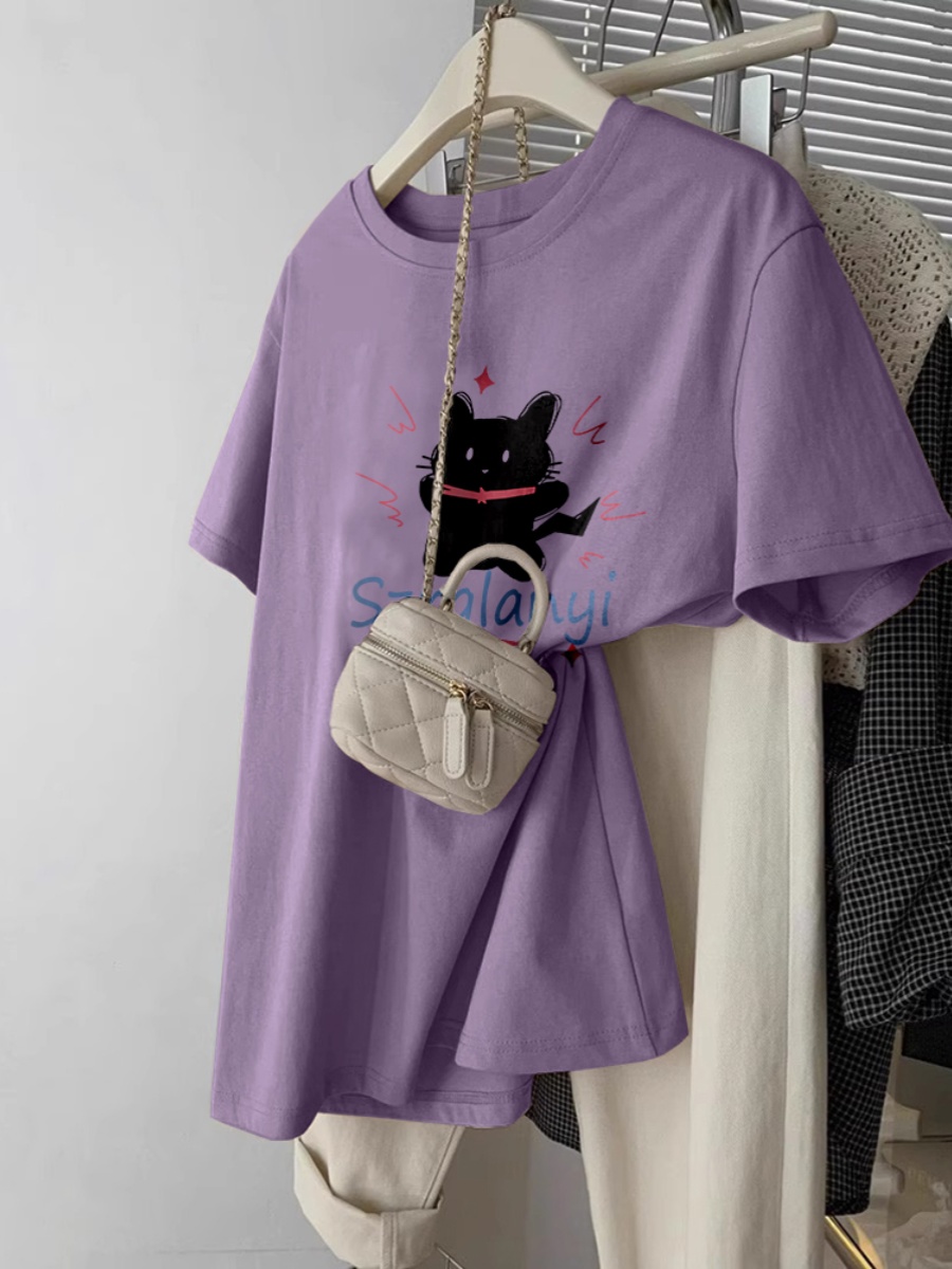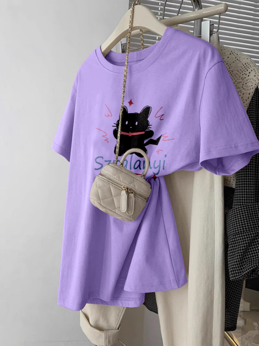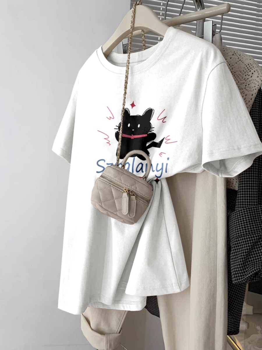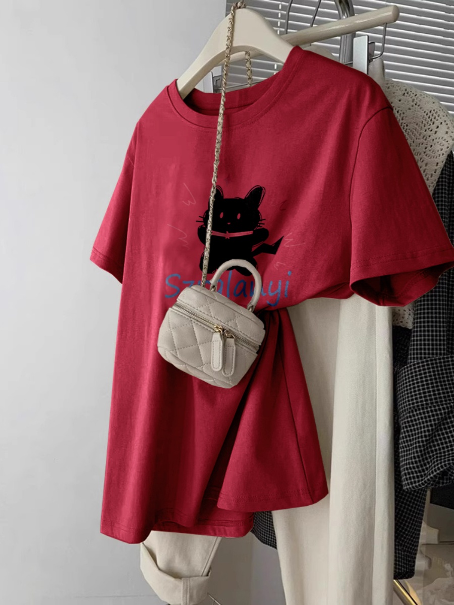 Plus Size Loose Slim Looking 100.00kg Plus Size Ladies Short-Sleeved T-shirt Women's Summer American Retro Stylish Pure Cotton Top T-shirt